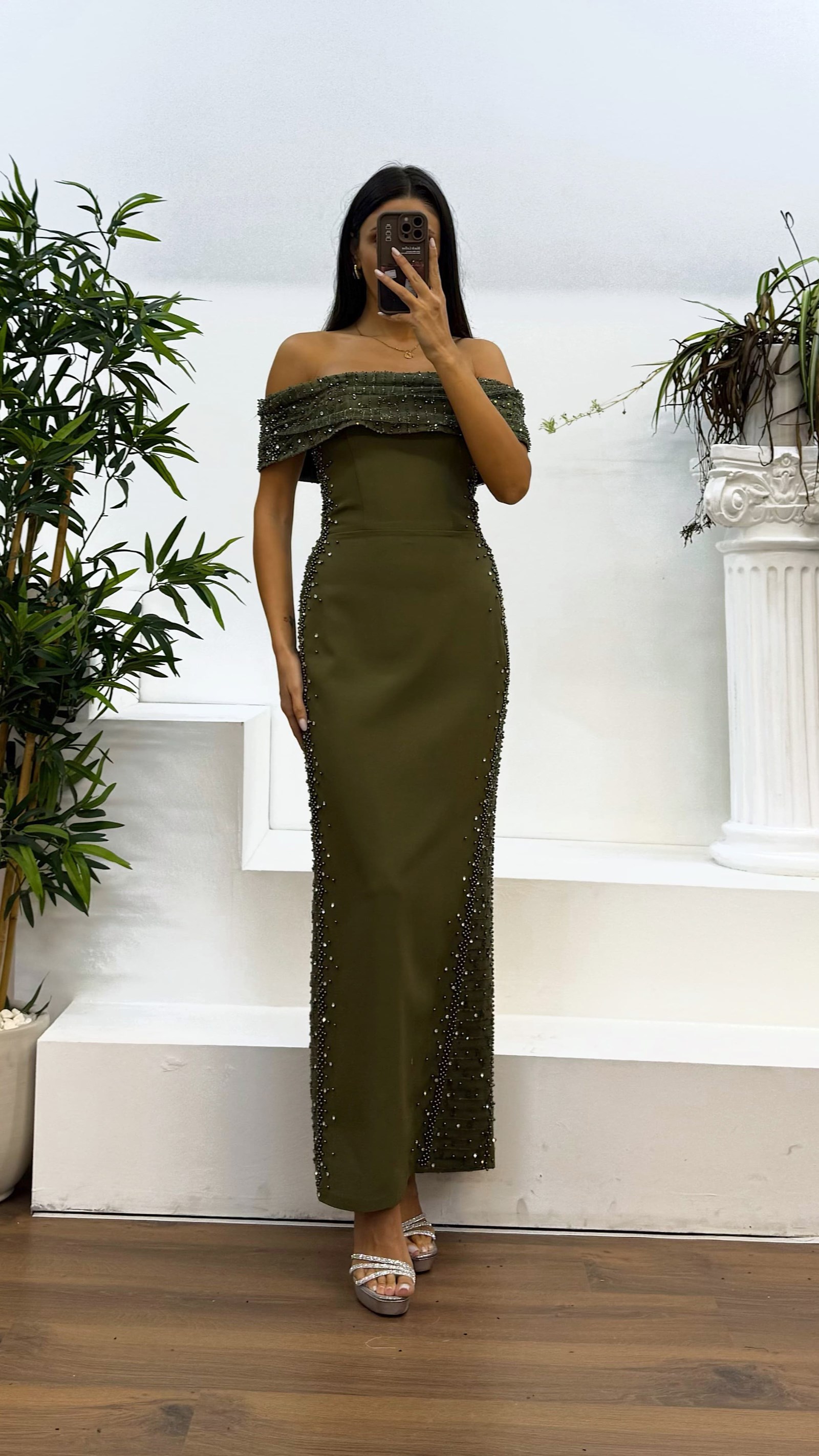 • Hakı Kayık Yaka İşlemeli Abiye Elbise