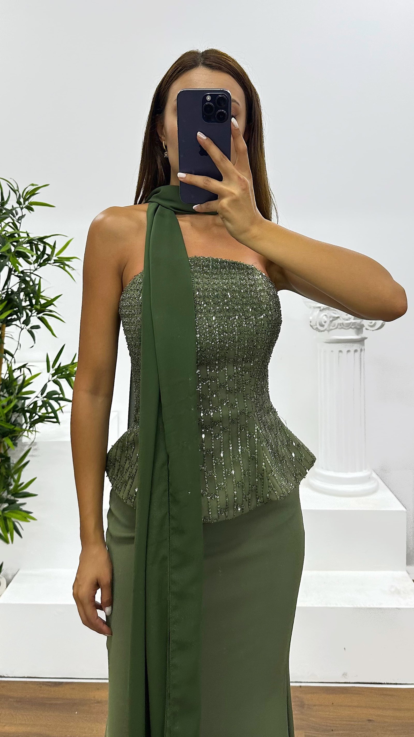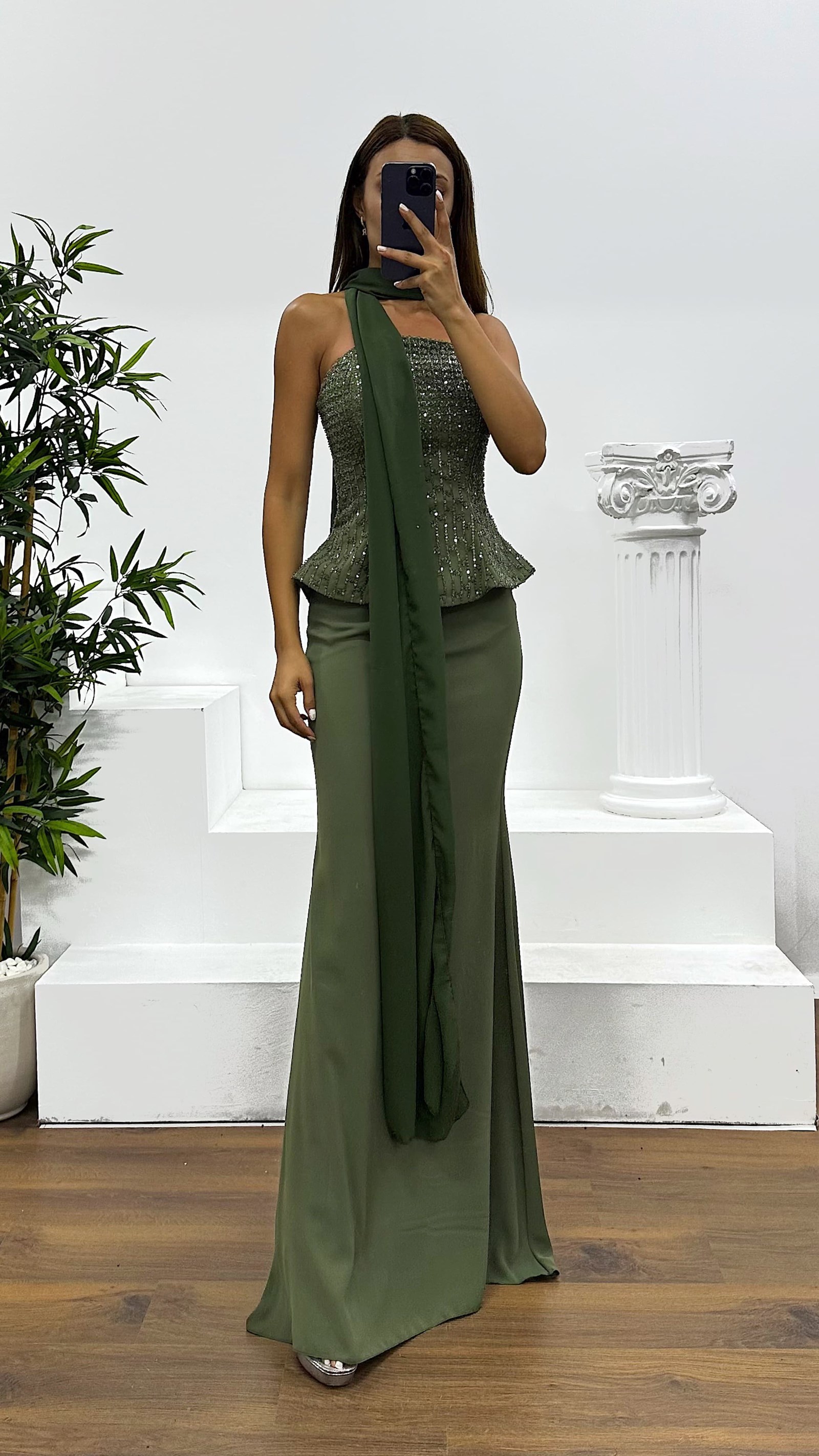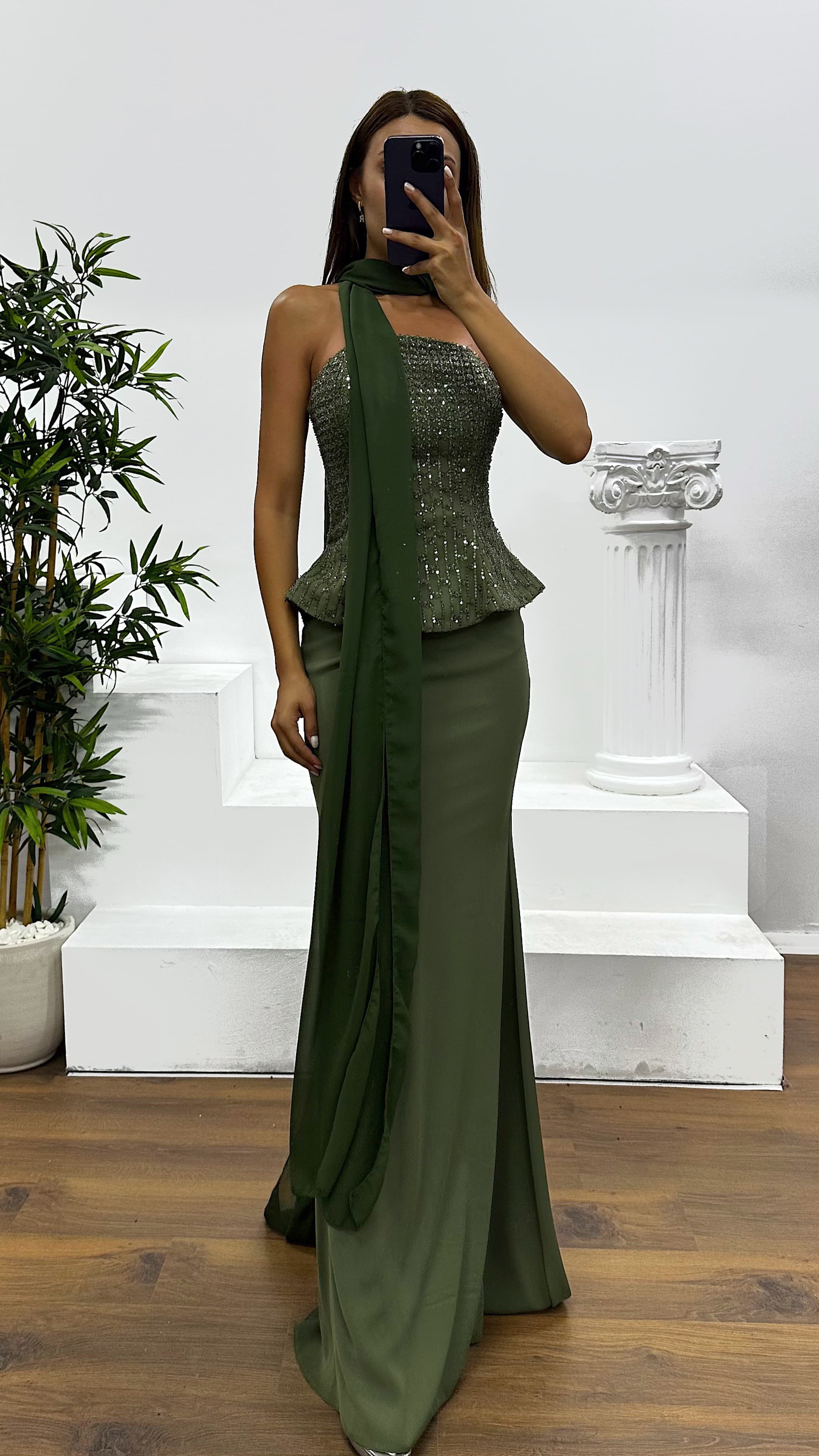 Strapless embroidered evening dress The product is designed to fit sizes 36-44, with built-in cups, lining, shawl detail, and embroidered embellishments. Product length: May vary between 170-175 cm. Fabric type: Sequin, 100% polyester.