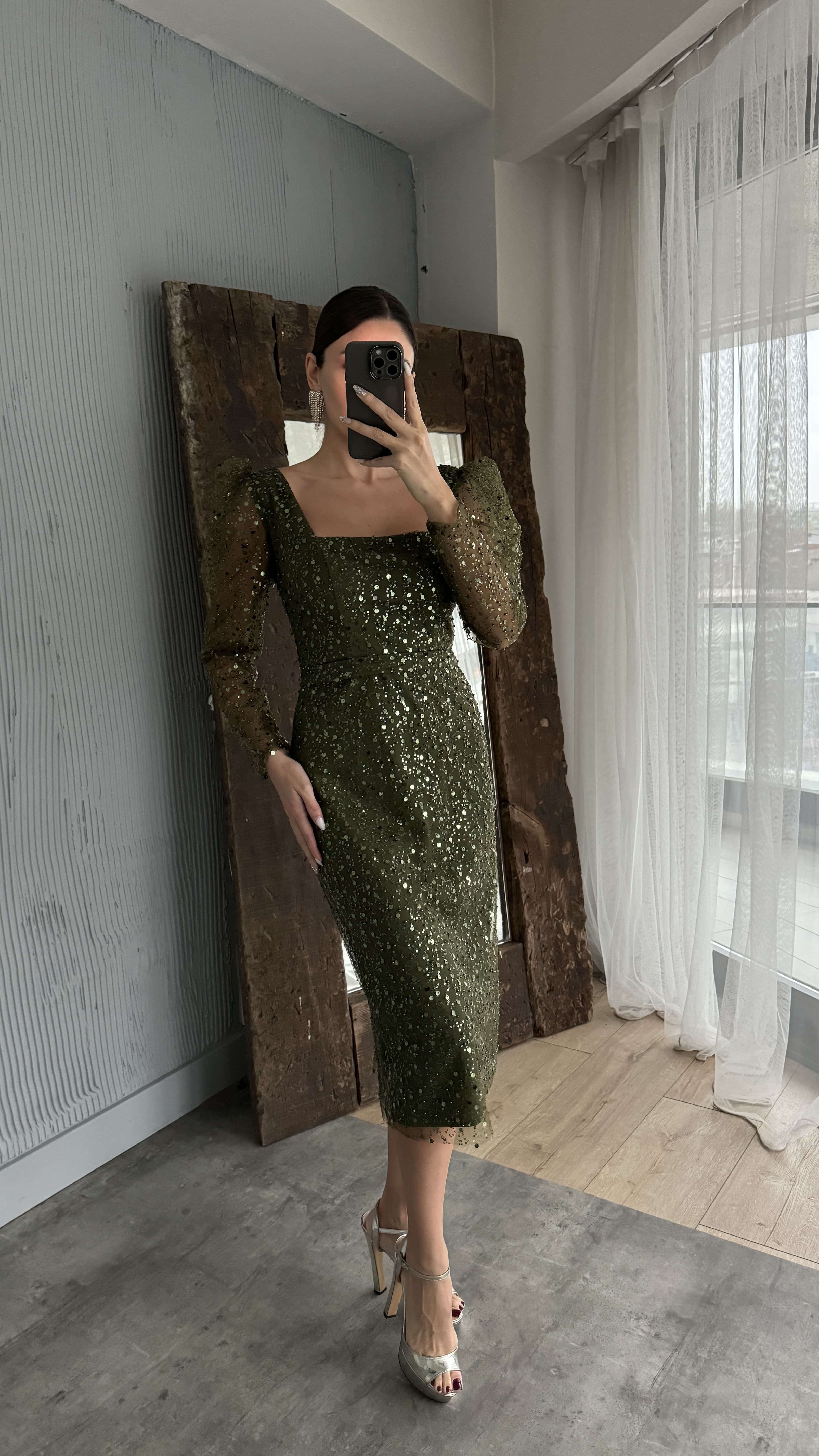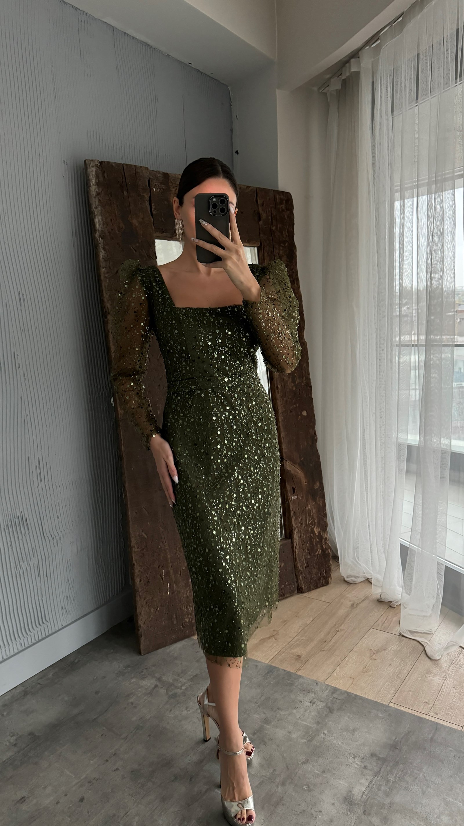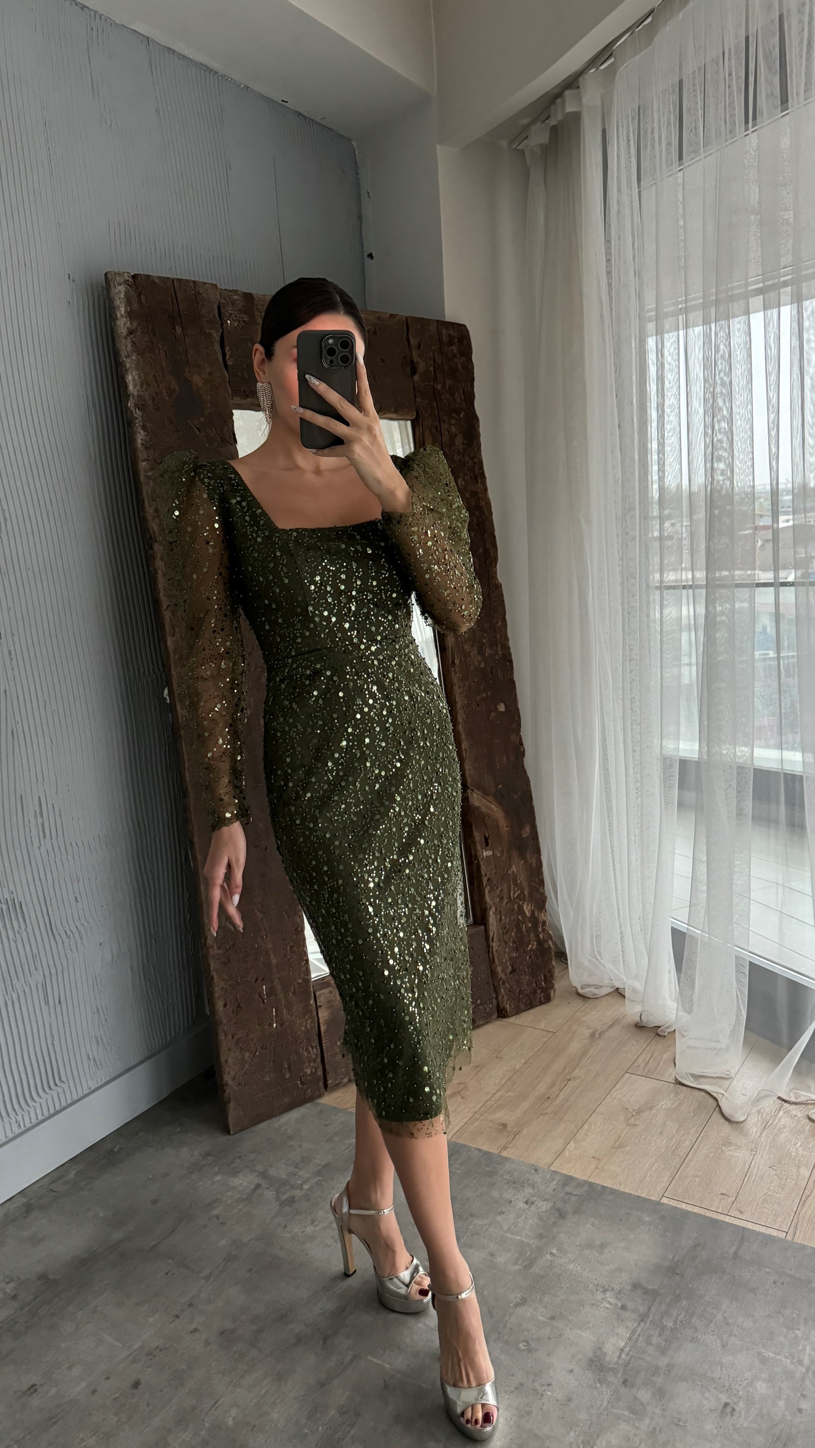 • Zümrüt Yeşili U Yaka İşlemeli Tasarım Midi Boy Elbise