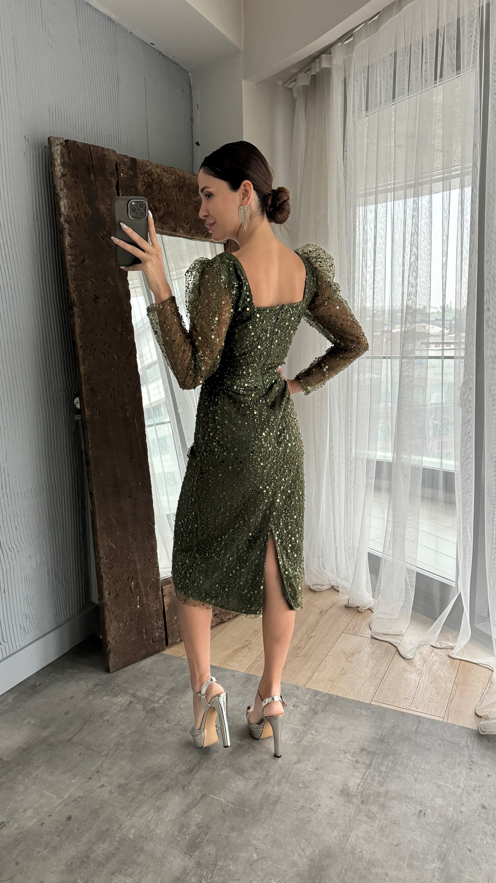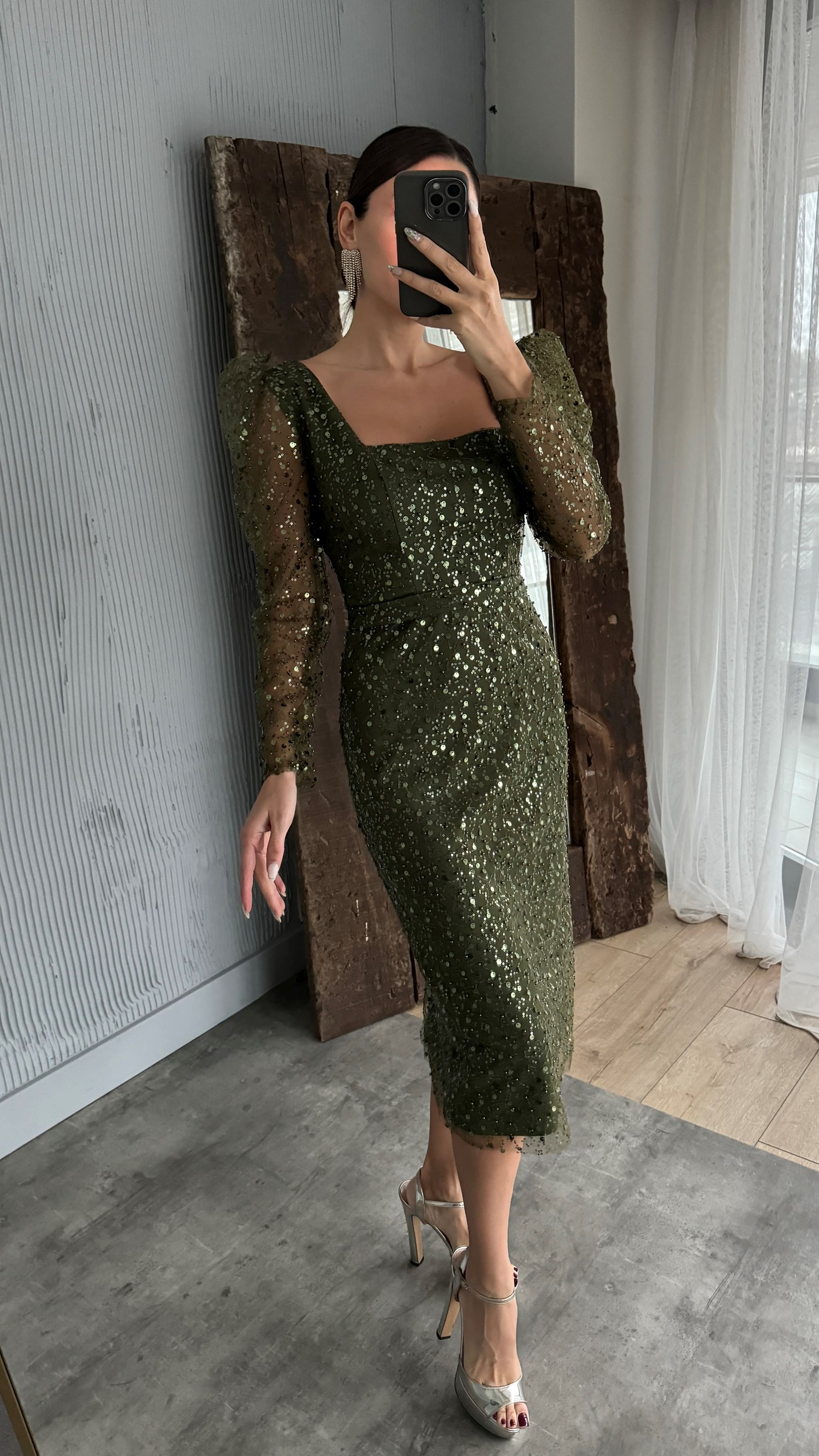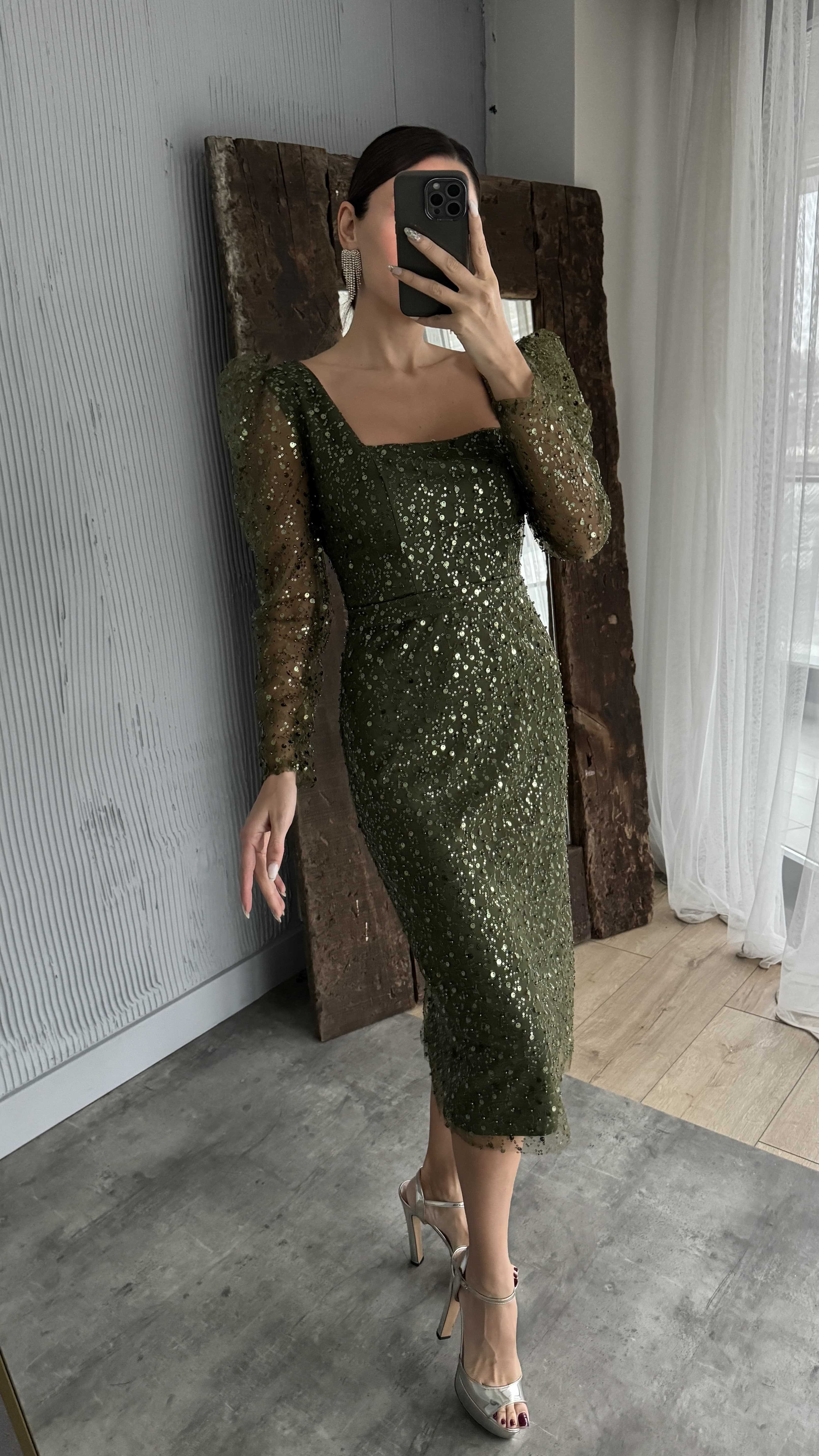 • Zümrüt Yeşili U Yaka İşlemeli Tasarım Midi Boy Elbise