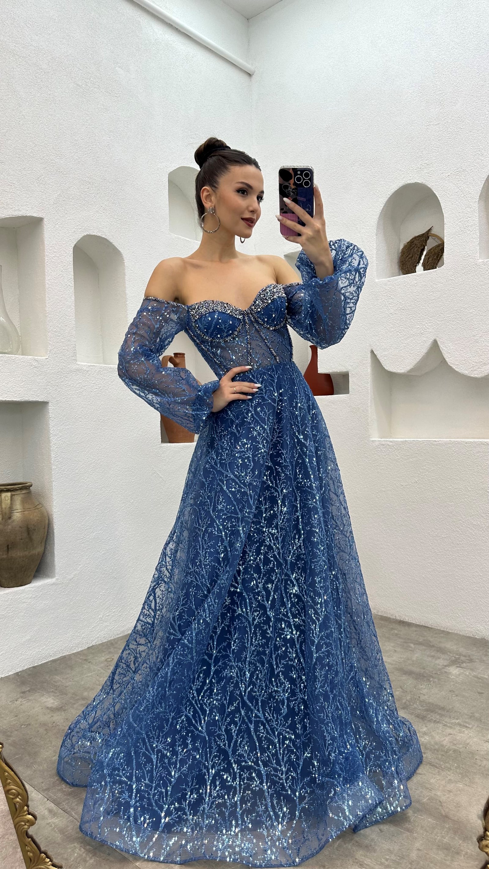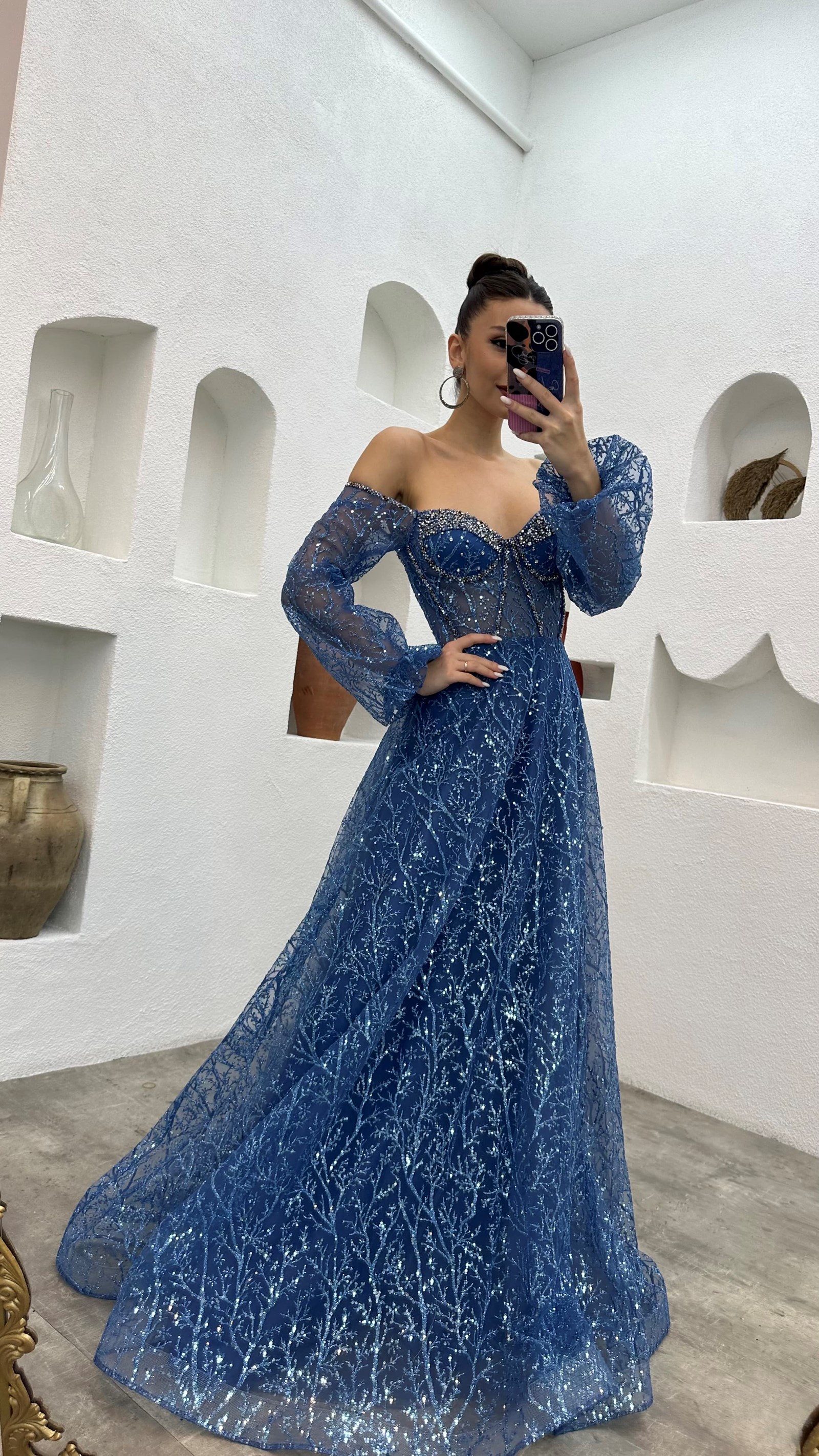 • İndigo İşlemeli Balon Kol Simli Tül Abiye Elbise