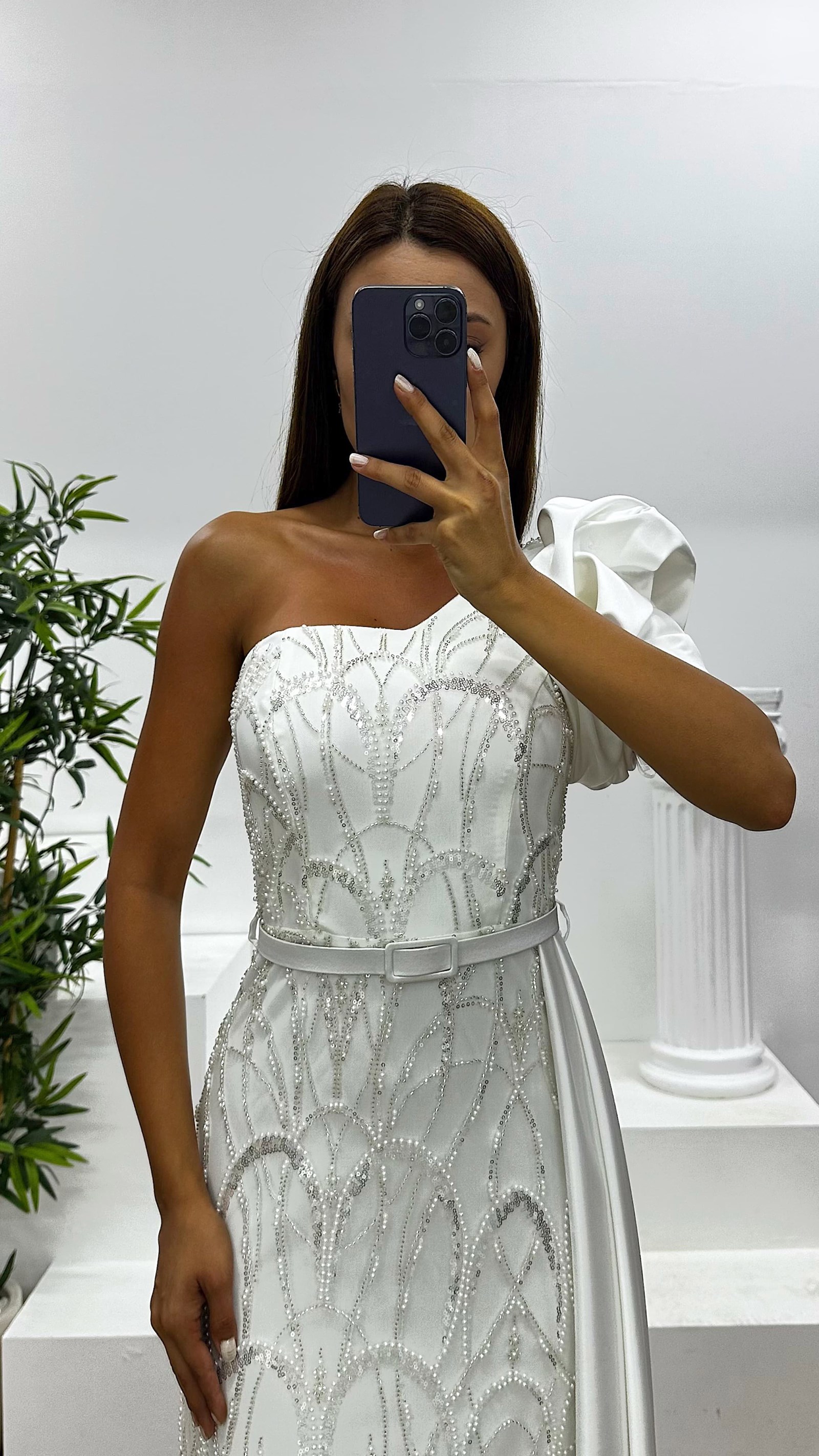 • Kemik Tek Omuz İşlemeli Abiye Elbise