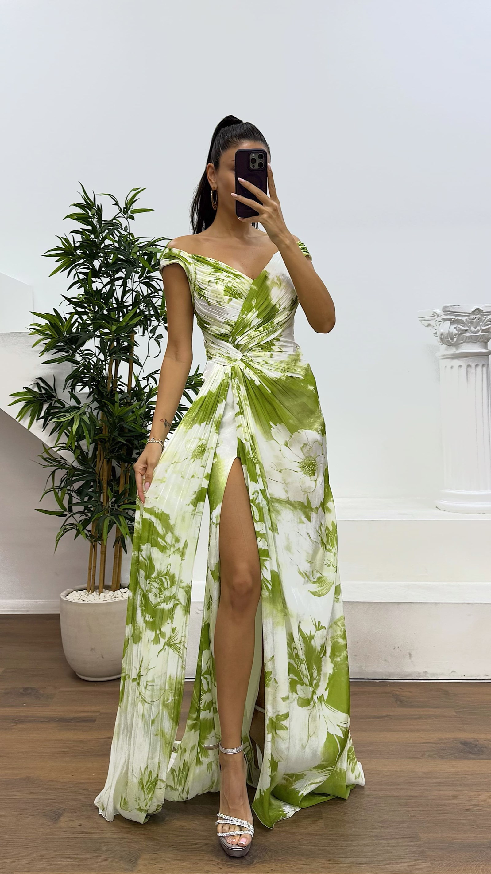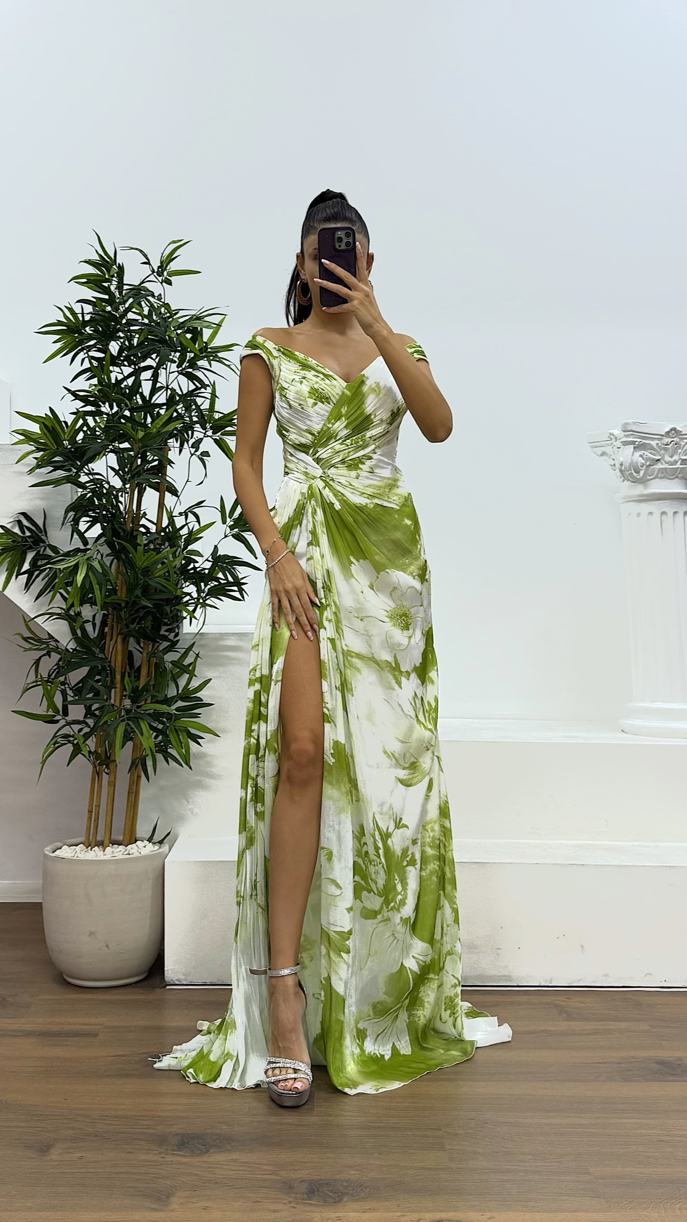 • Kemik Yeşil Askılı Desenli Abiye Elbise