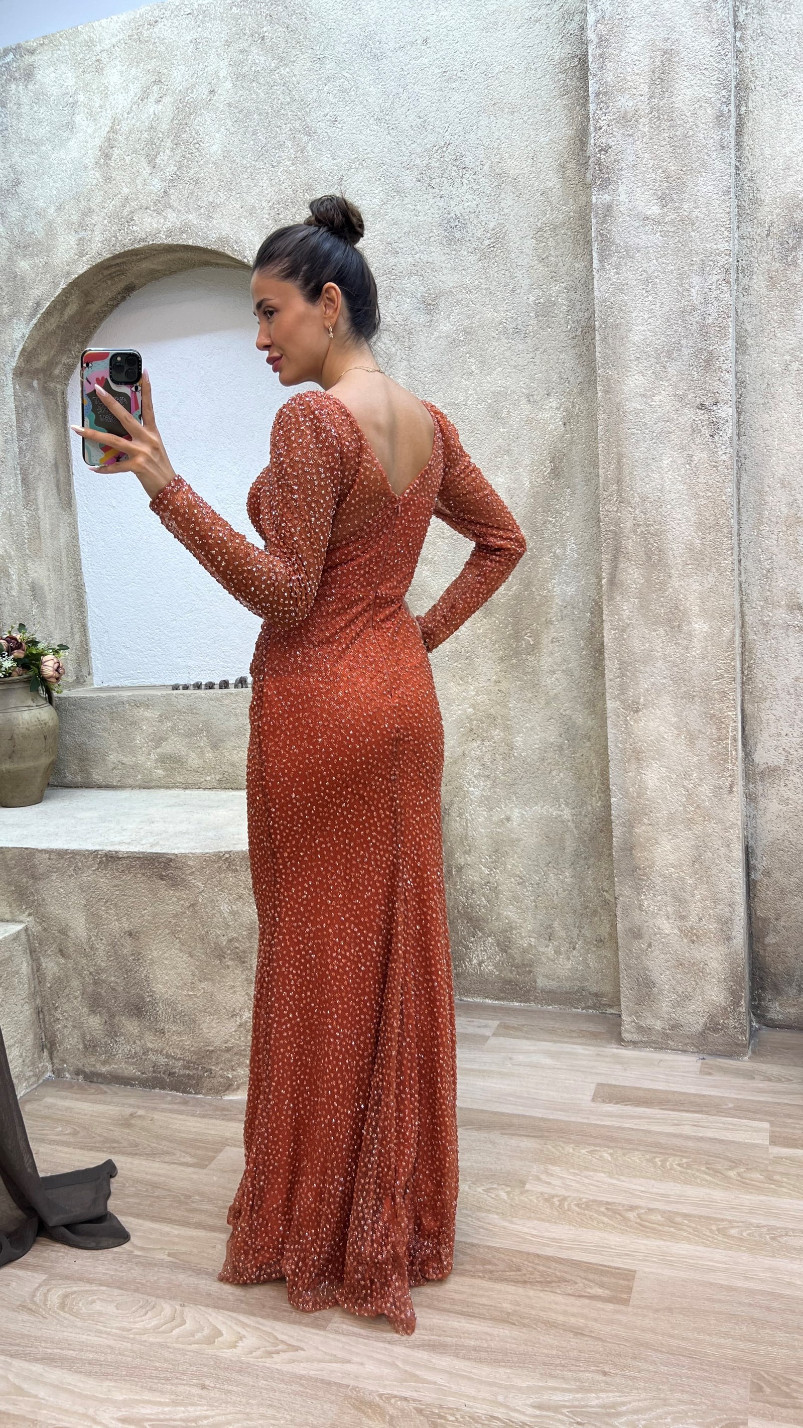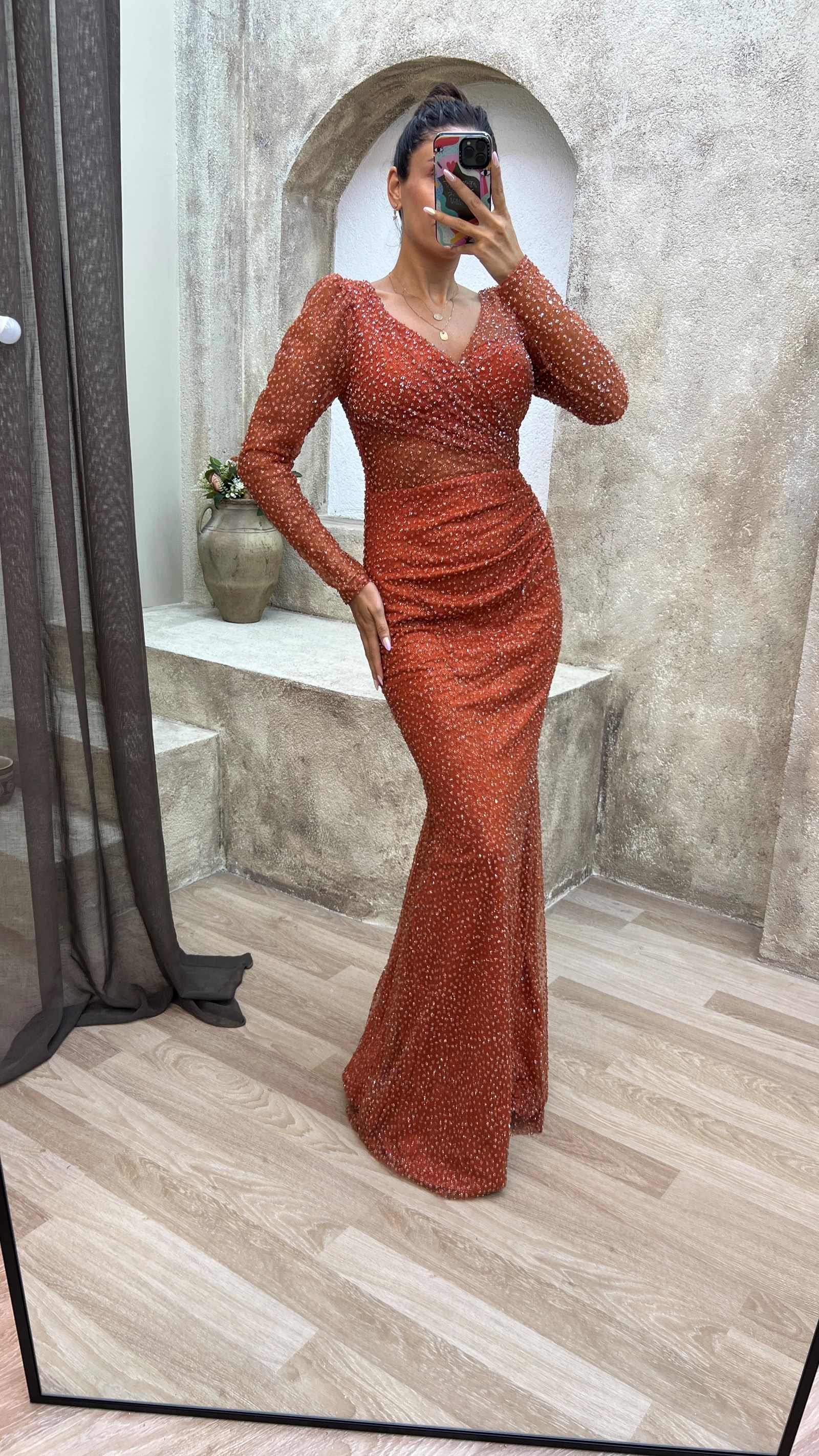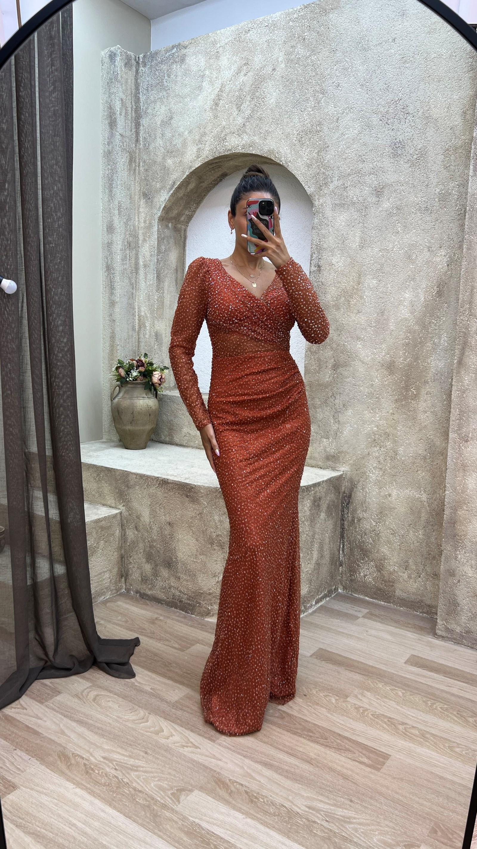 • Kiremit V Yaka Sırt Detay Taş İşlemeli Abiye Elbise
