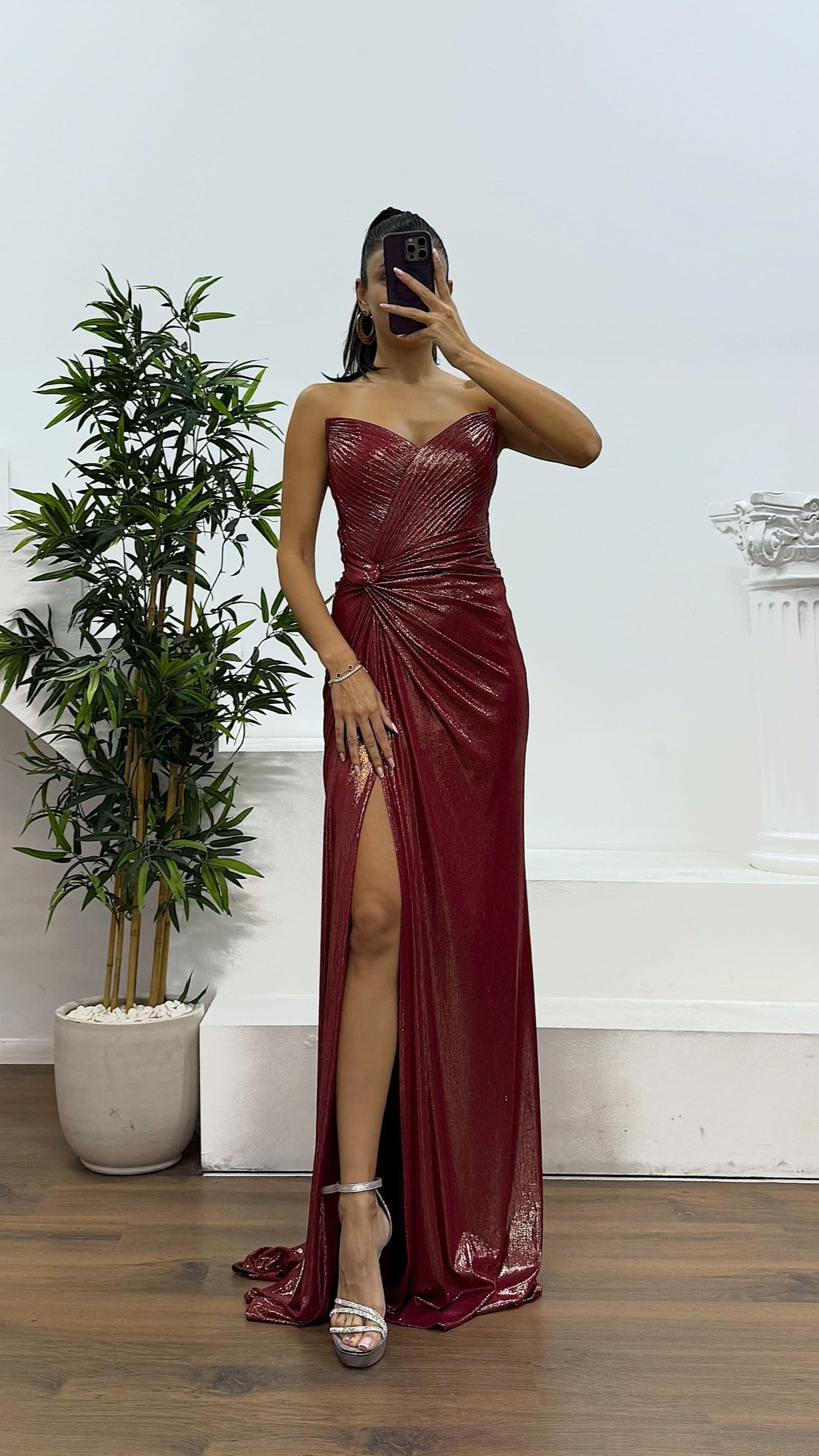 Strapless Back Detail Evening Dress The dress fits sizes 36-44, features padded bust, is fully lined, with a criss-cross tie and zipper closure at the back, and includes a slit detail. Dress length: Varies between 175-170 cm. Fabric type: Satin polyester, viscose.