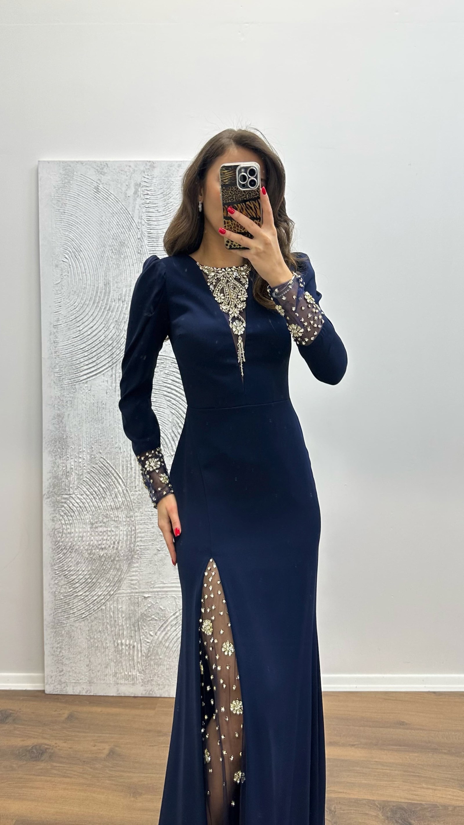 Evening dress with embroidery details The product is compatible with sizes 36-44, featuring padded cups, lined, back zipper closure, slit, and designed as an evening dress with embroidery details. Product length: May vary between 170-175 cm. Product sleeve length: 60 cm. Fabric type: 100% polyester - embroidered tulle 3% lycra, 97% polyester.