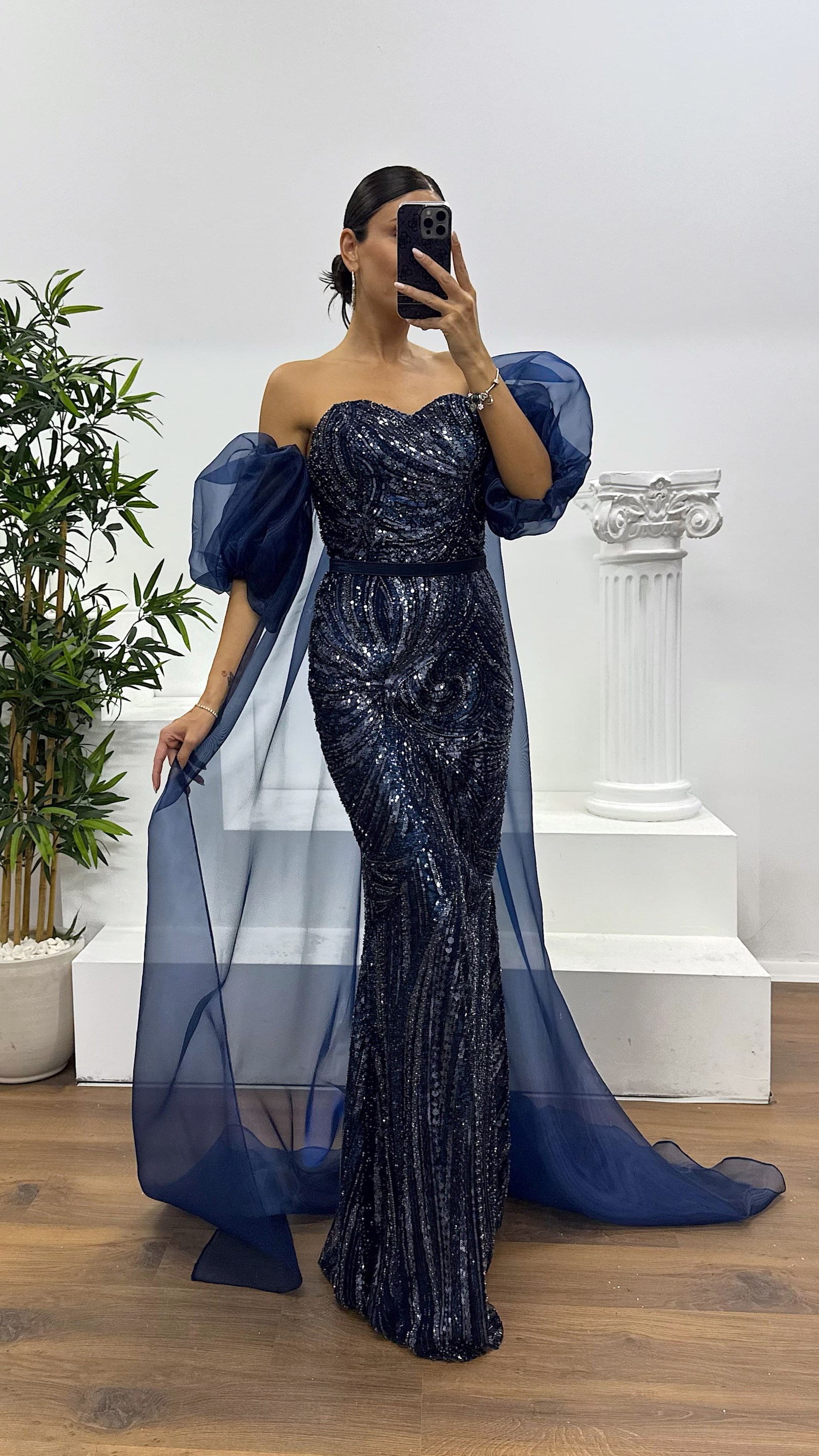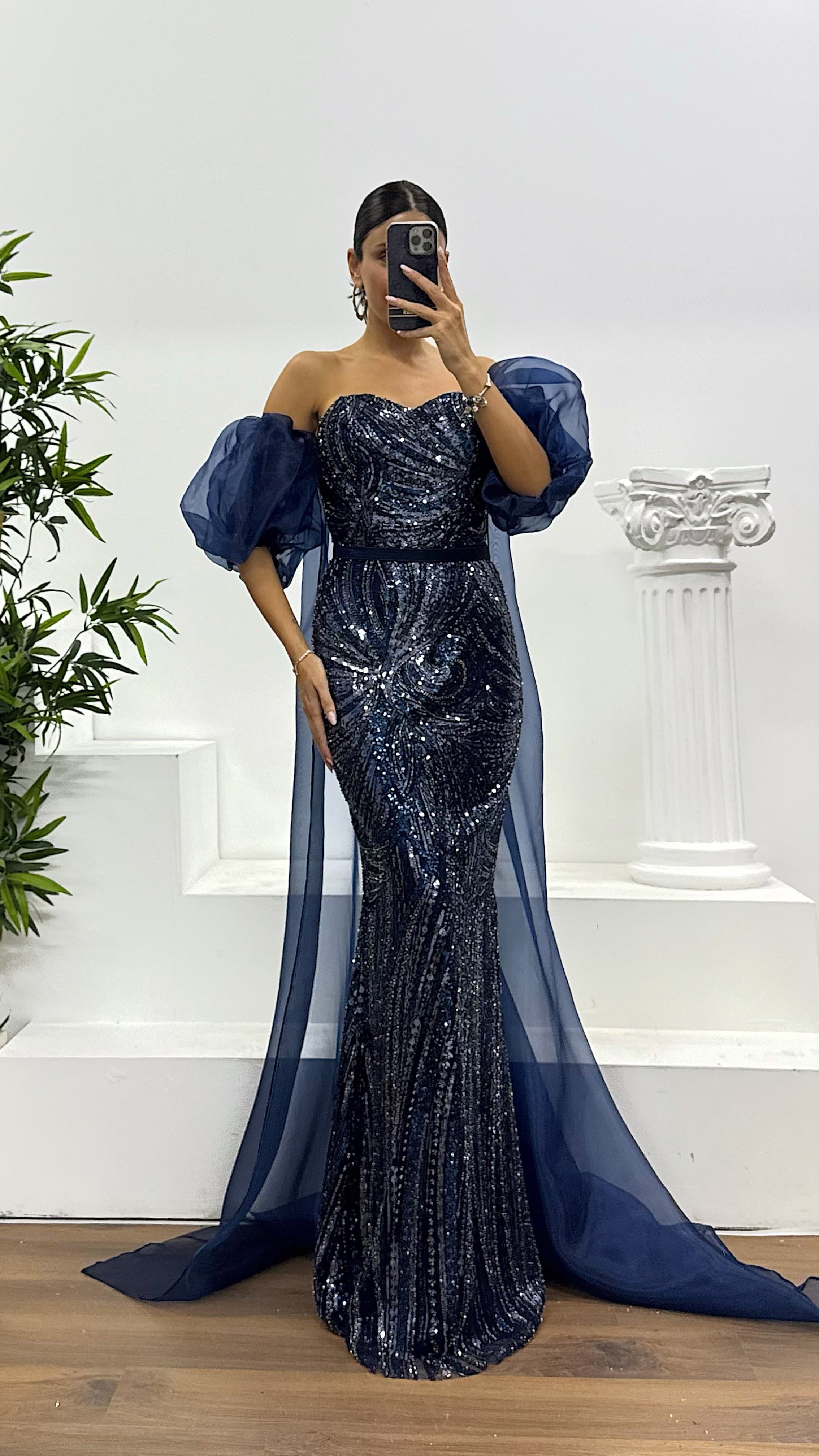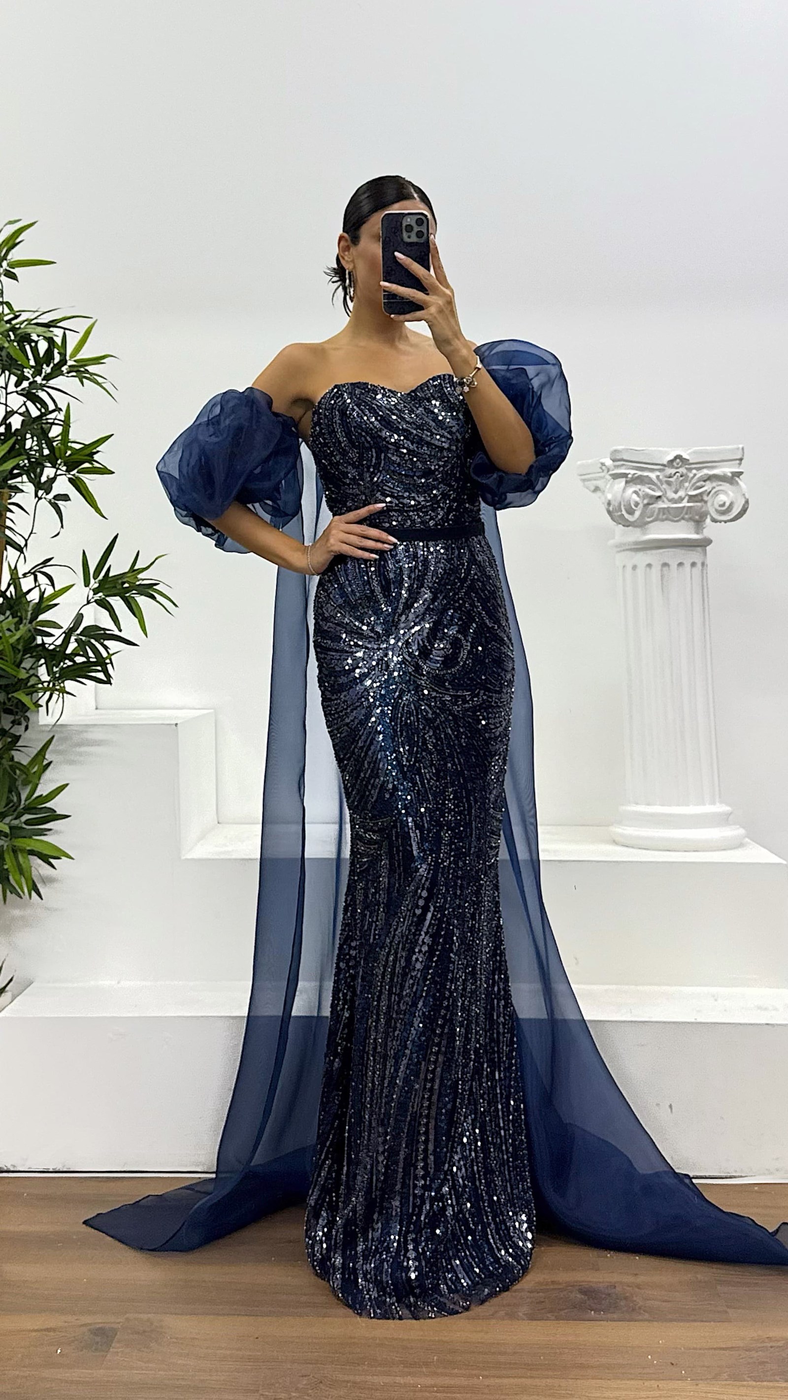 Embroidered Puff Sleeve Evening Dress The product fits sizes 36 to 44, has padded cups, is lined, features a back zipper, elasticated puff sleeves, and is designed as an embroidered evening gown. Length: May vary between 170–175 cm. Fabric type: Tulle — 3% Lycra, 97% Polyester.