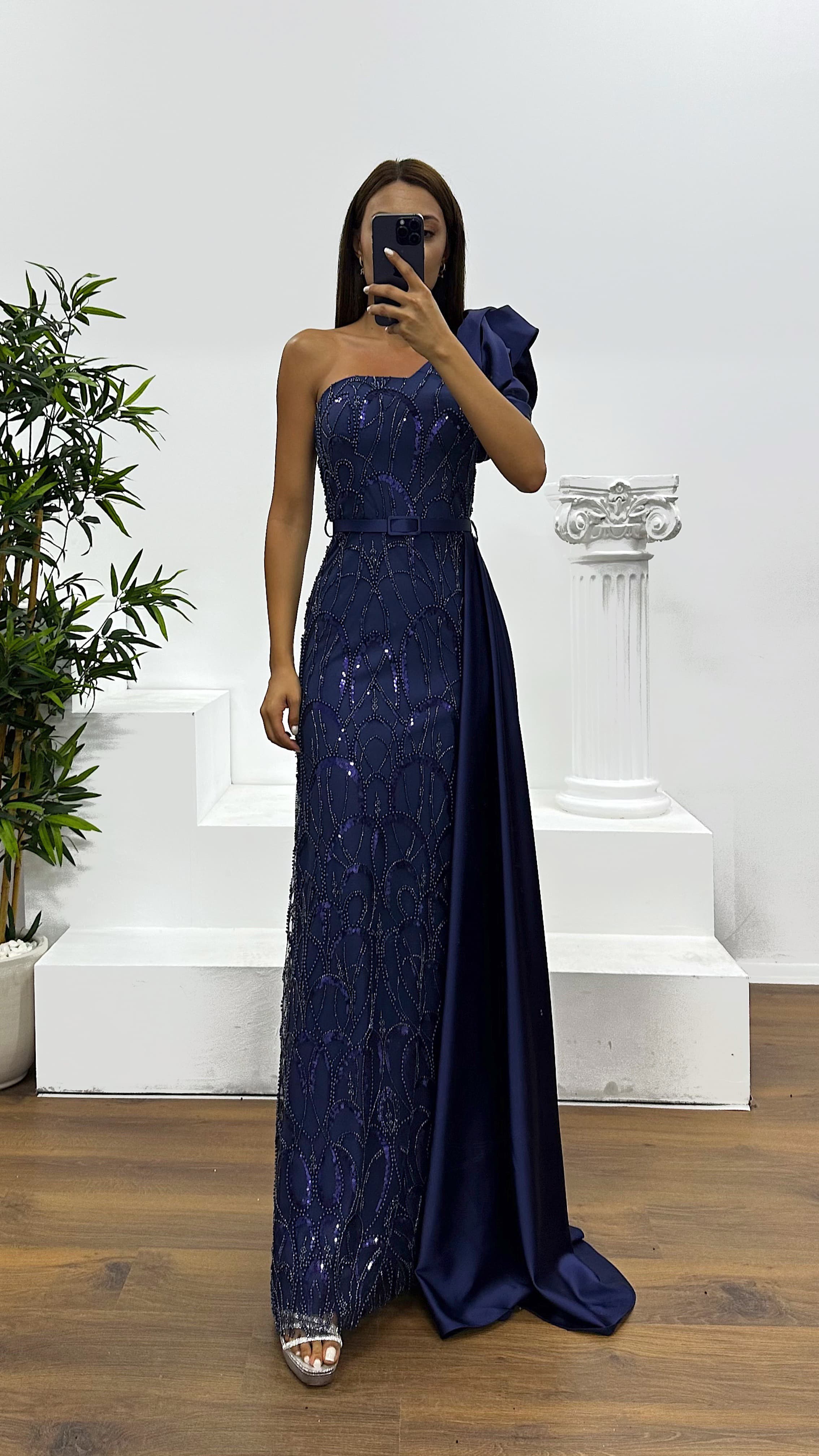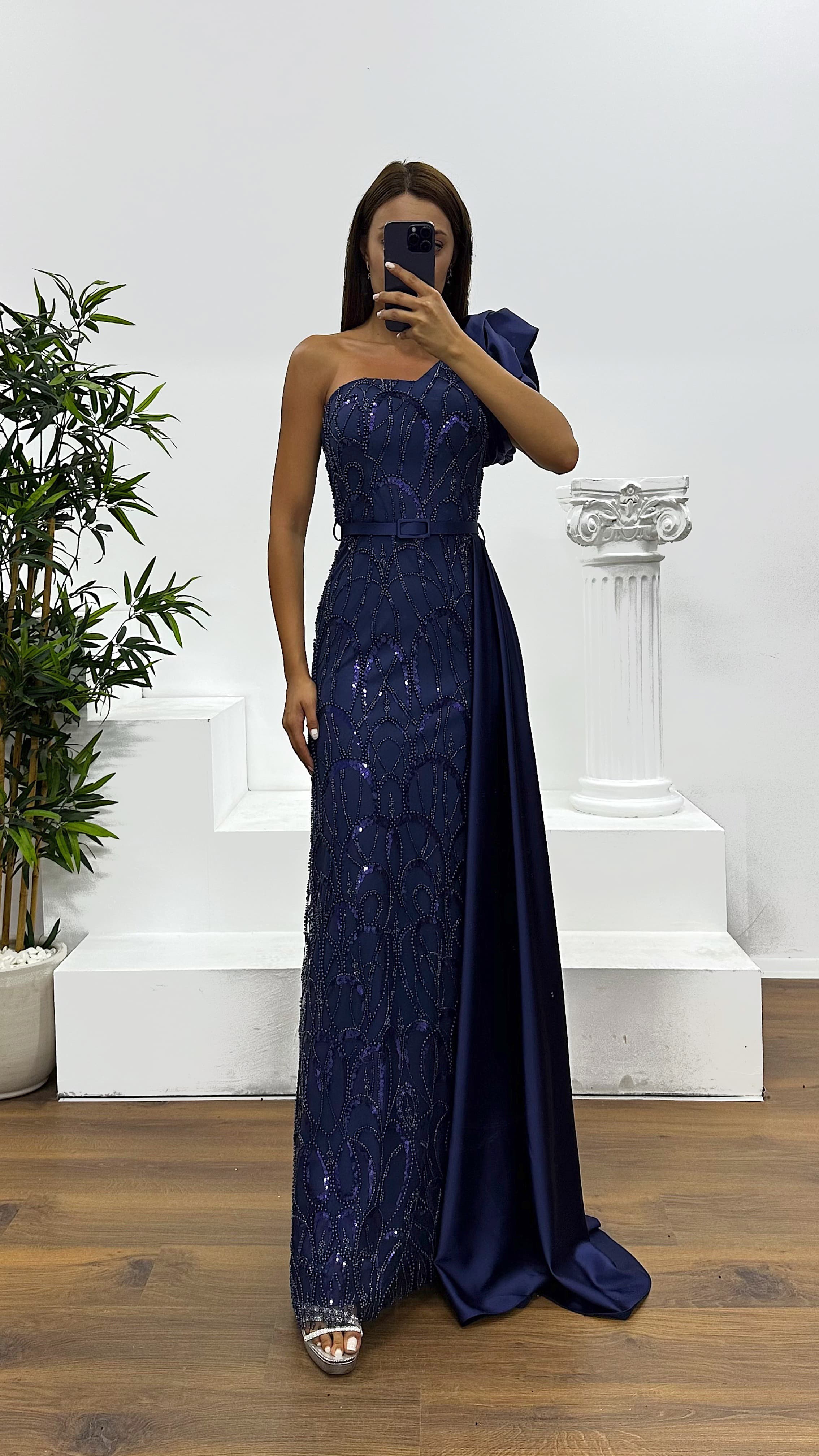 • Lacivert Tek Omuz İşlemeli Abiye Elbise