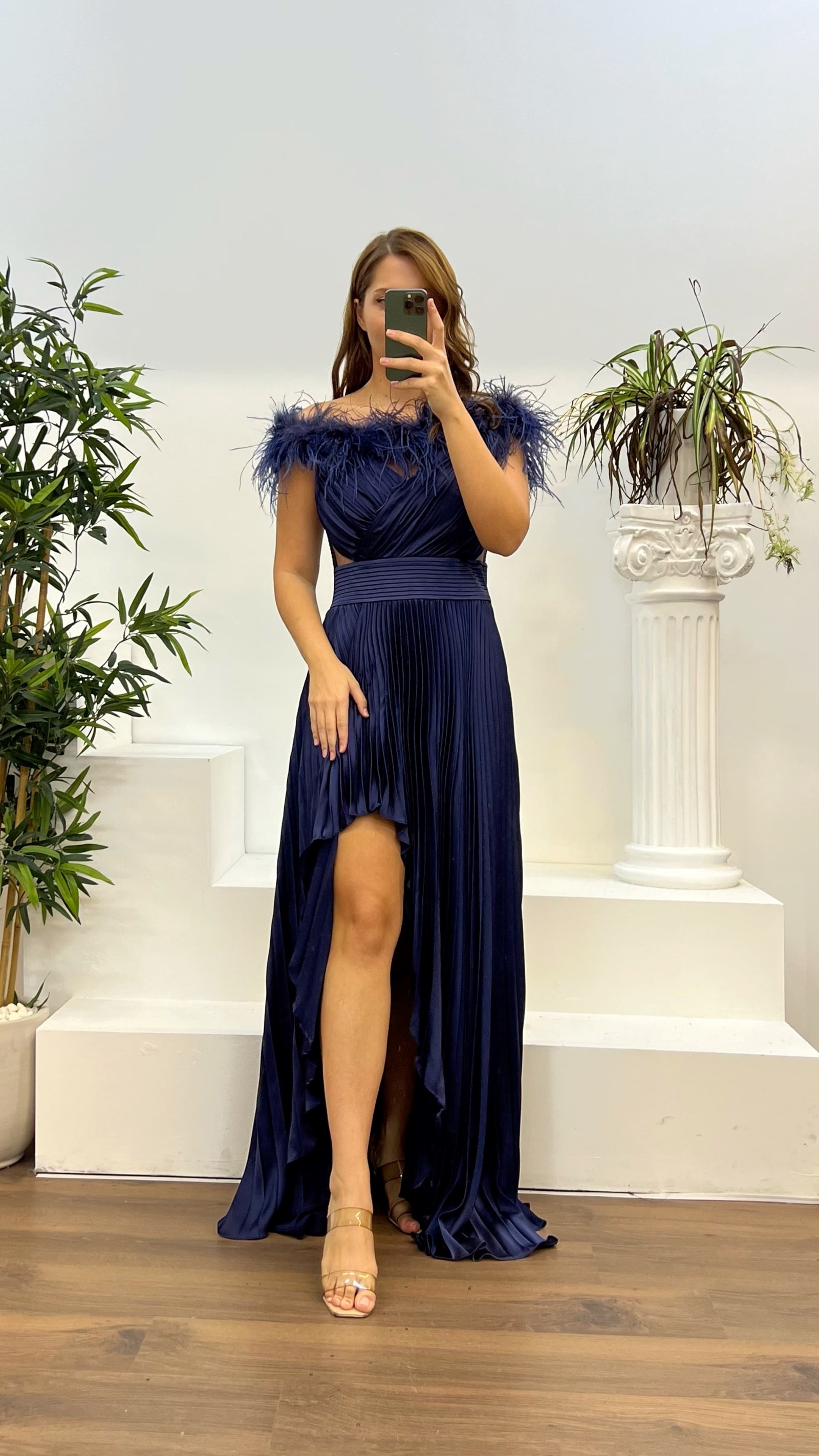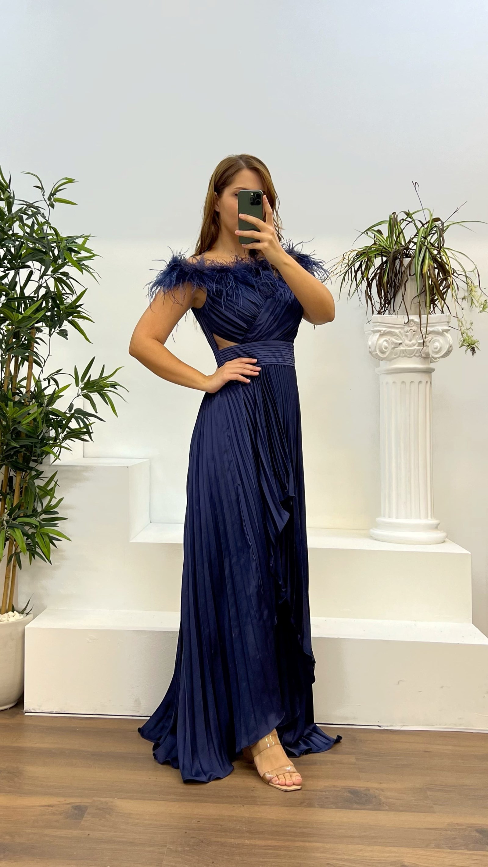 • Lacivert Yaka Tüylü Piliseli Büyük Beden Abiye Elbise