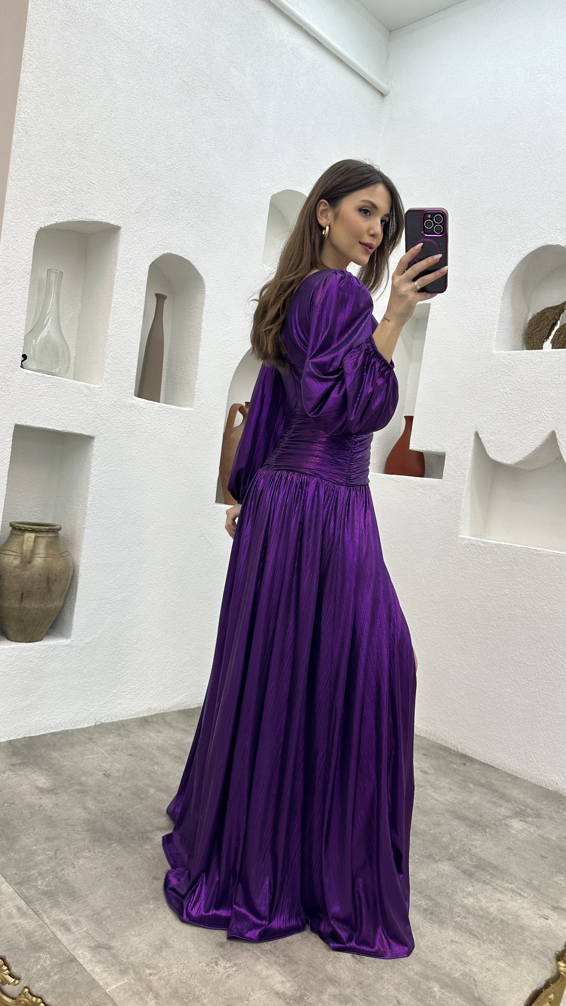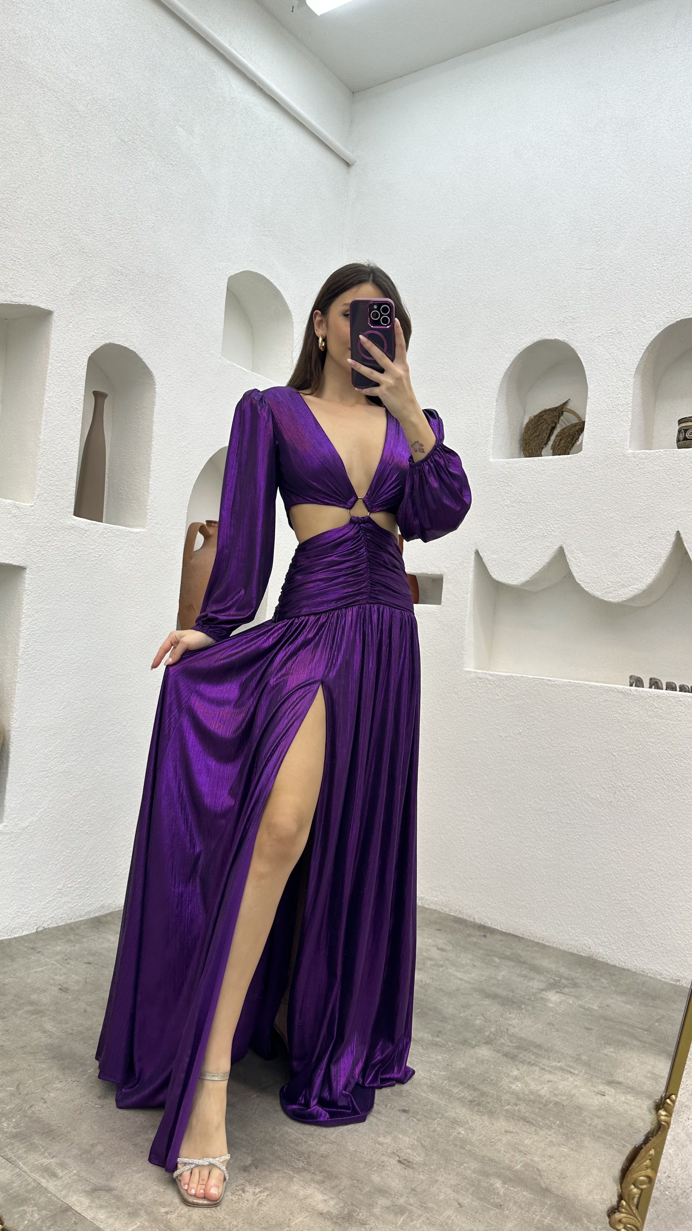• Zümrüt Bel Detay Tokalı Saten Abiye Elbise