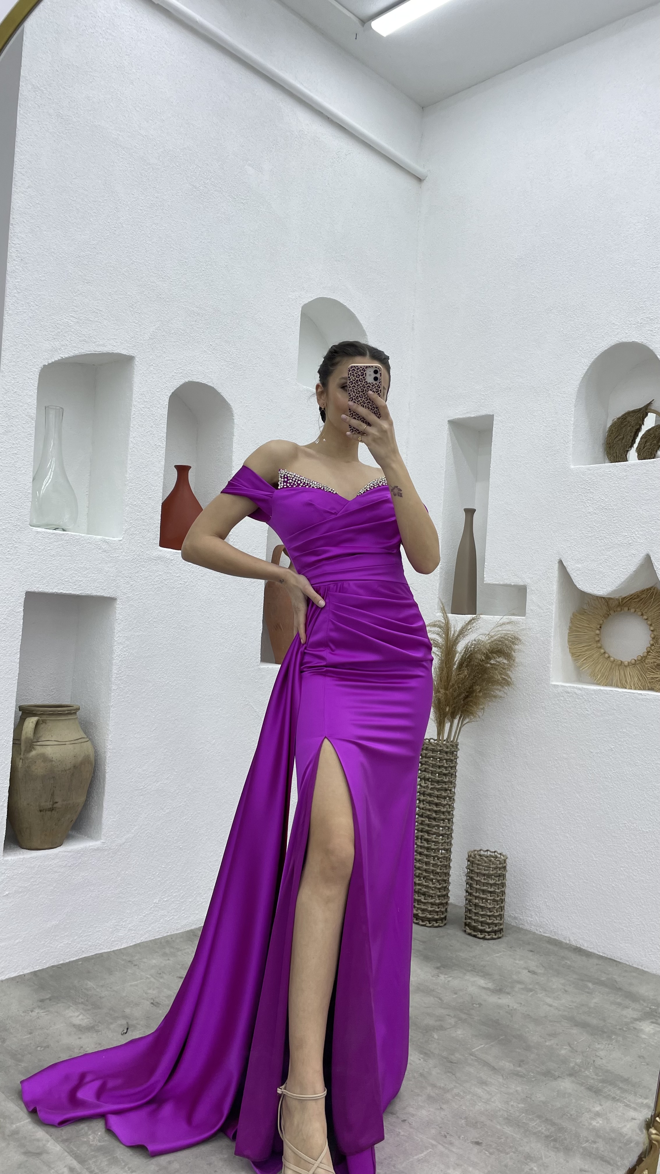 • Mor Göğsü Taşlı Drapeli Saten Abiye Elbise Aller