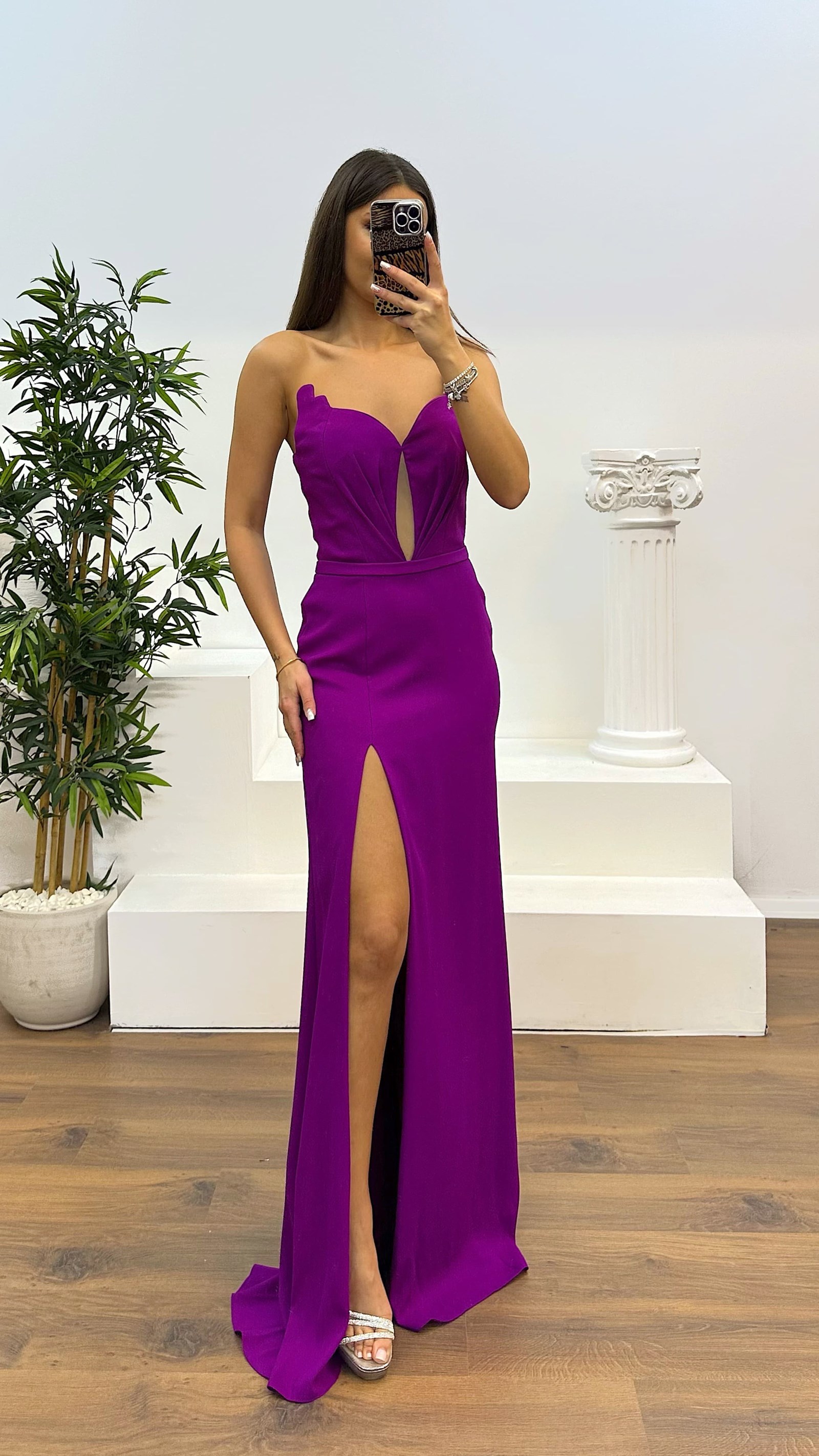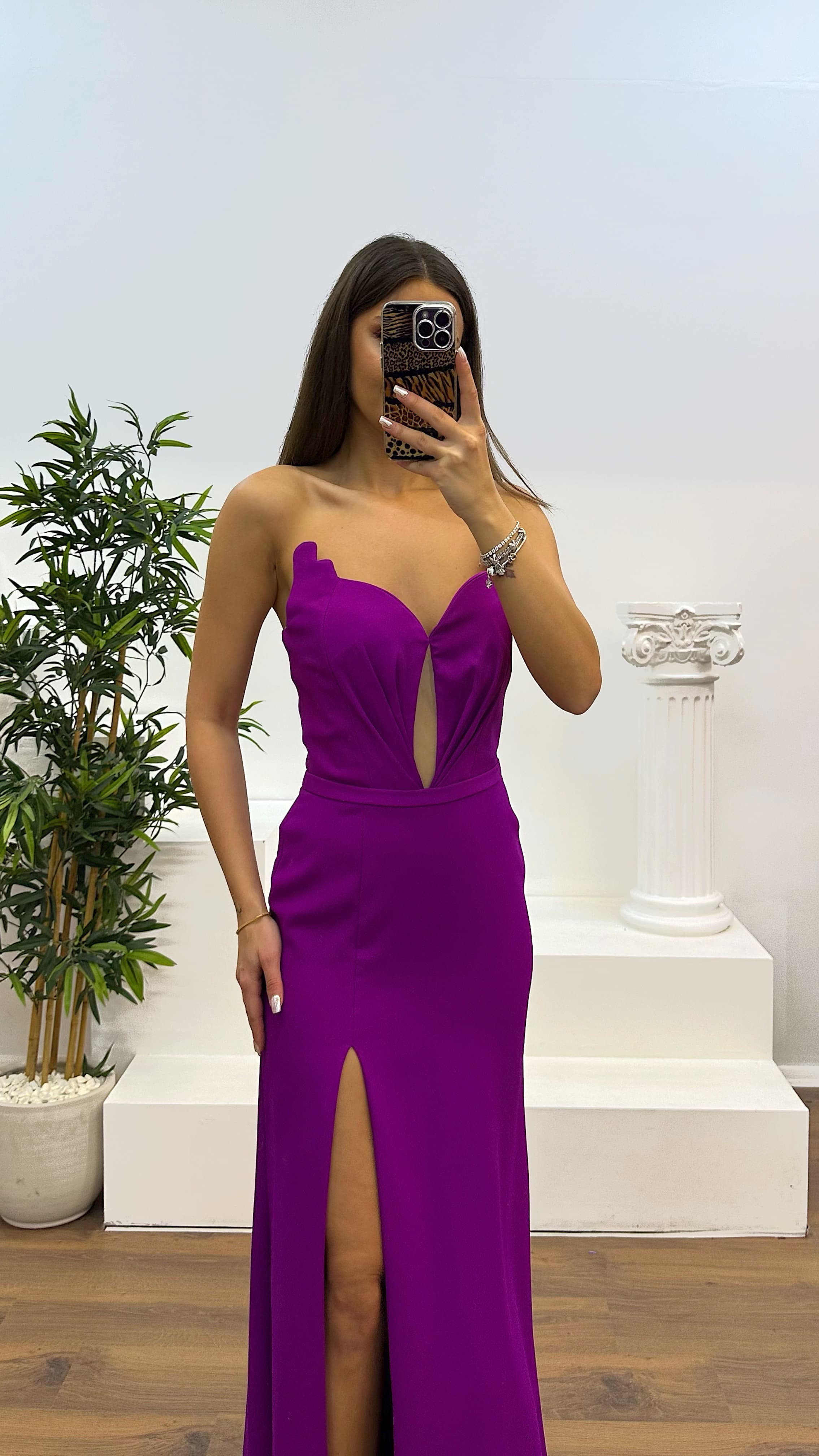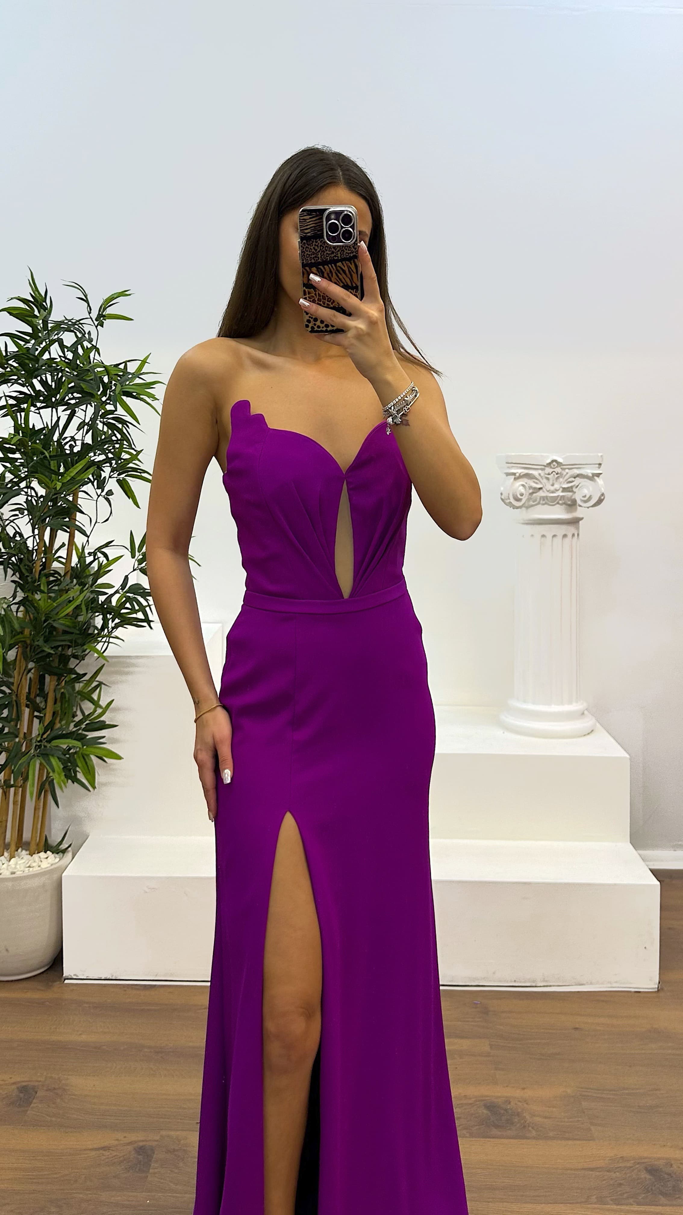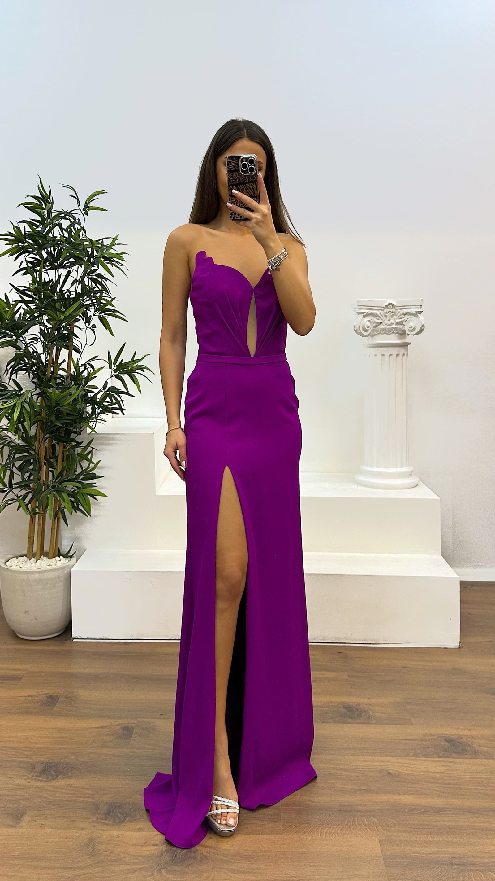 • Mor Kalp Yaka Straplez Abiye Elbise