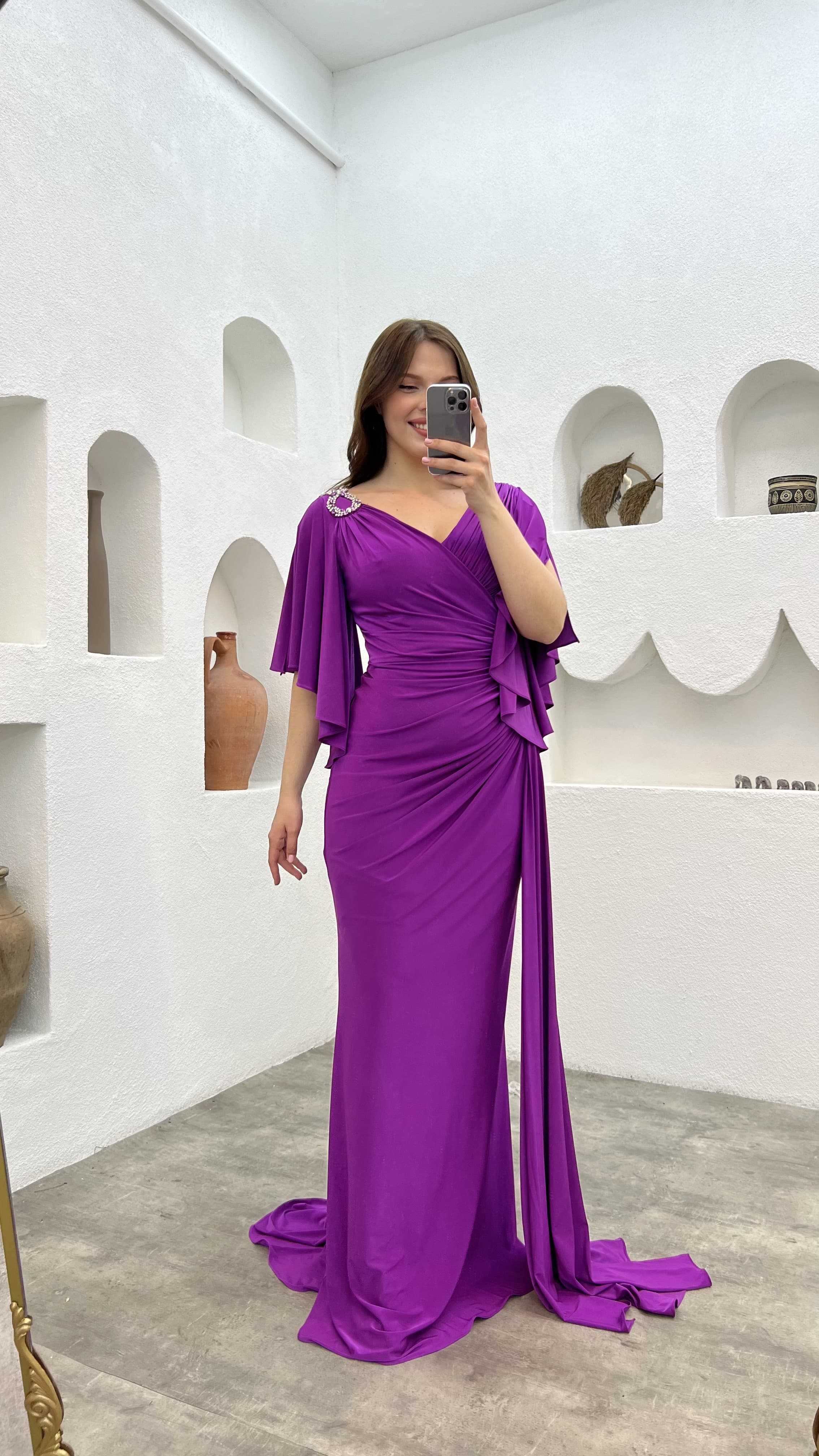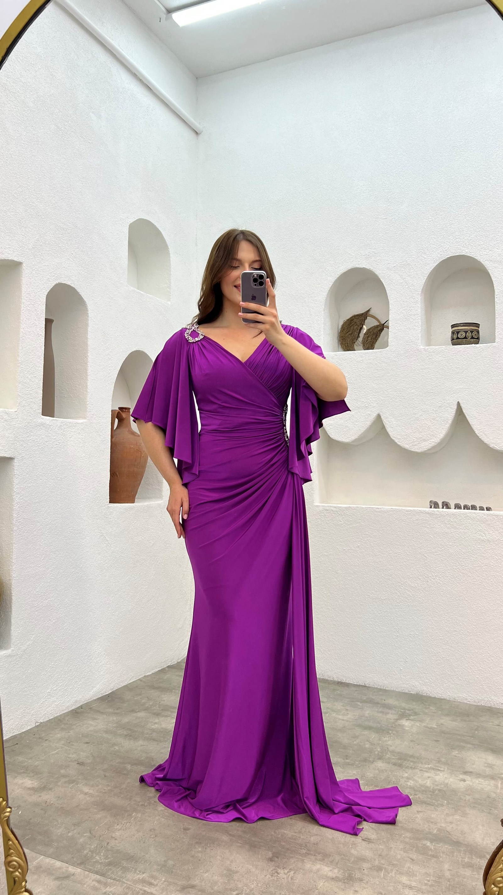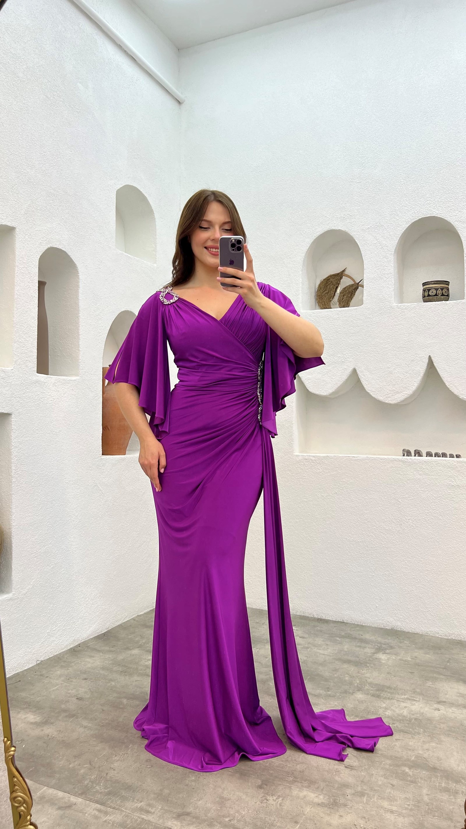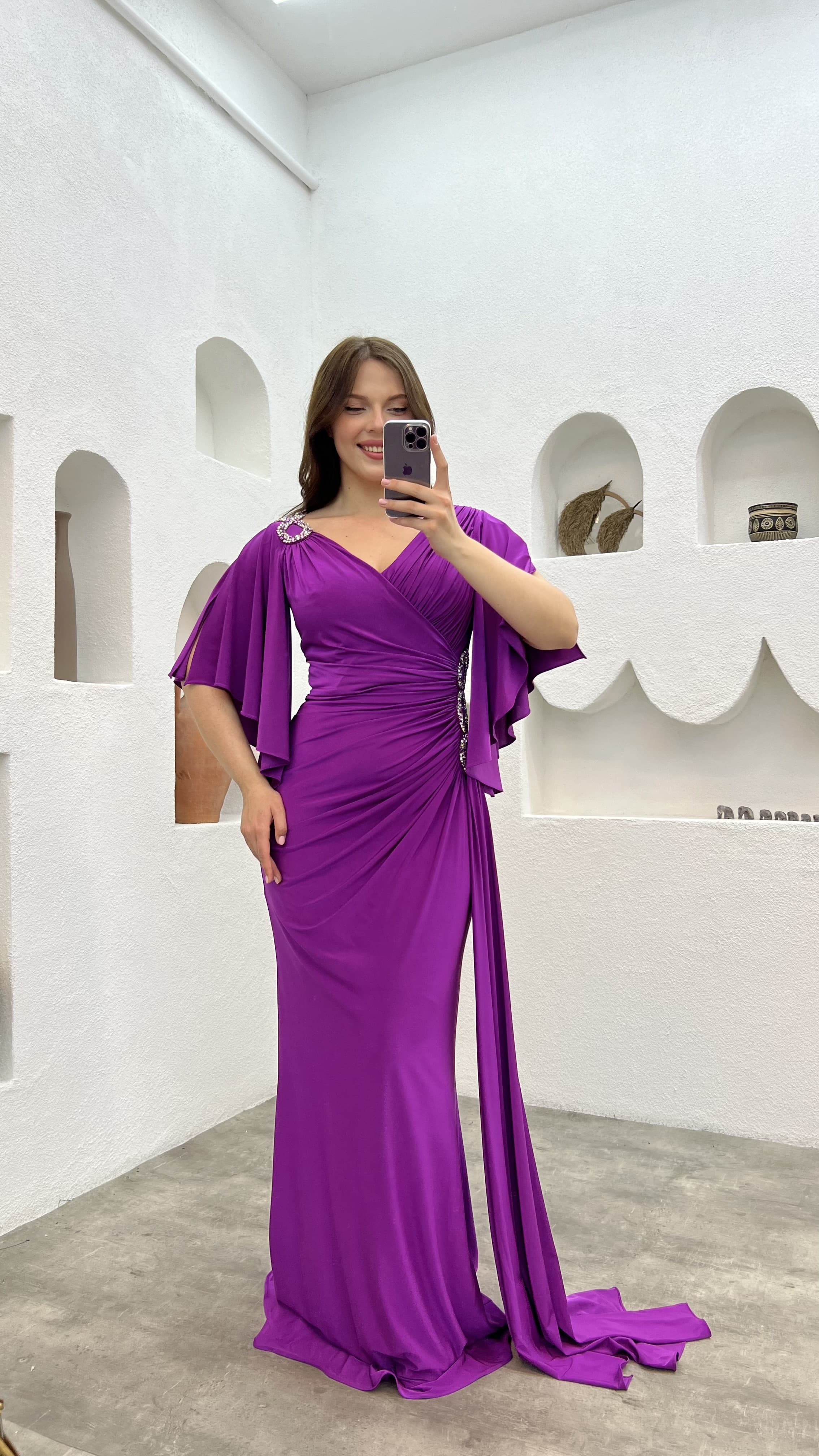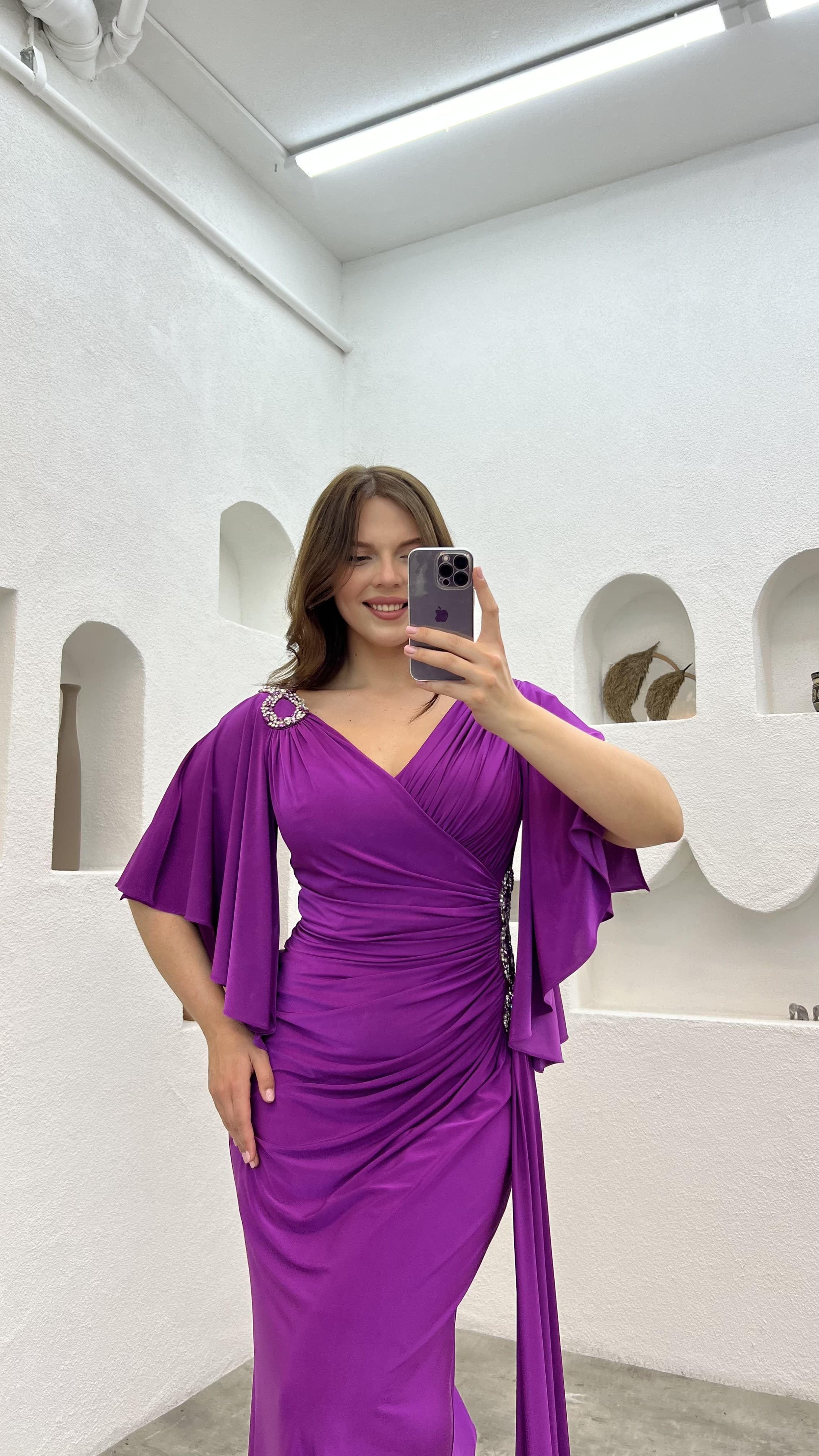 • Lila Omzu Ve Beli İşlemeli Volanlı Büyük Beden Abiye Elbise