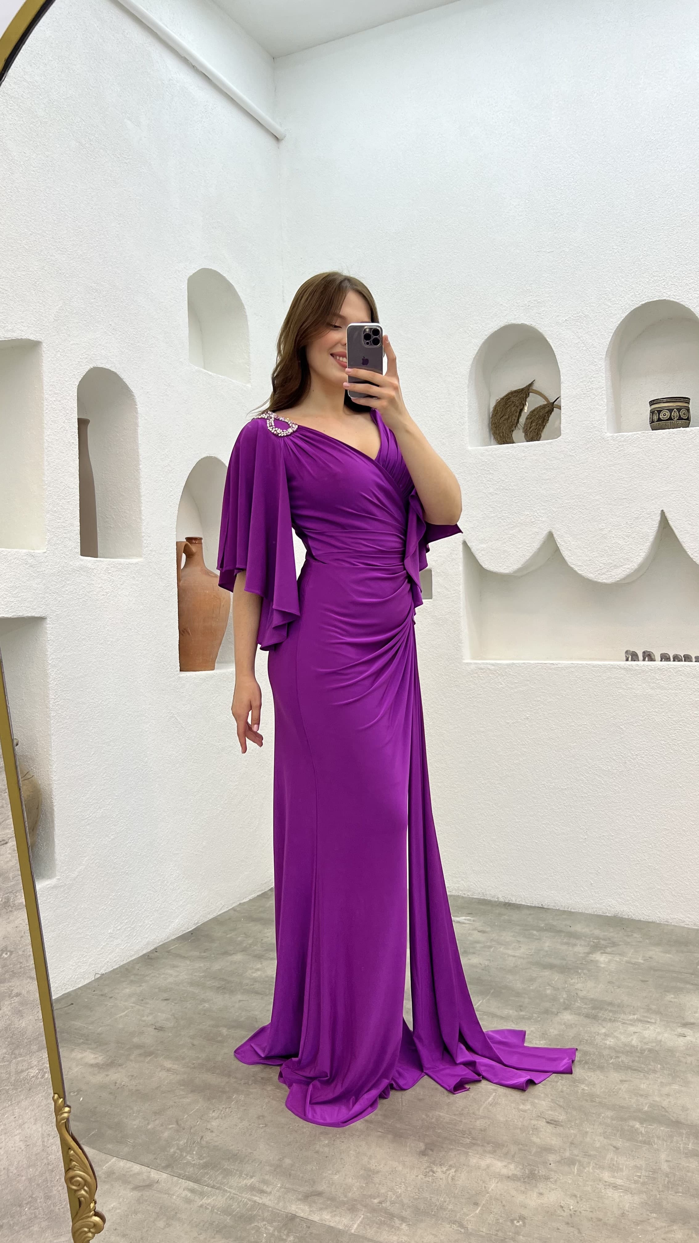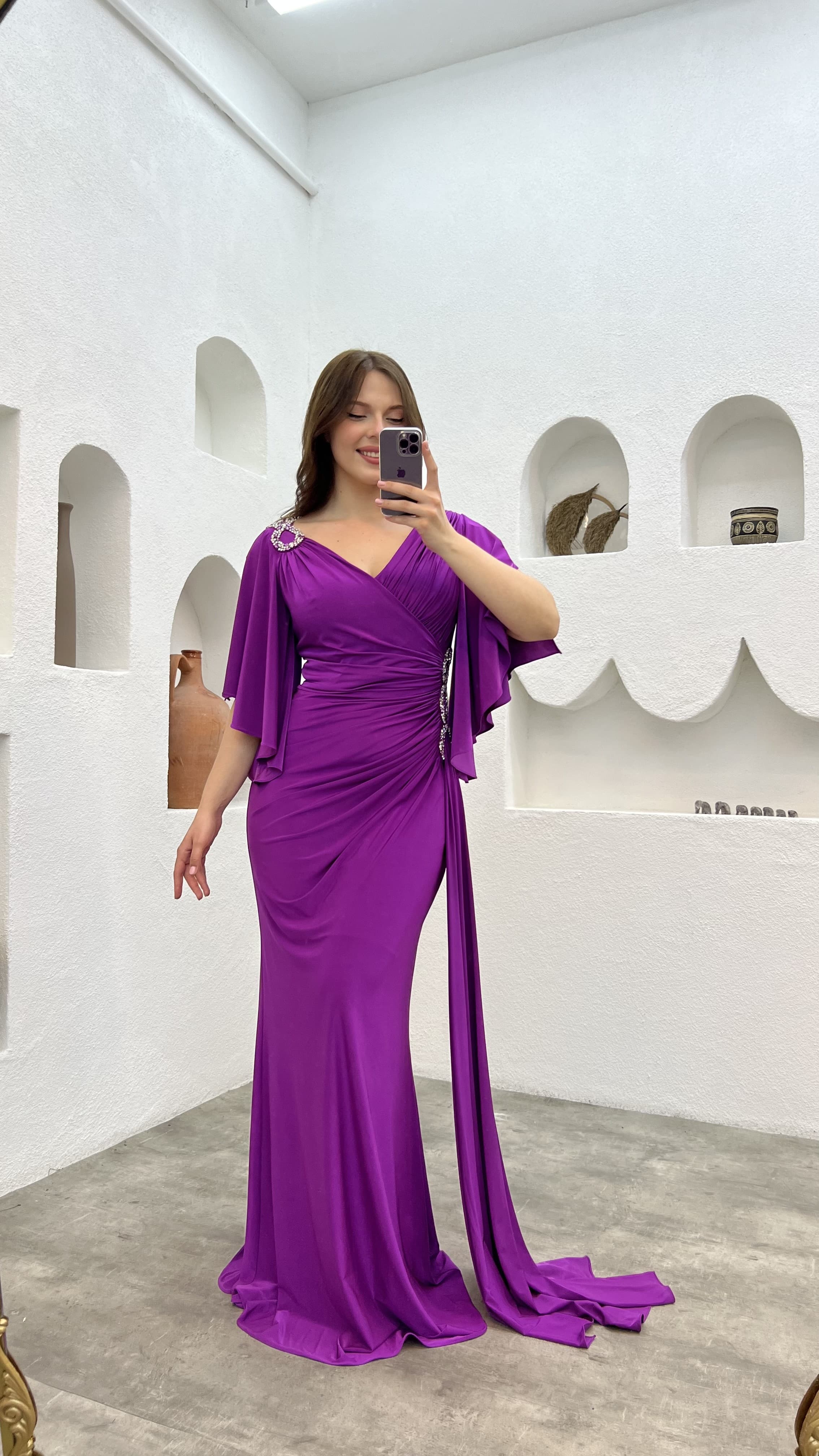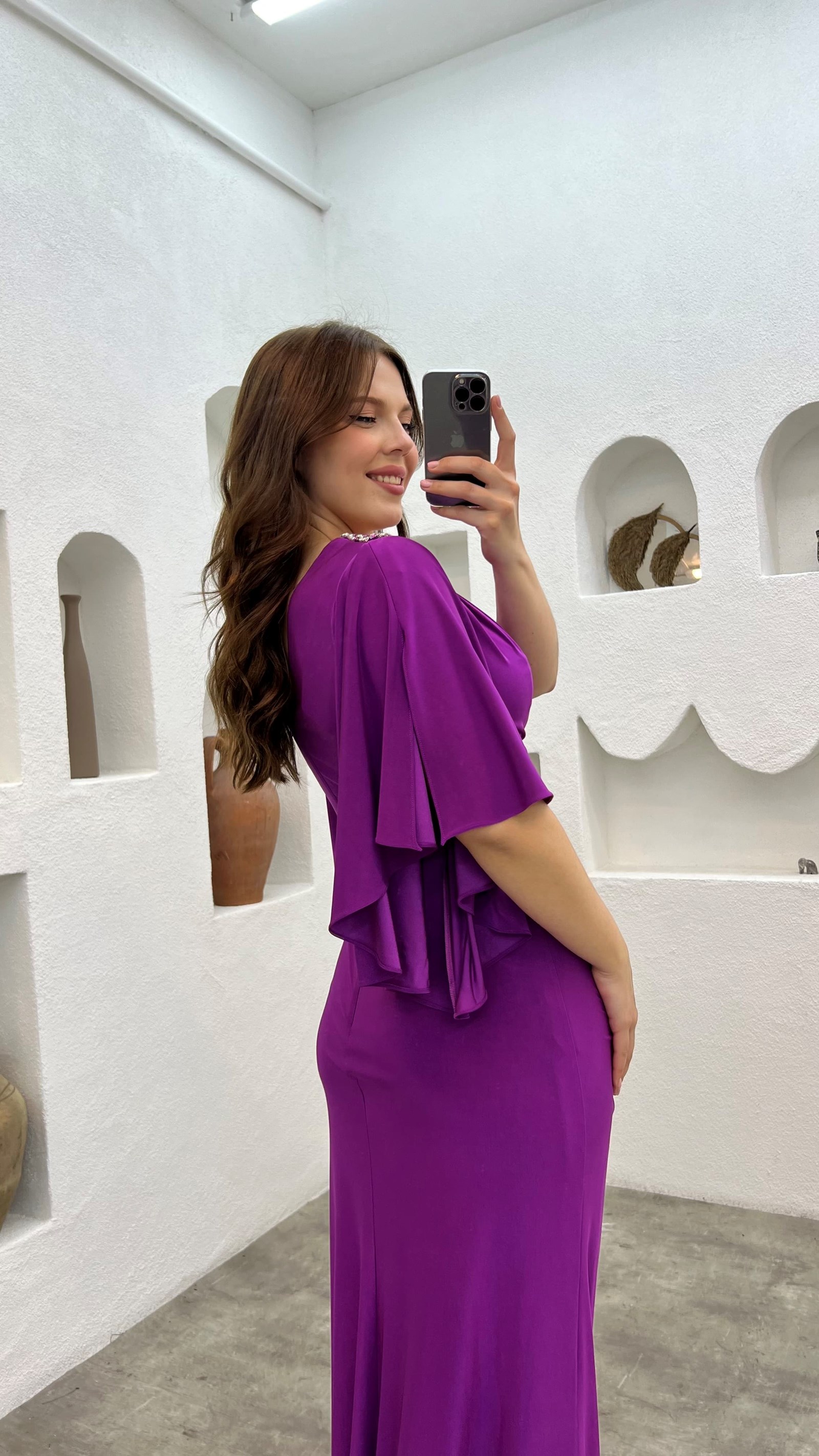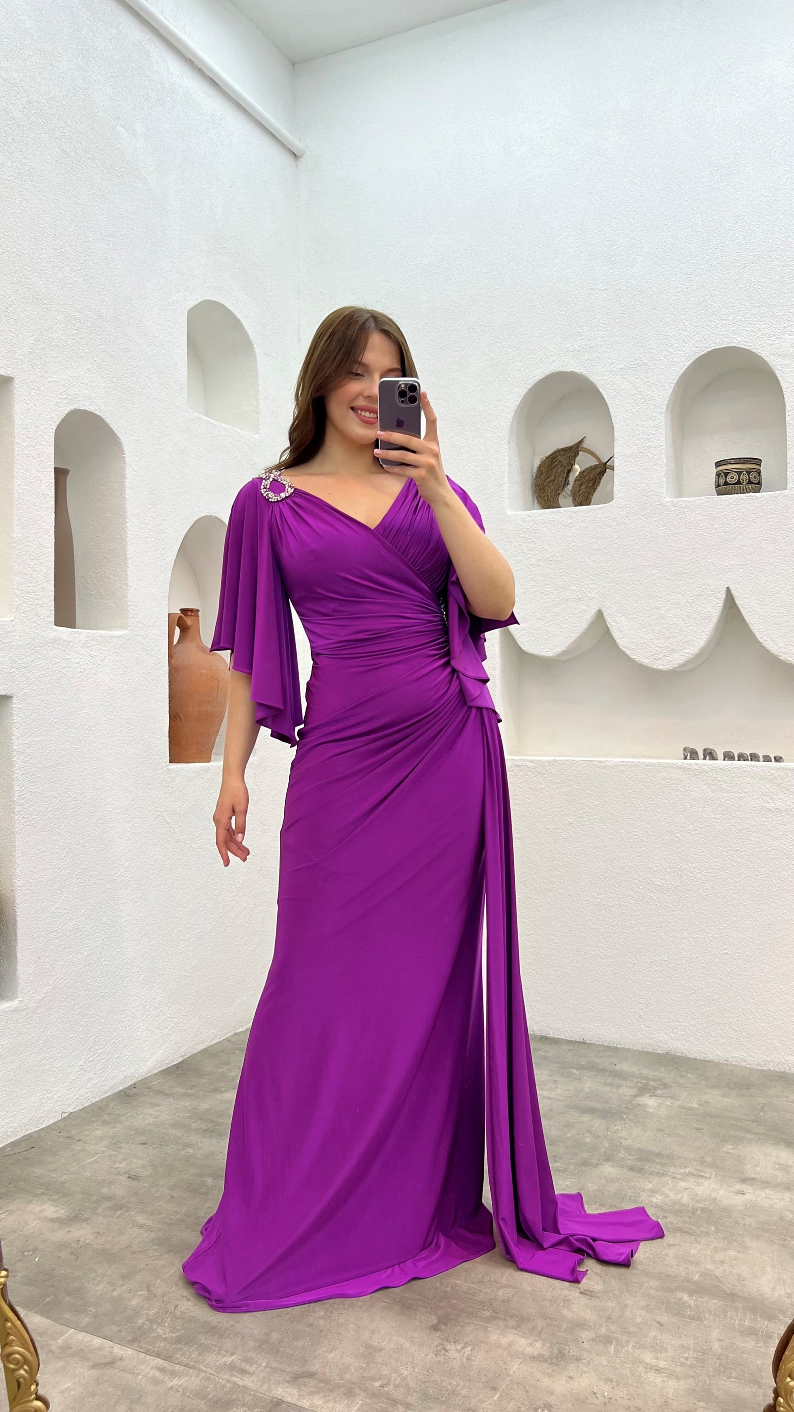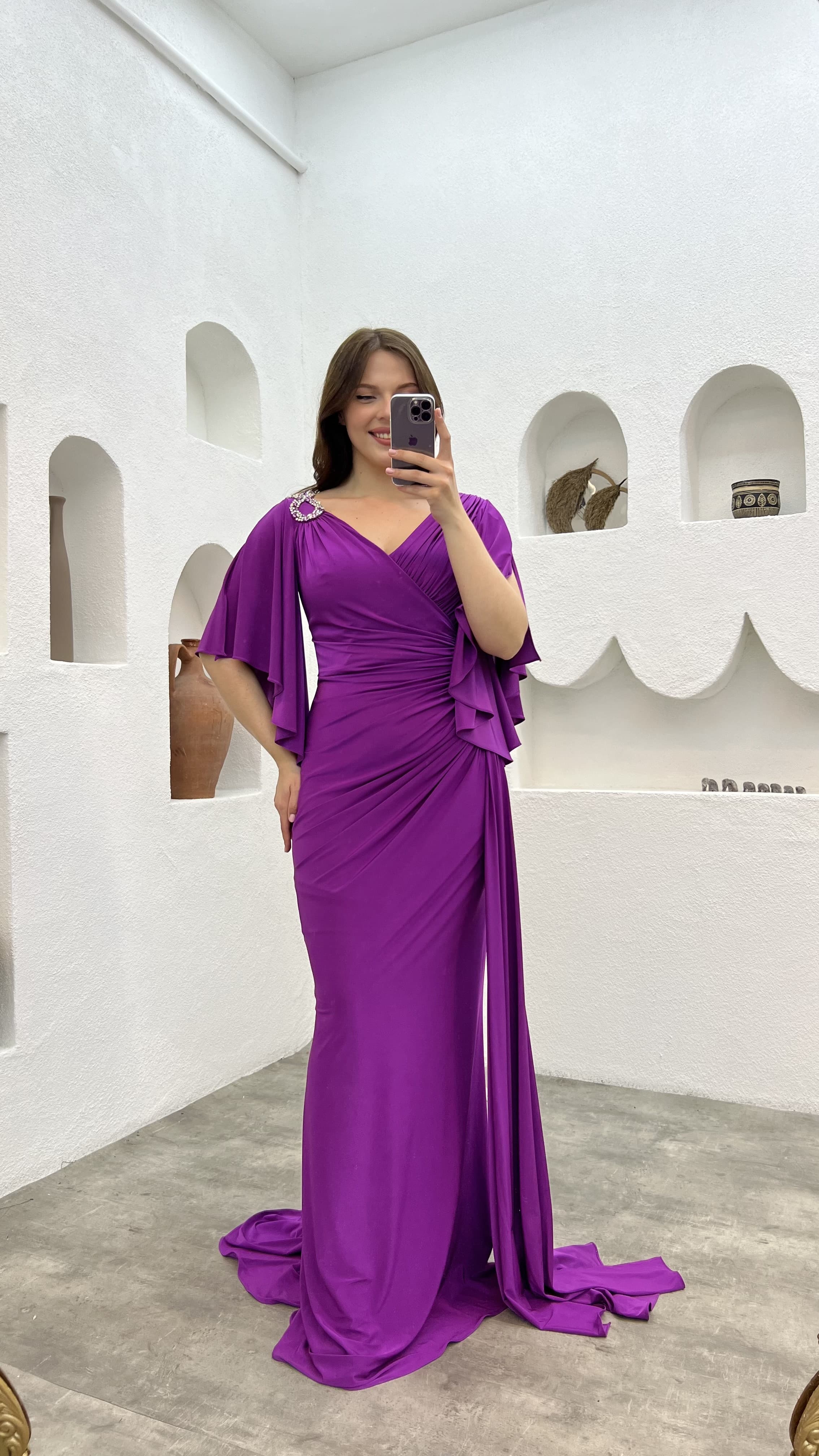 • Lila Omzu Ve Beli İşlemeli Volanlı Büyük Beden Abiye Elbise