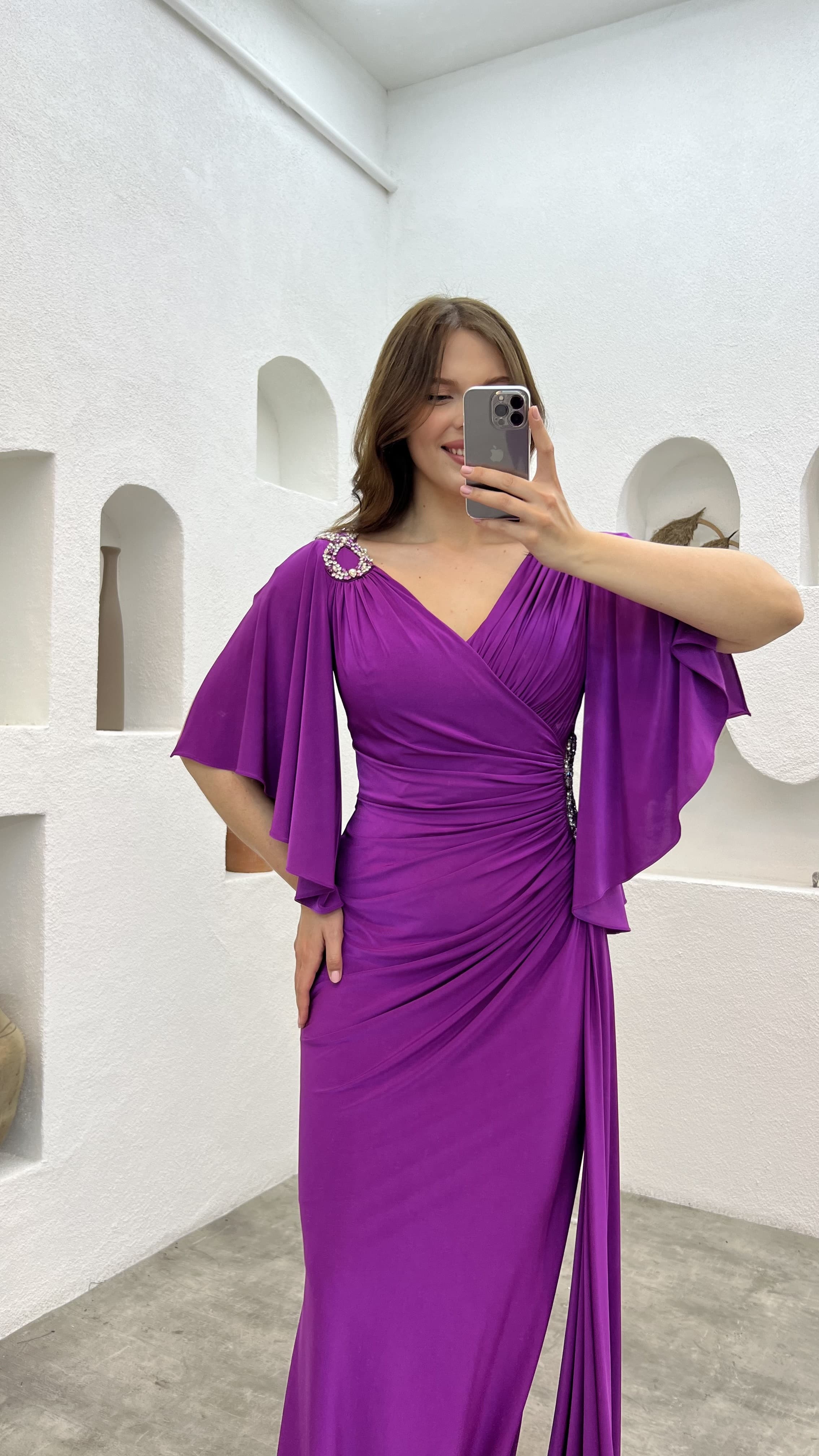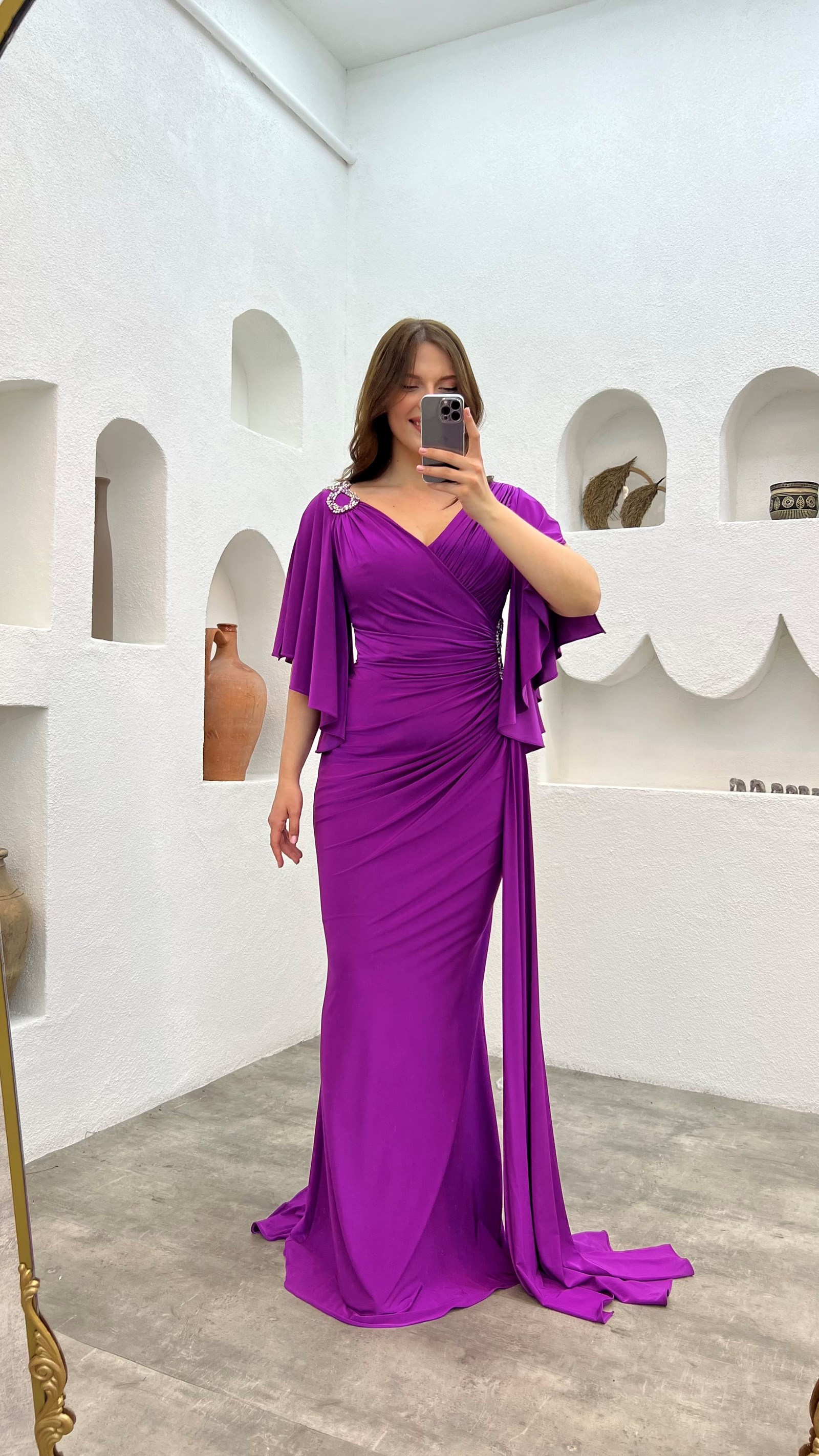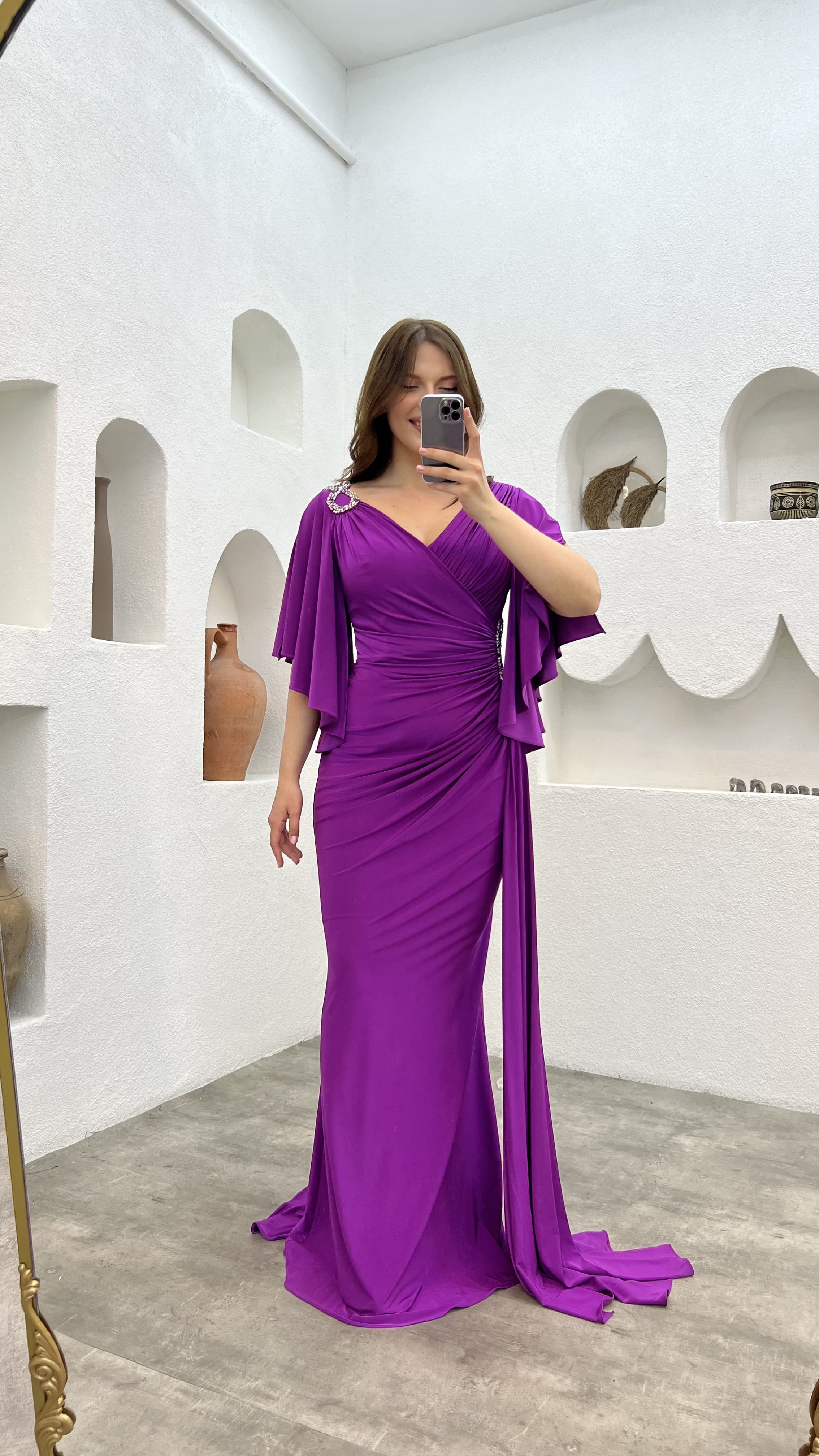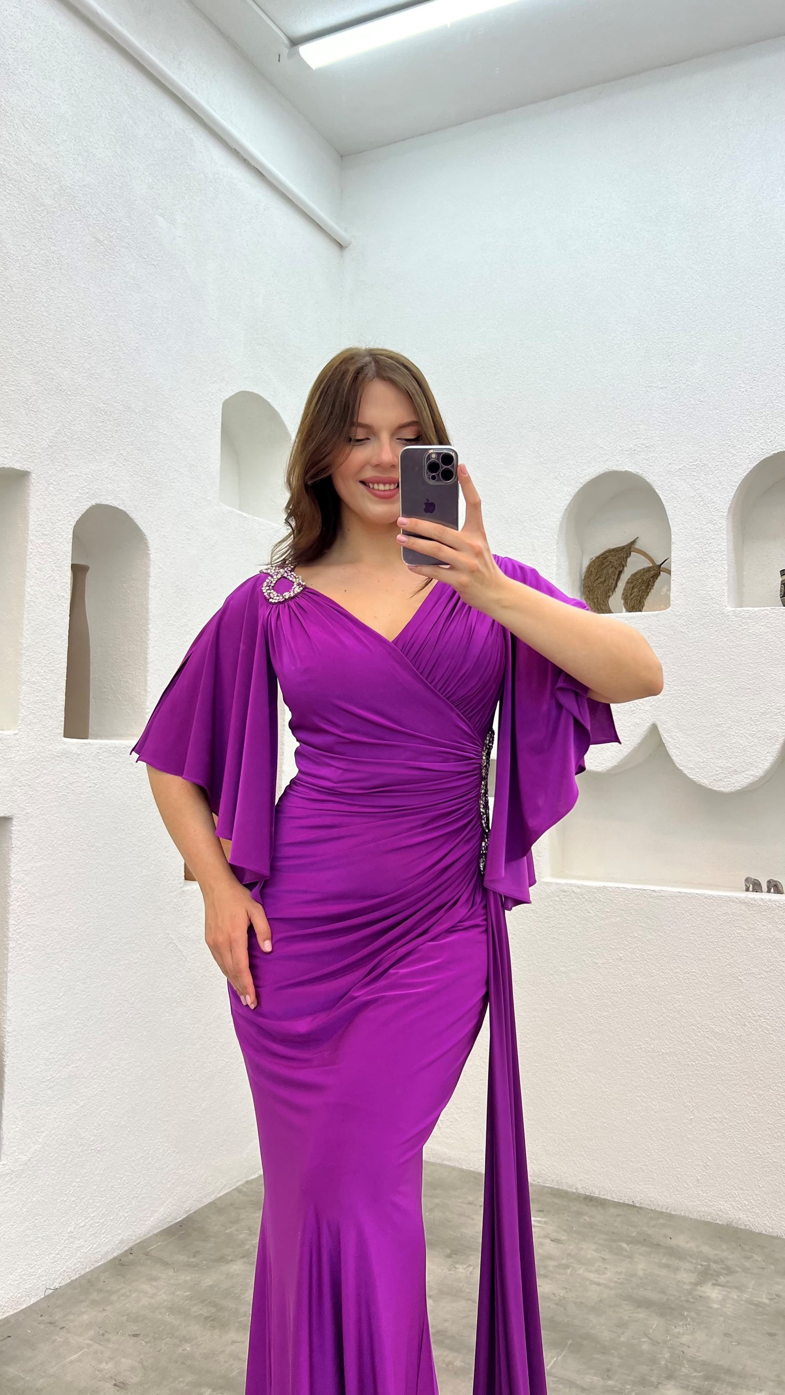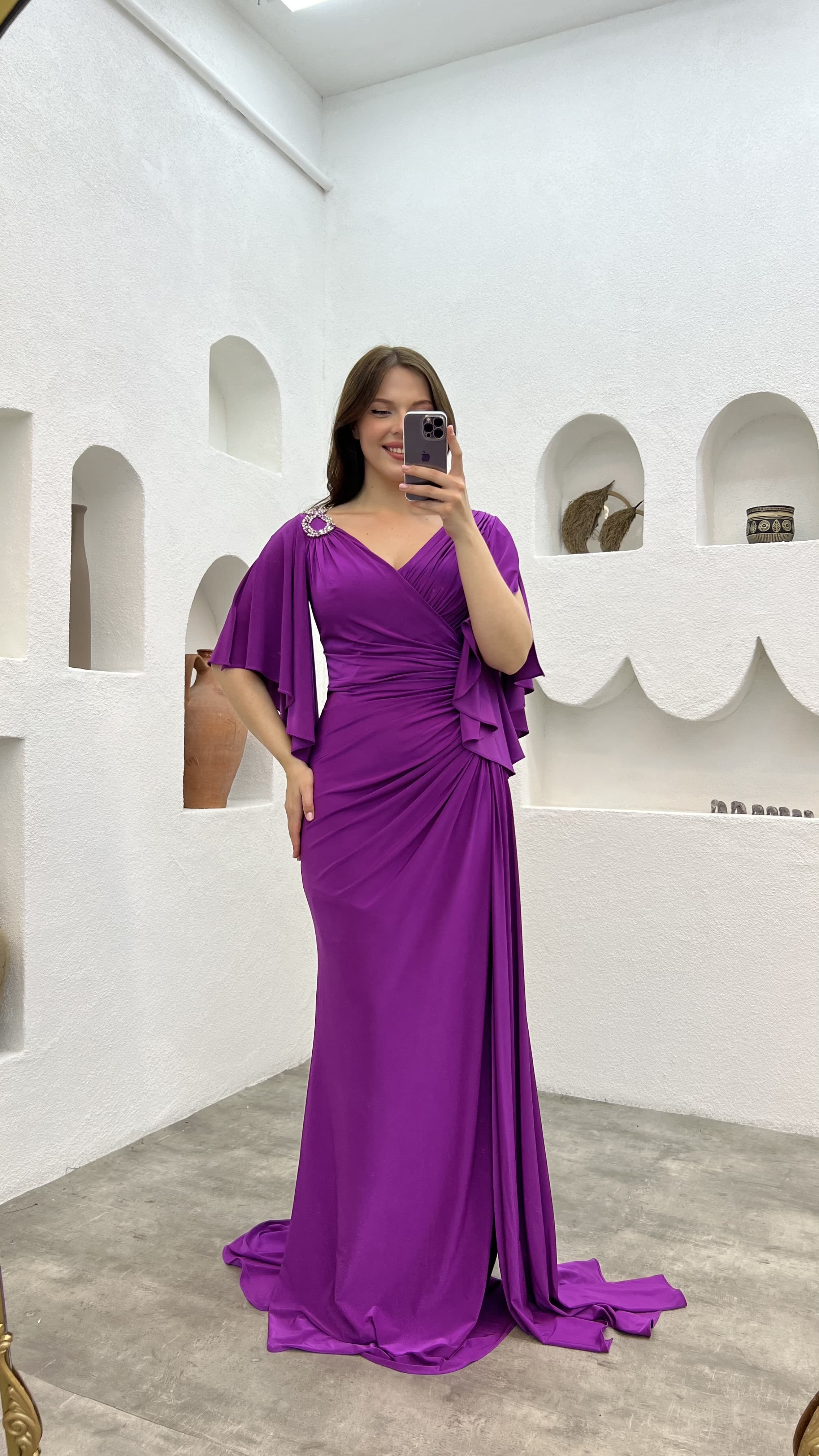 • Lila Omzu Ve Beli İşlemeli Volanlı Büyük Beden Abiye Elbise