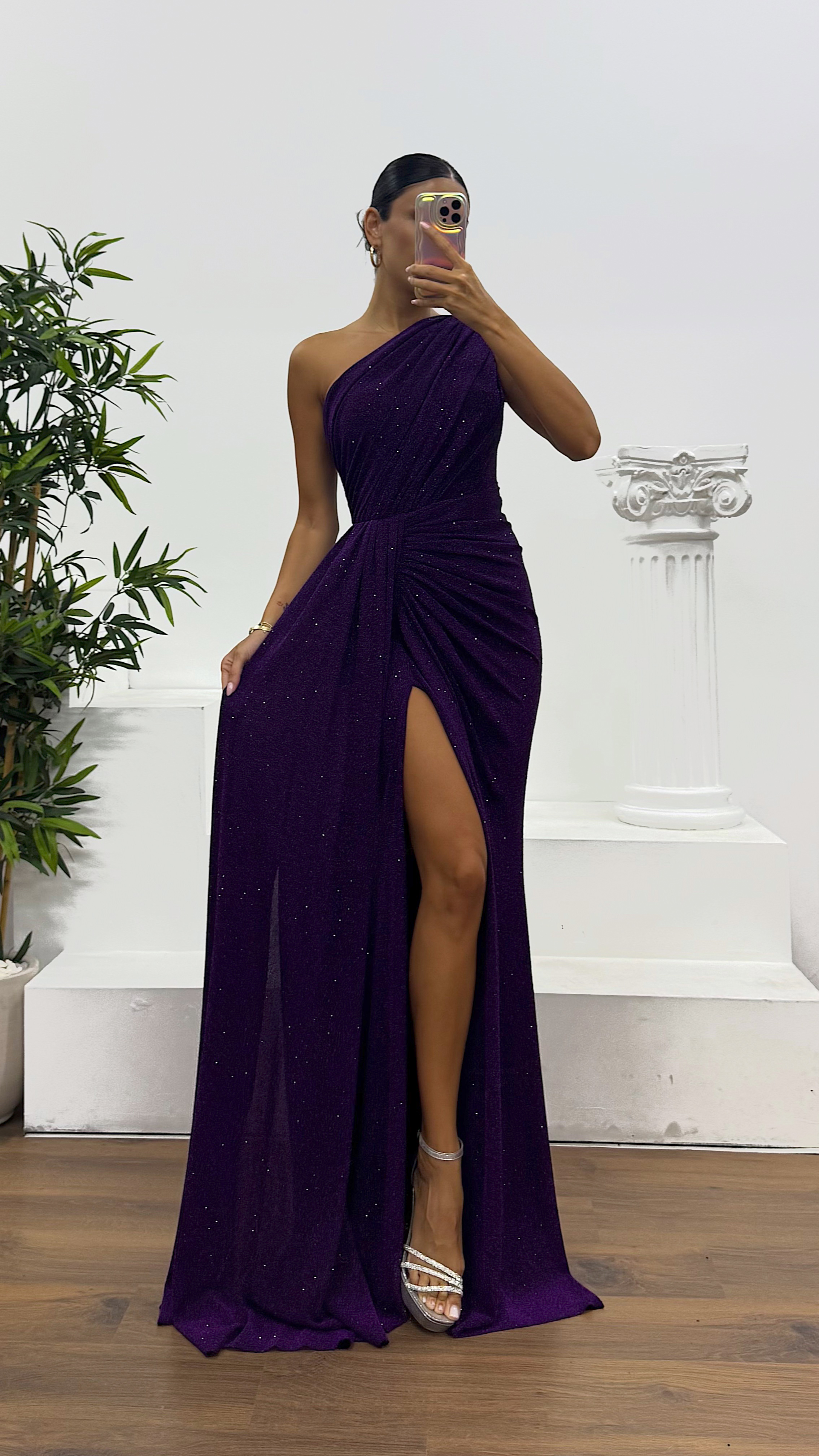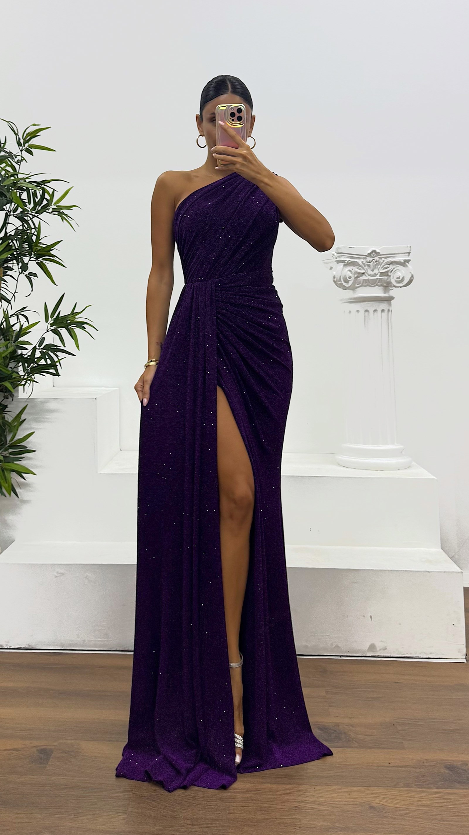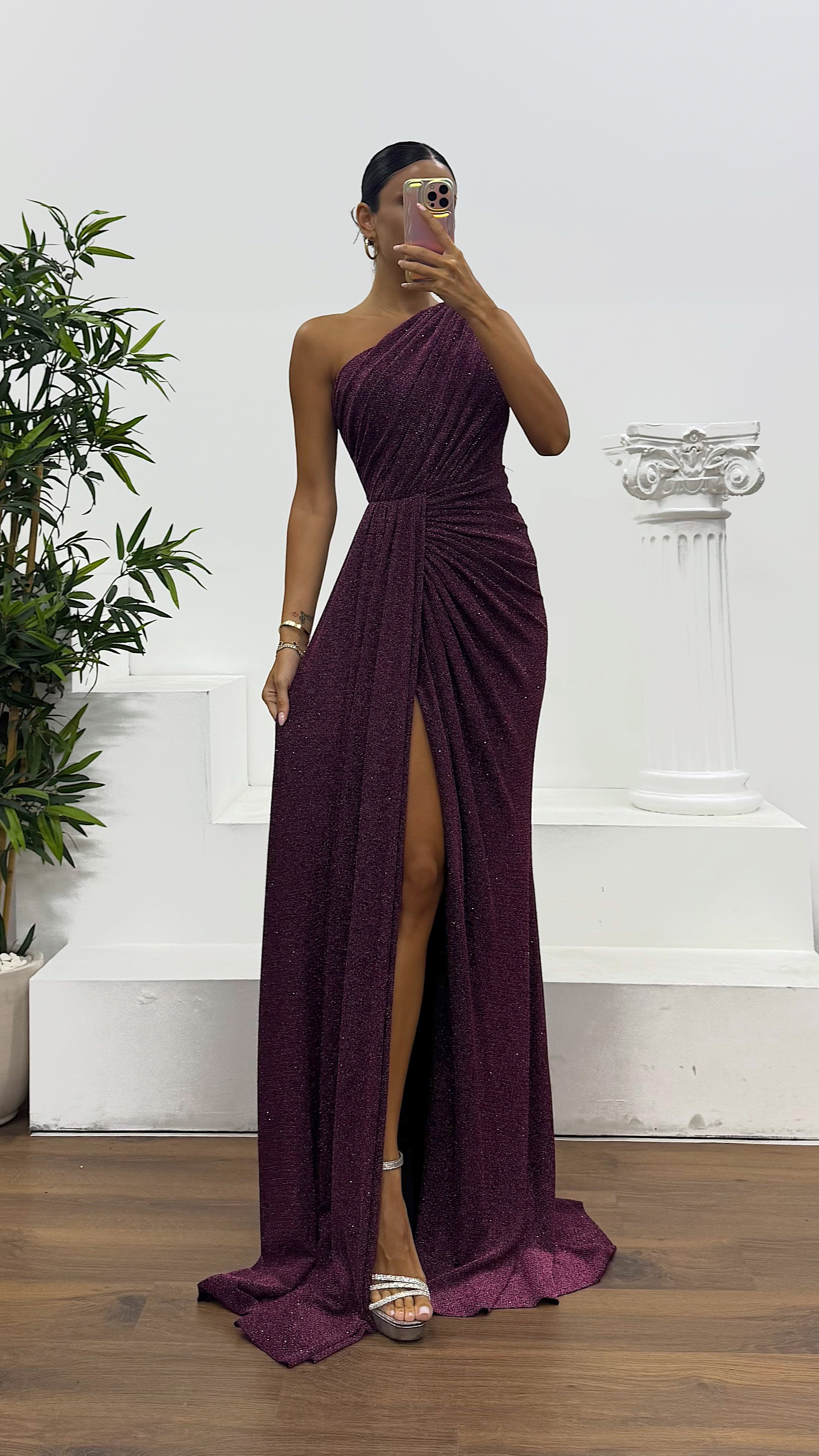 • Mürdüm Tek Omuz Simli Abiye Elbise
