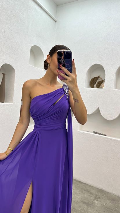 • Mor Tek Omuz Taş İşlemeli Drapeli Abiye Elbise
