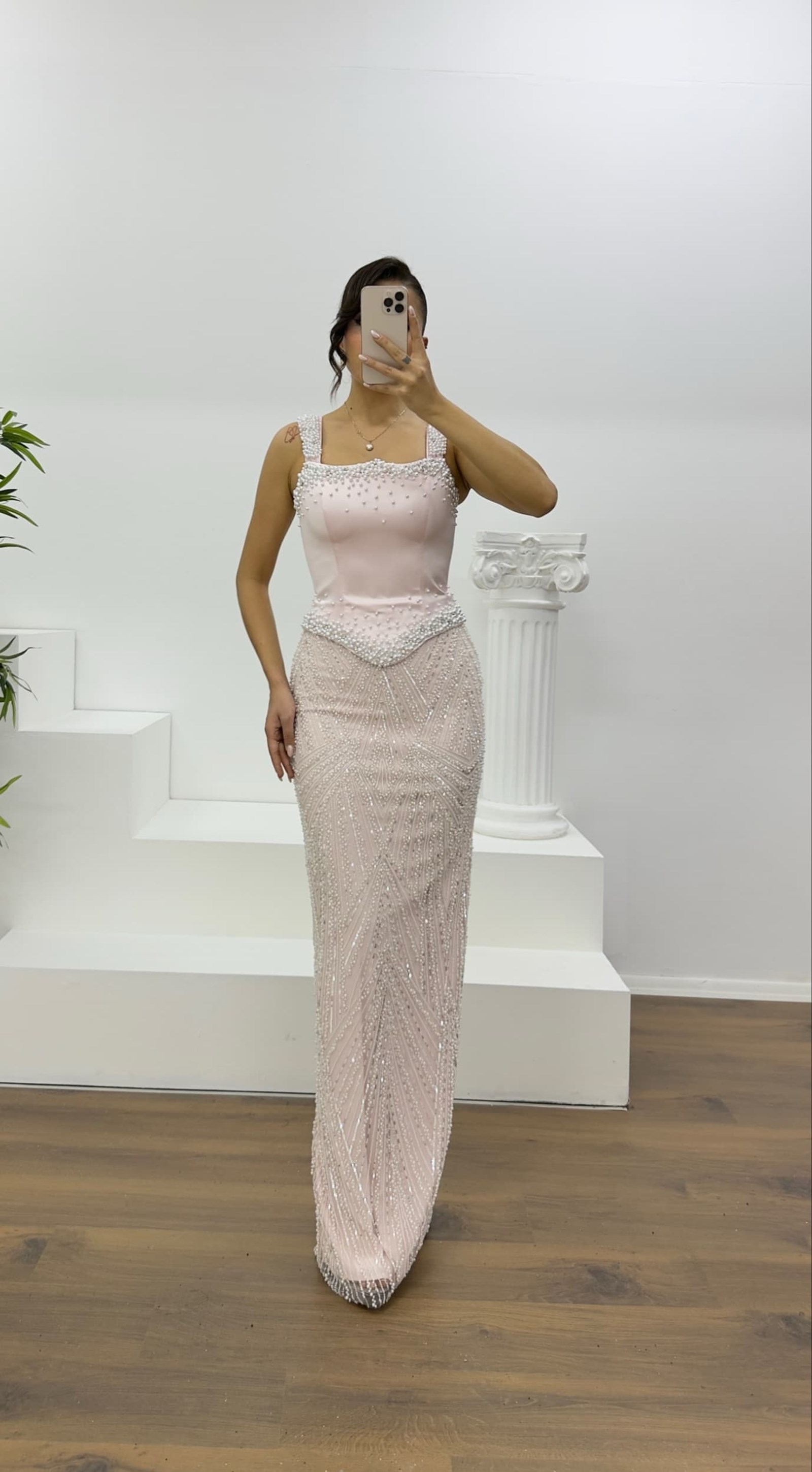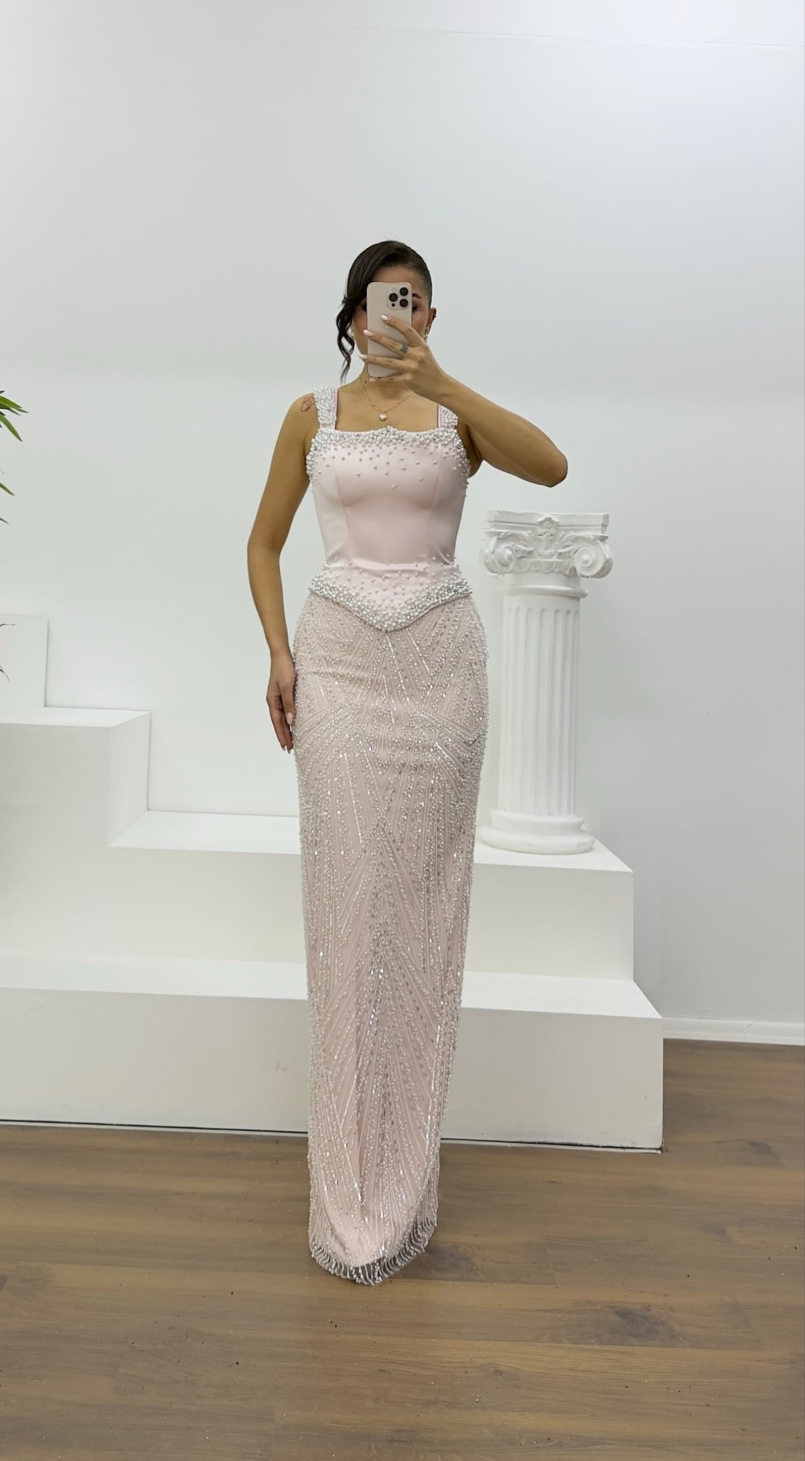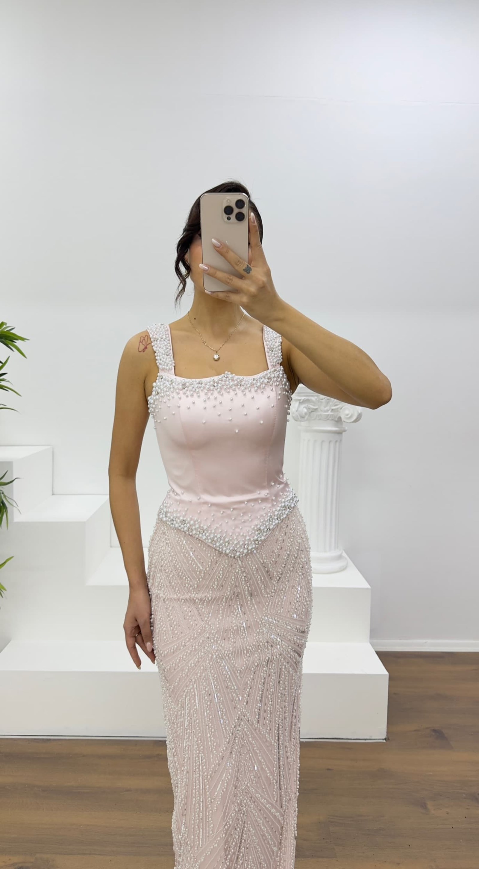• Pudra Boncuk İşlemeli Abiye Elbise
