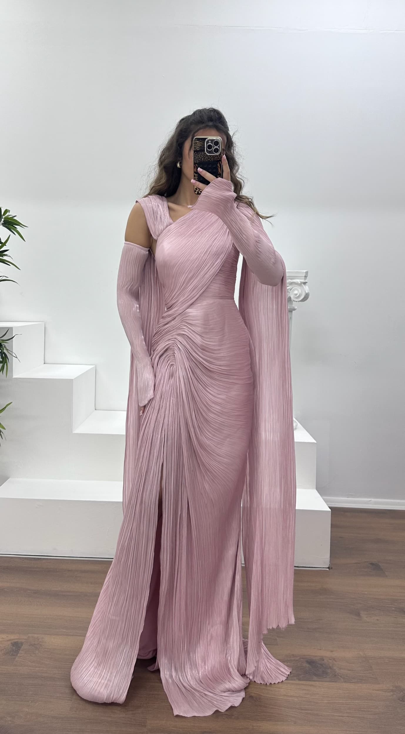 Pleated evening dress with glove detail The product is suitable for sizes 36–44. It features padded cups, lining, a back zipper closure, and a slit design. Product length: May vary between 170–175 cm. Fabric type: Chiffon – 66% viscose, 34% polyester An ideal choice to stand out with elegance at weddings, engagements, graduations, or special events.