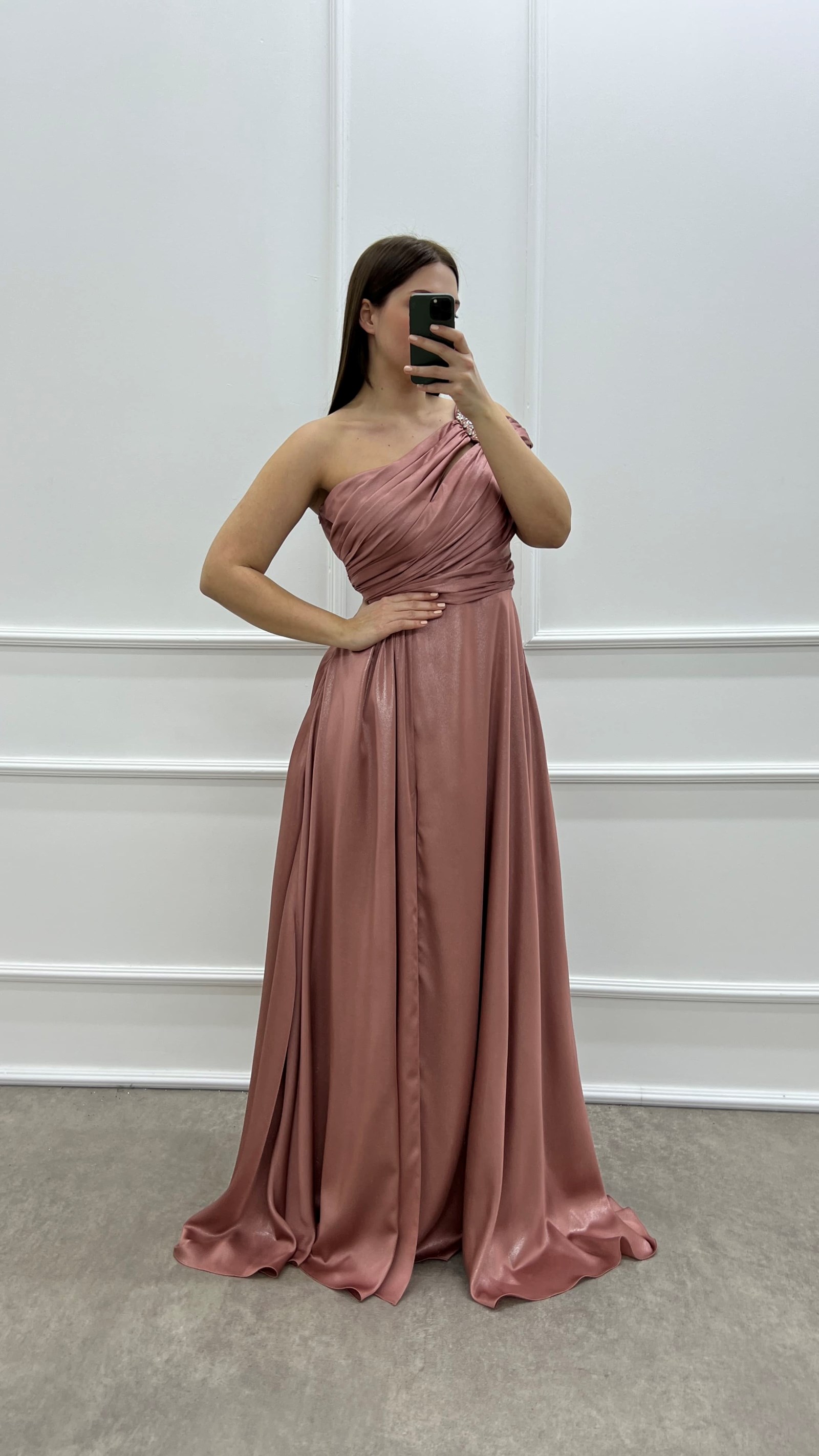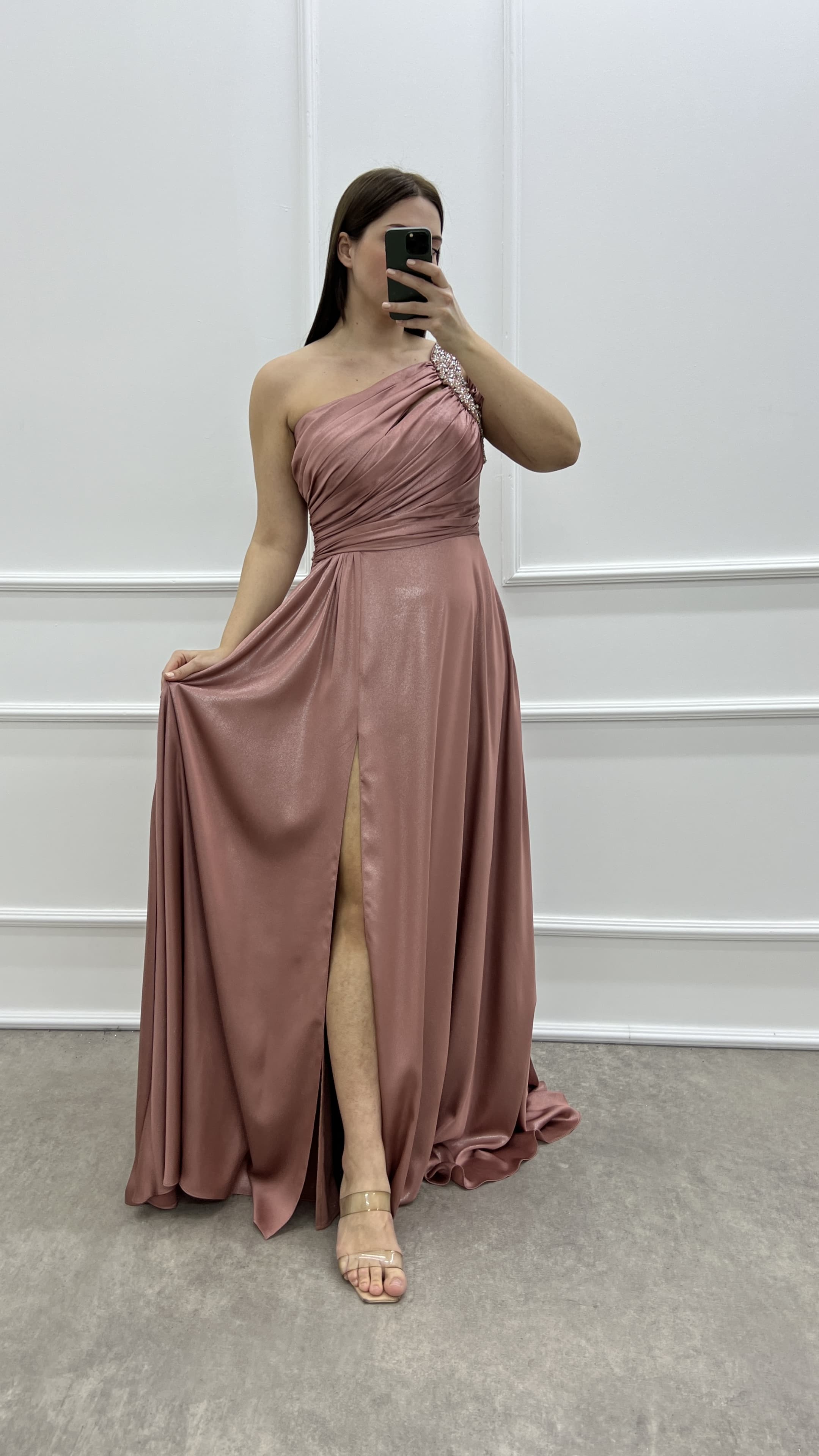 • Pudra Tek Omuz Taşlı Tasarım Saten Büyük Beden Abiye Elbise
