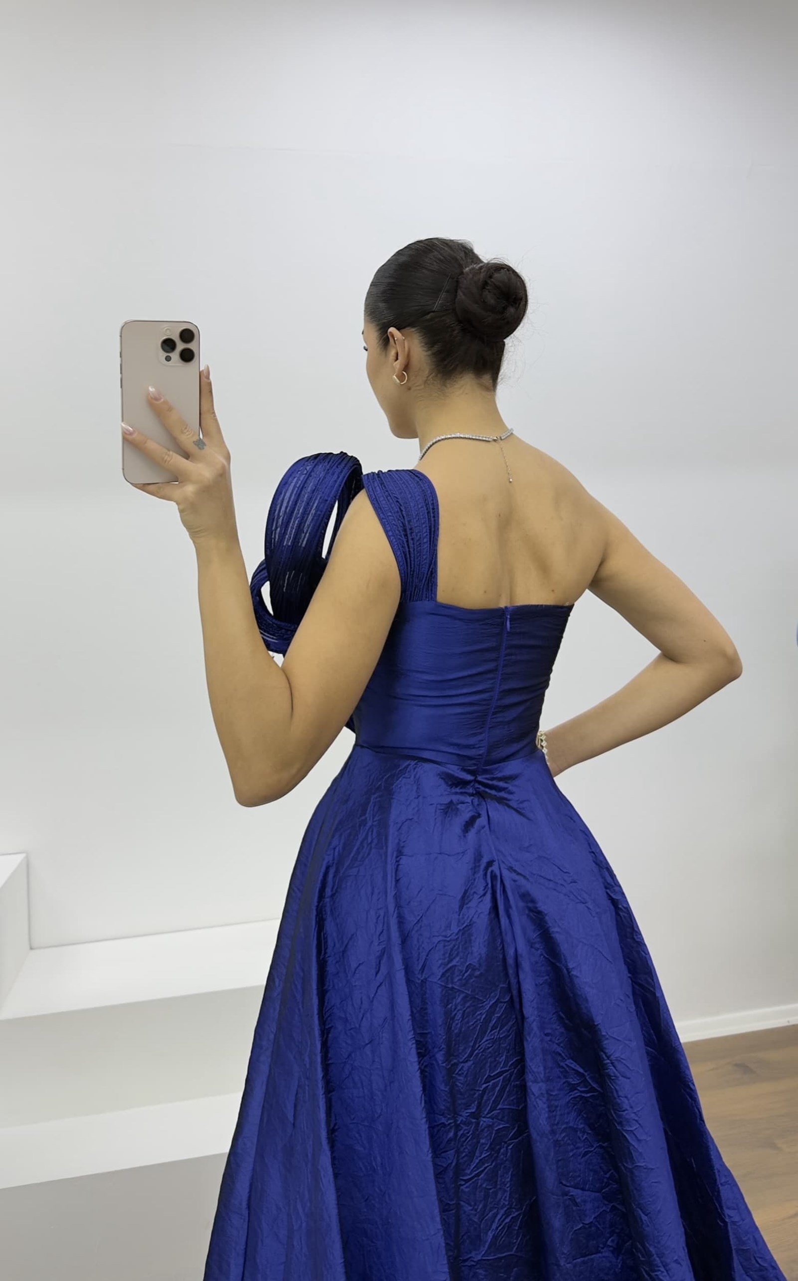 One-Shoulder Evening Dress The product is suitable for sizes 36–42. Designed as a draped evening dress with built-in bust cups, lining, and a back zipper closure. Product length may vary between 170–175 cm. Fabric type: Taffeta, 100% polyester. An ideal choice to stand out with elegance at weddings, engagements, graduations, or special events.