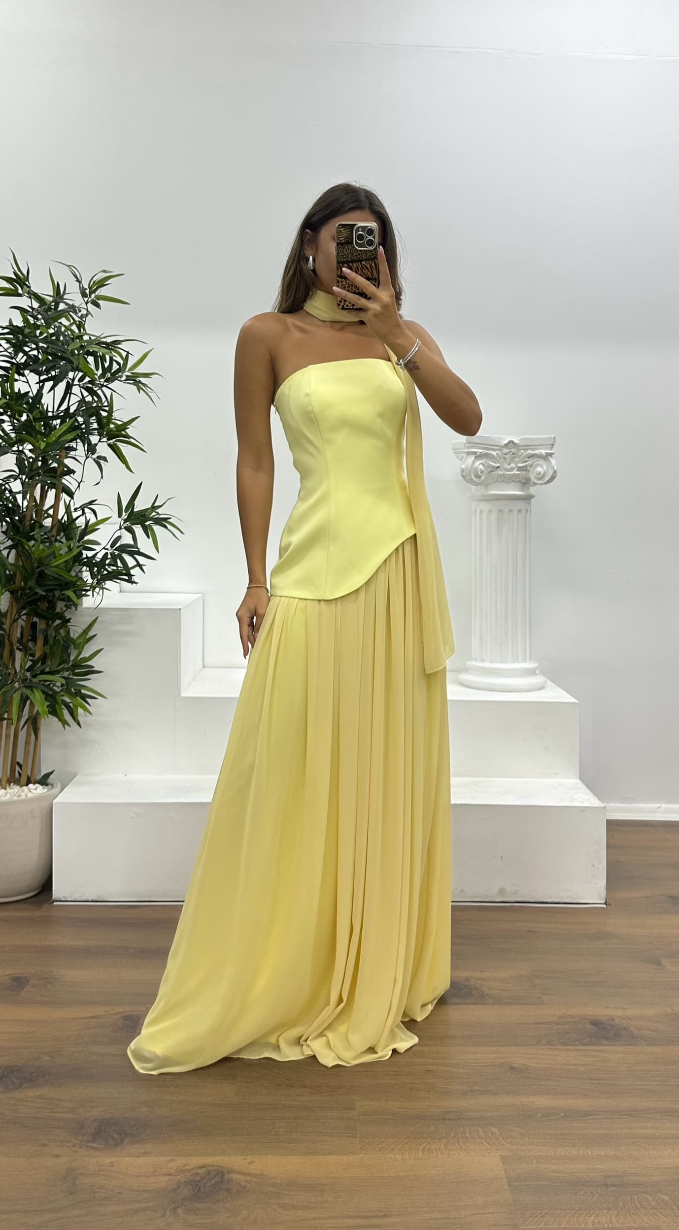 Chiffon Detailed Evening Dress The product fits sizes 36 to 44, features built-in bust pads, is fully lined, has a back zipper and criss-cross straps, and includes a shawl detail as part of its design. Product length: May vary between 170-175 cm. Fabric composition: Atlas 100% polyester - Chiffon 66% viscose, 34% polyester.