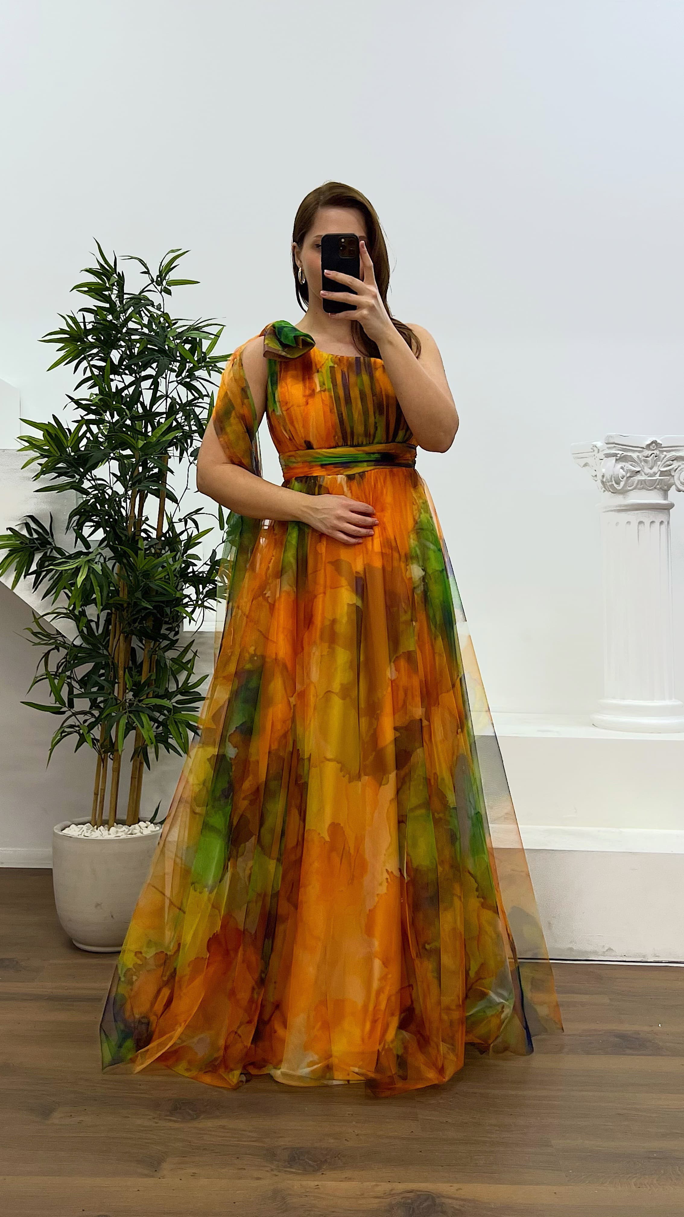 • Sarı Tek Omuz Büyük Beden Tül Abiye Elbise