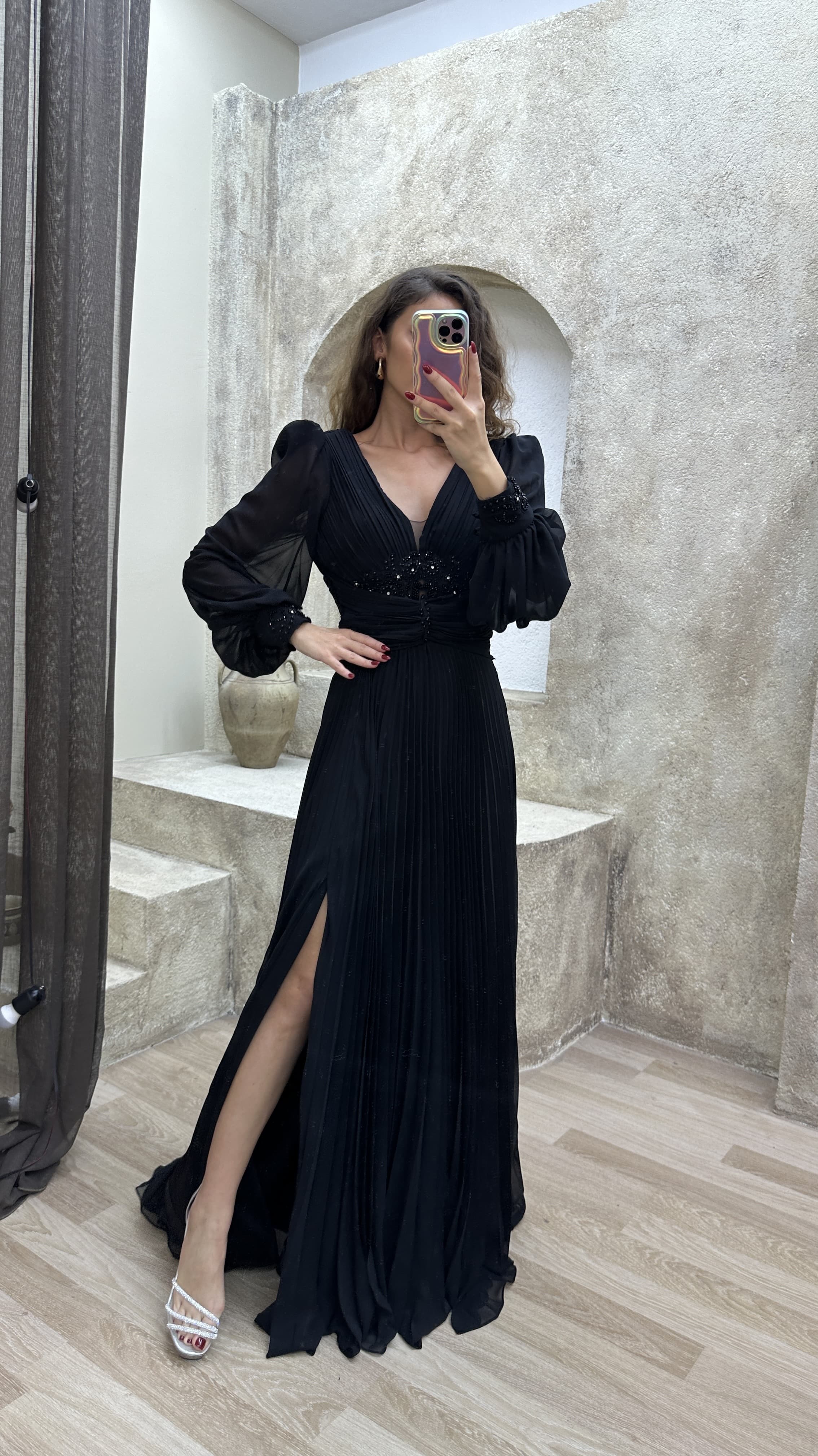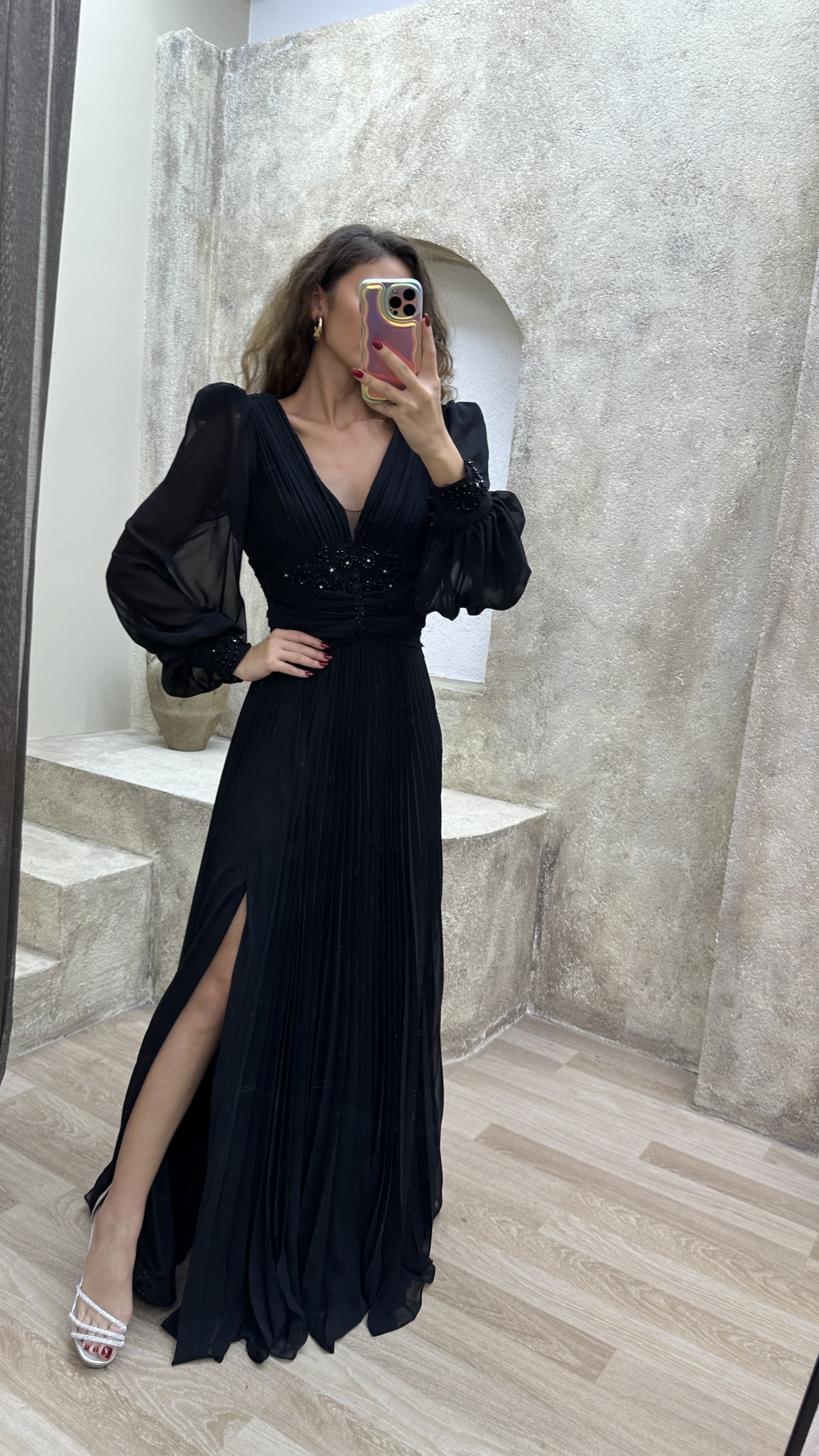 • Siyah Balon Balon Kol Pliseli Bel Detay Tasarım Abiye Elbise