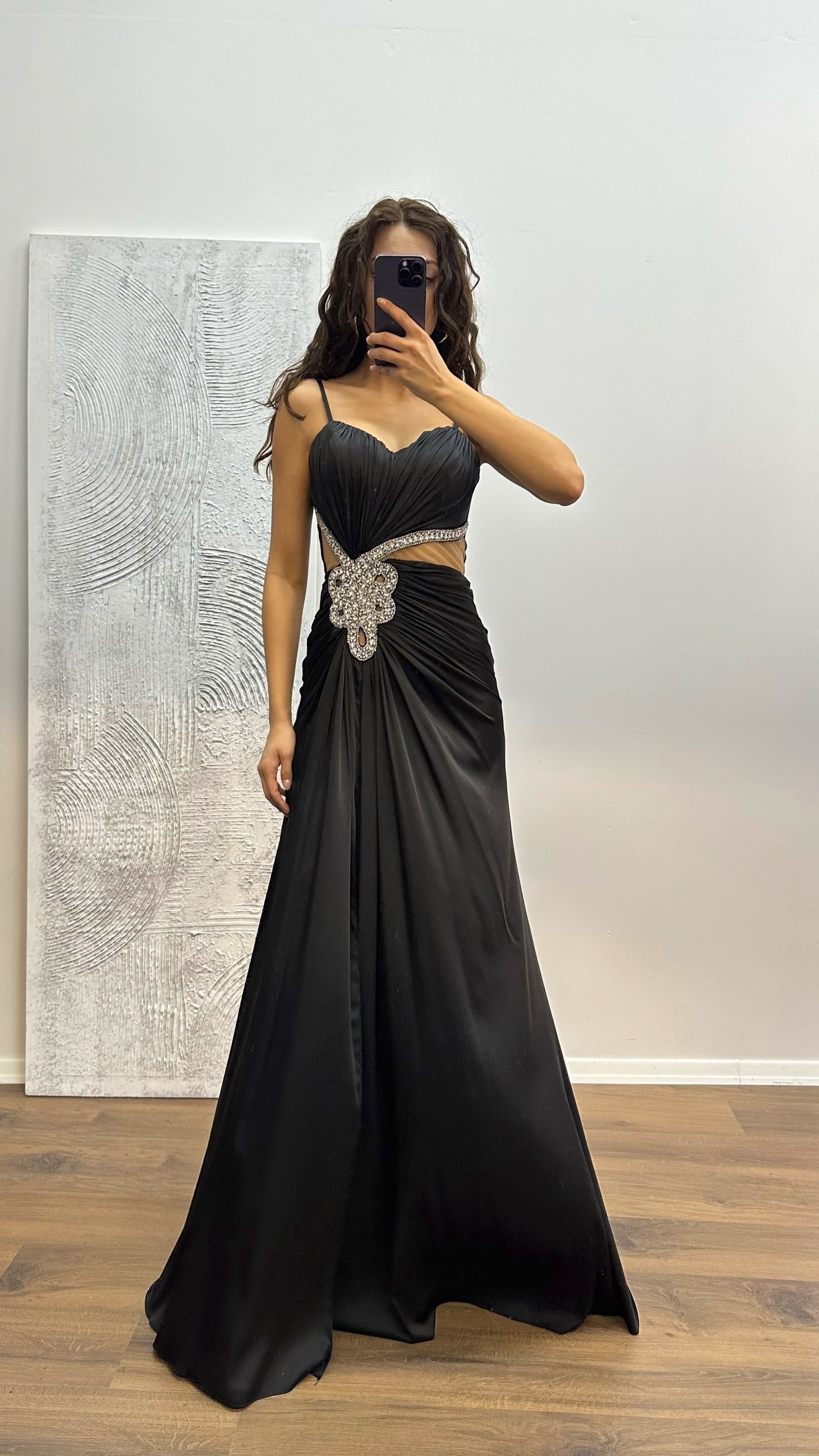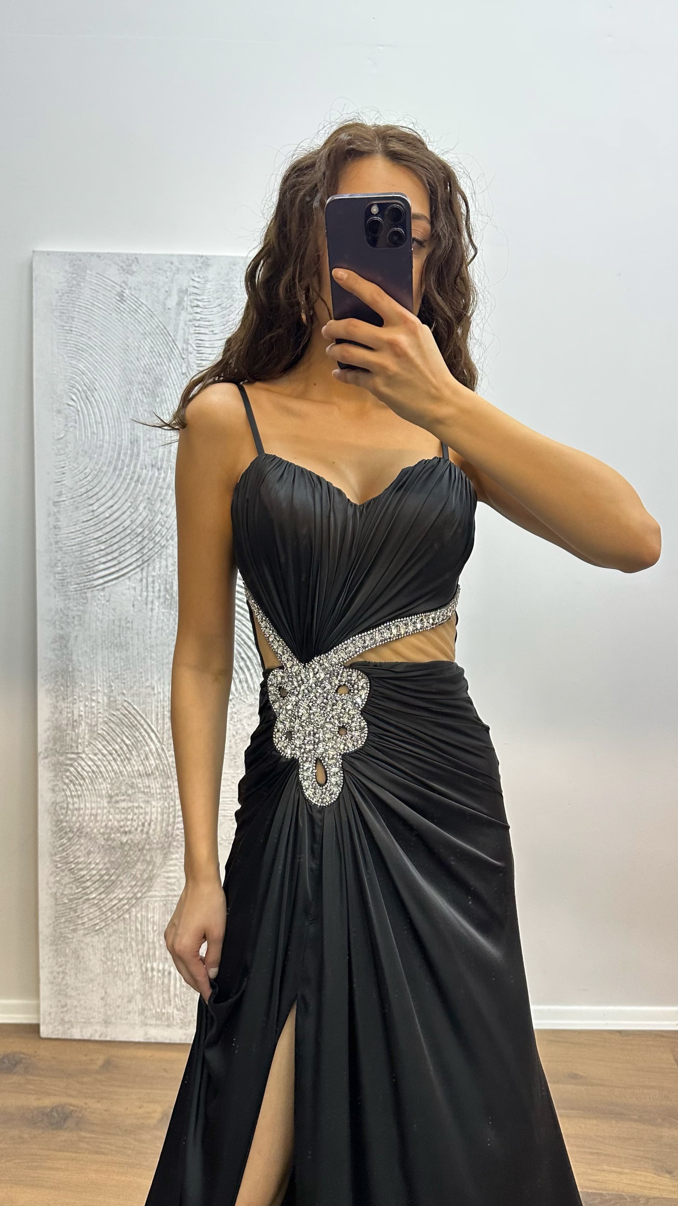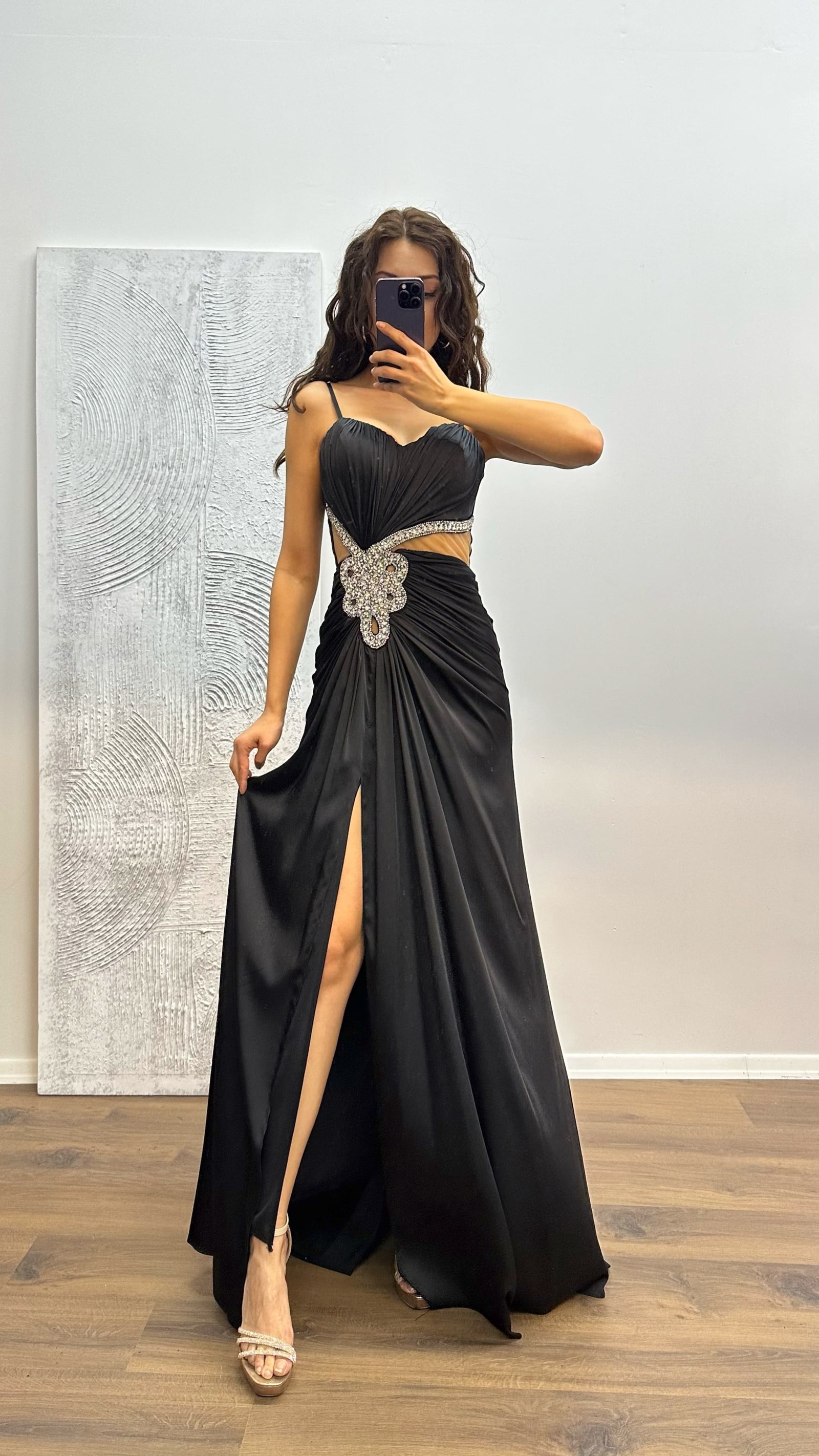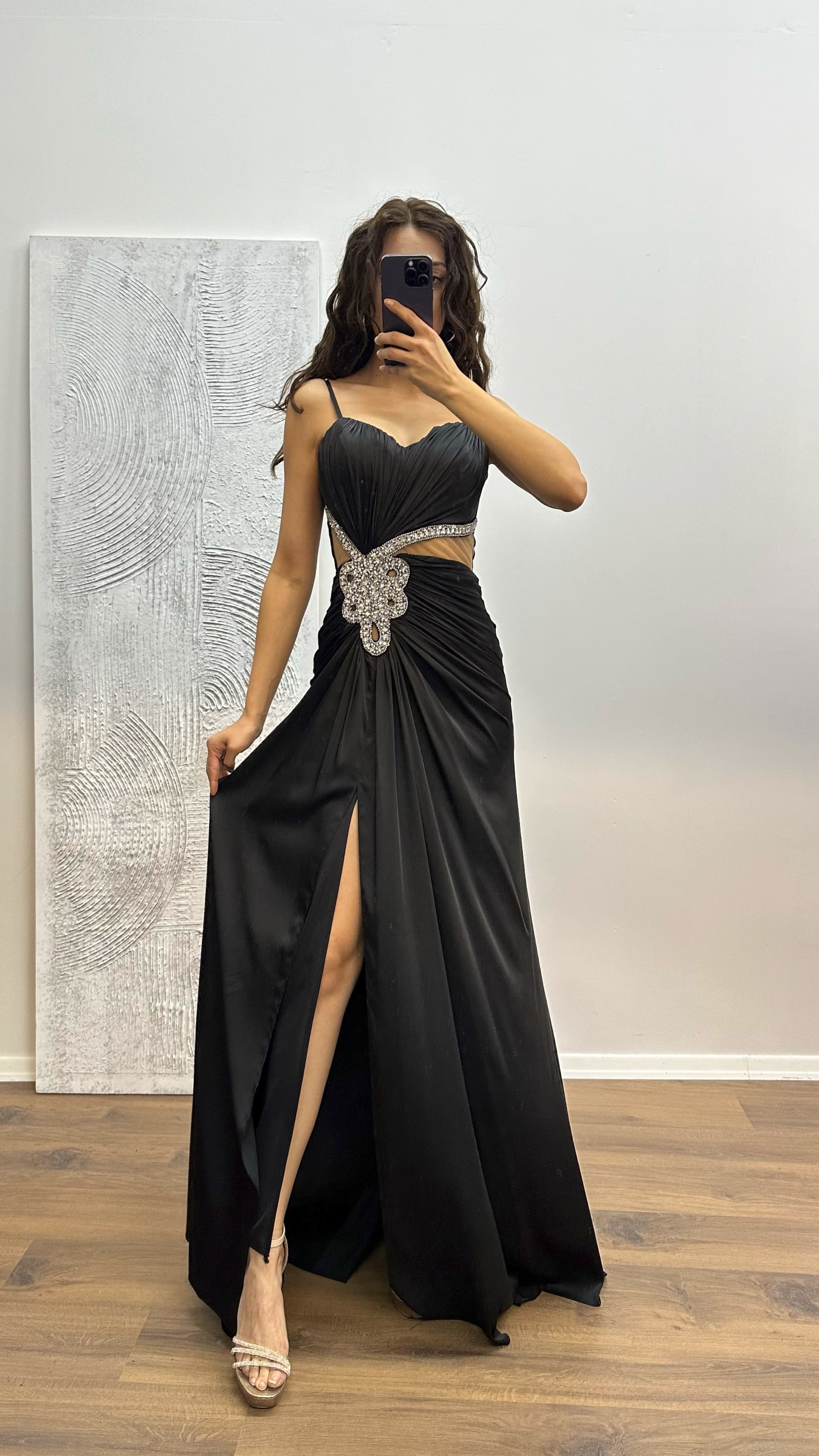 Embroidered Detail Evening Dress The product is suitable for sizes 36 to 42, features padded cups, is lined, with a cross-back lace-up and zipper closure, slit detail, transparent and embroidered design. Product length: Varies between 165-170 cm. Fabric type: Satin polyester, viscose.