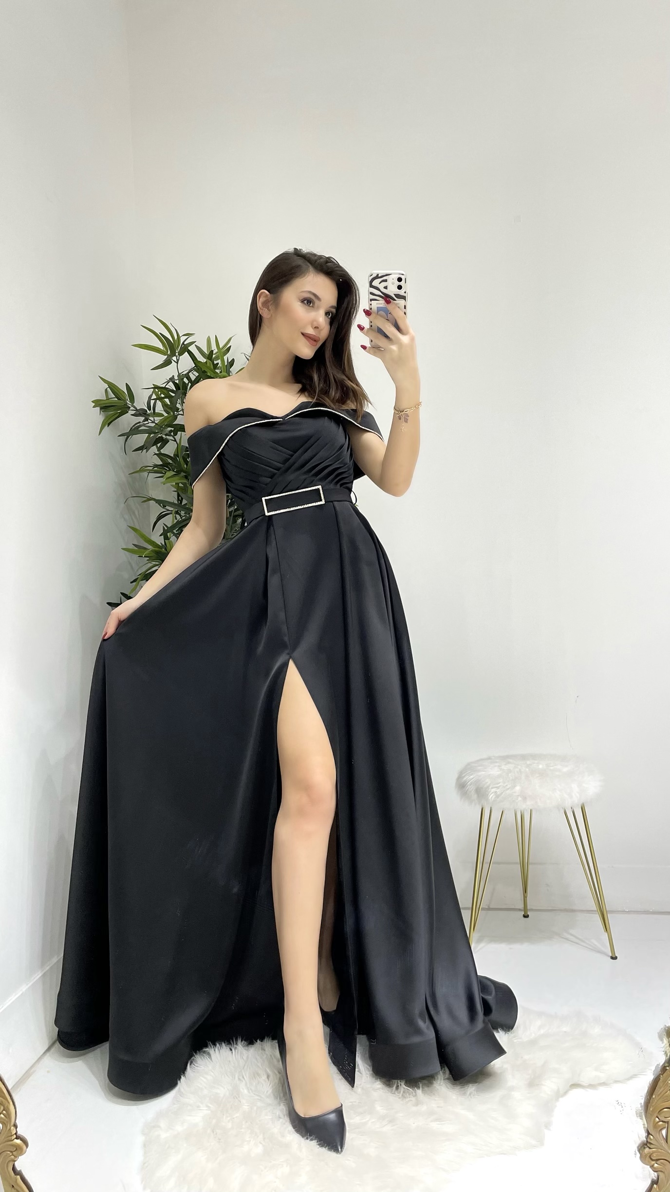 Siyah Kemerli Yırtmaçlı Uzun Abiye Elbise