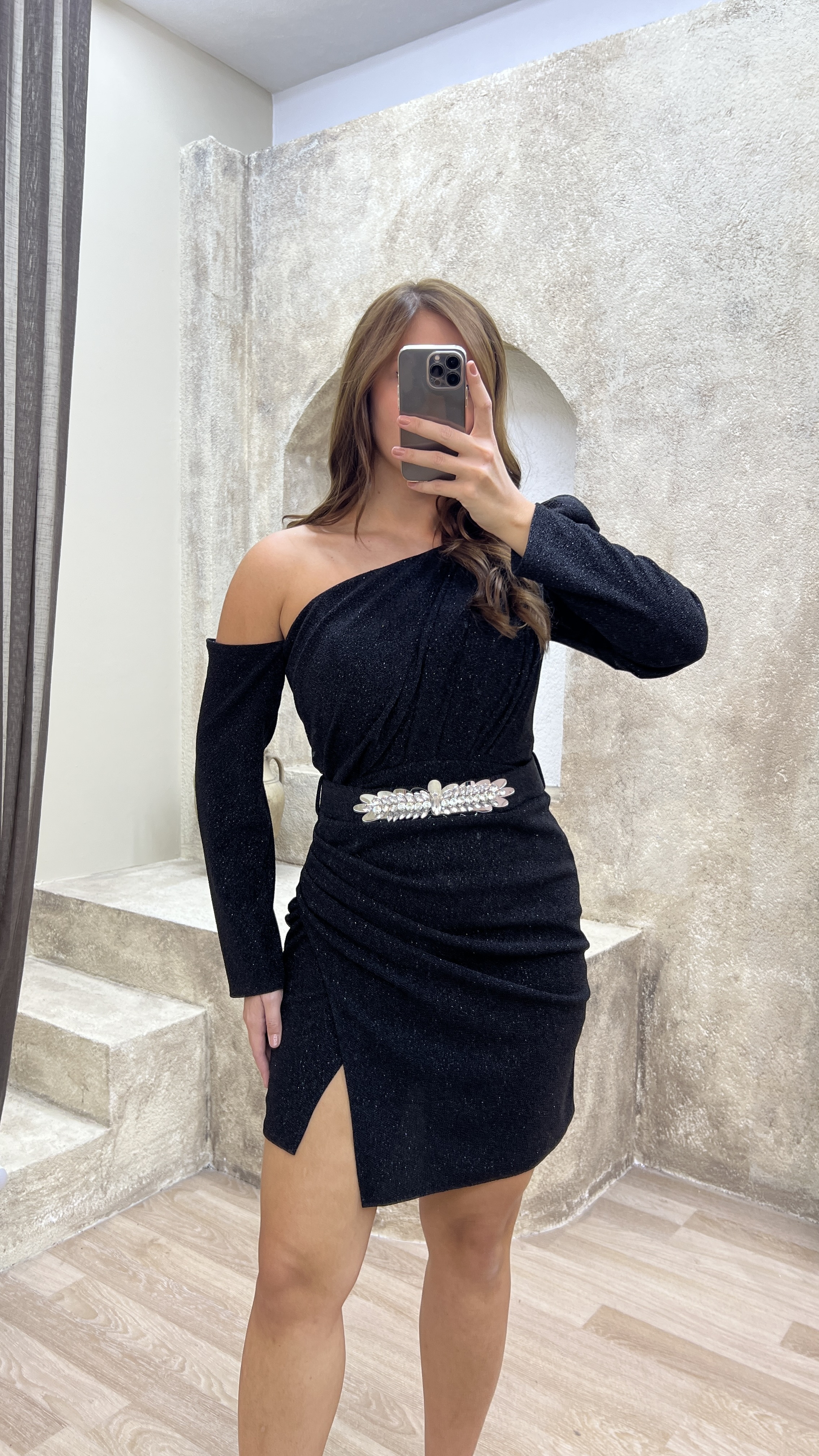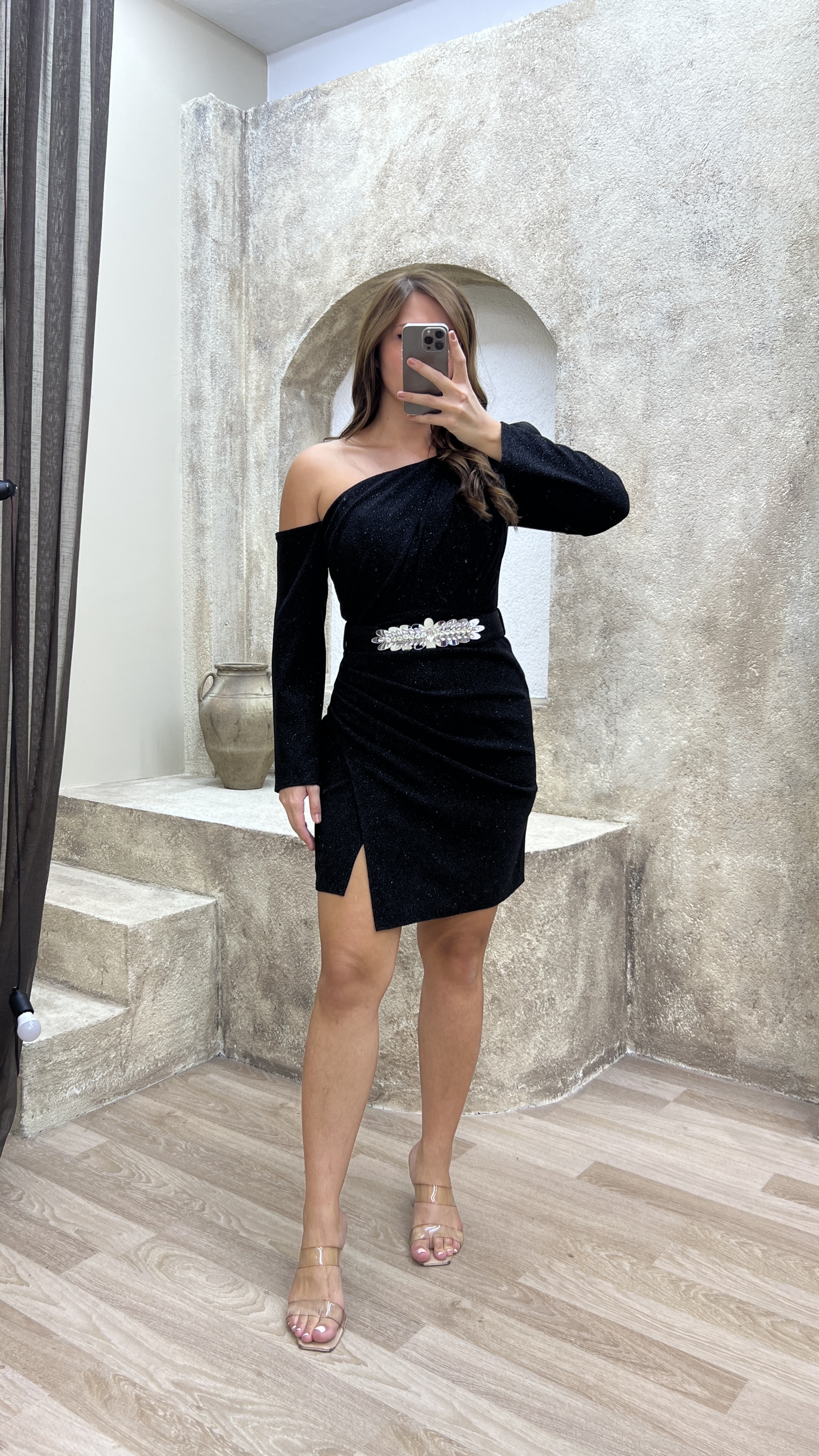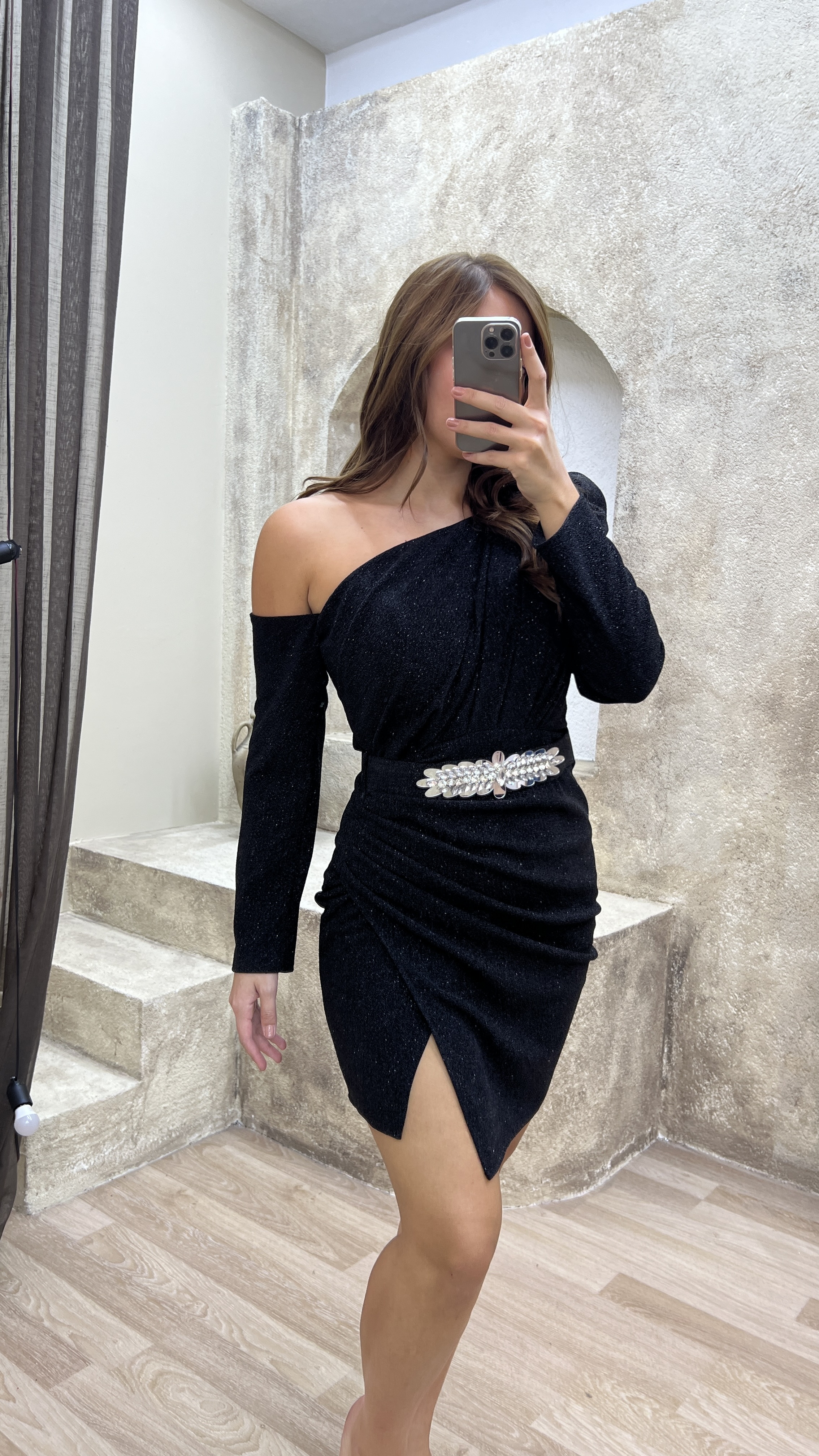 • Siyah Omuz Detay Simli Büyük Beden Abiye