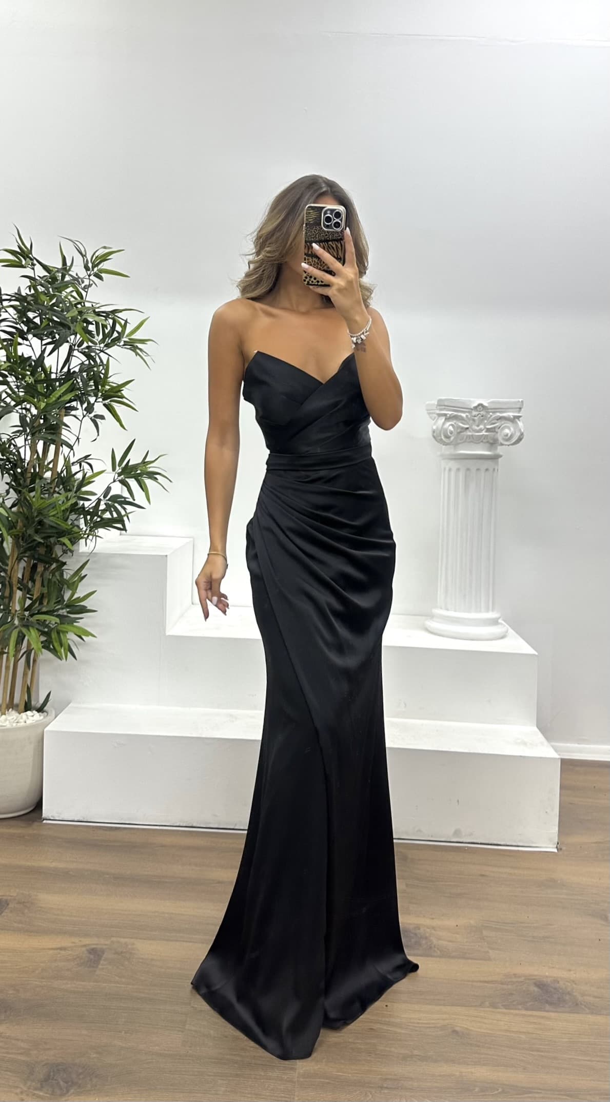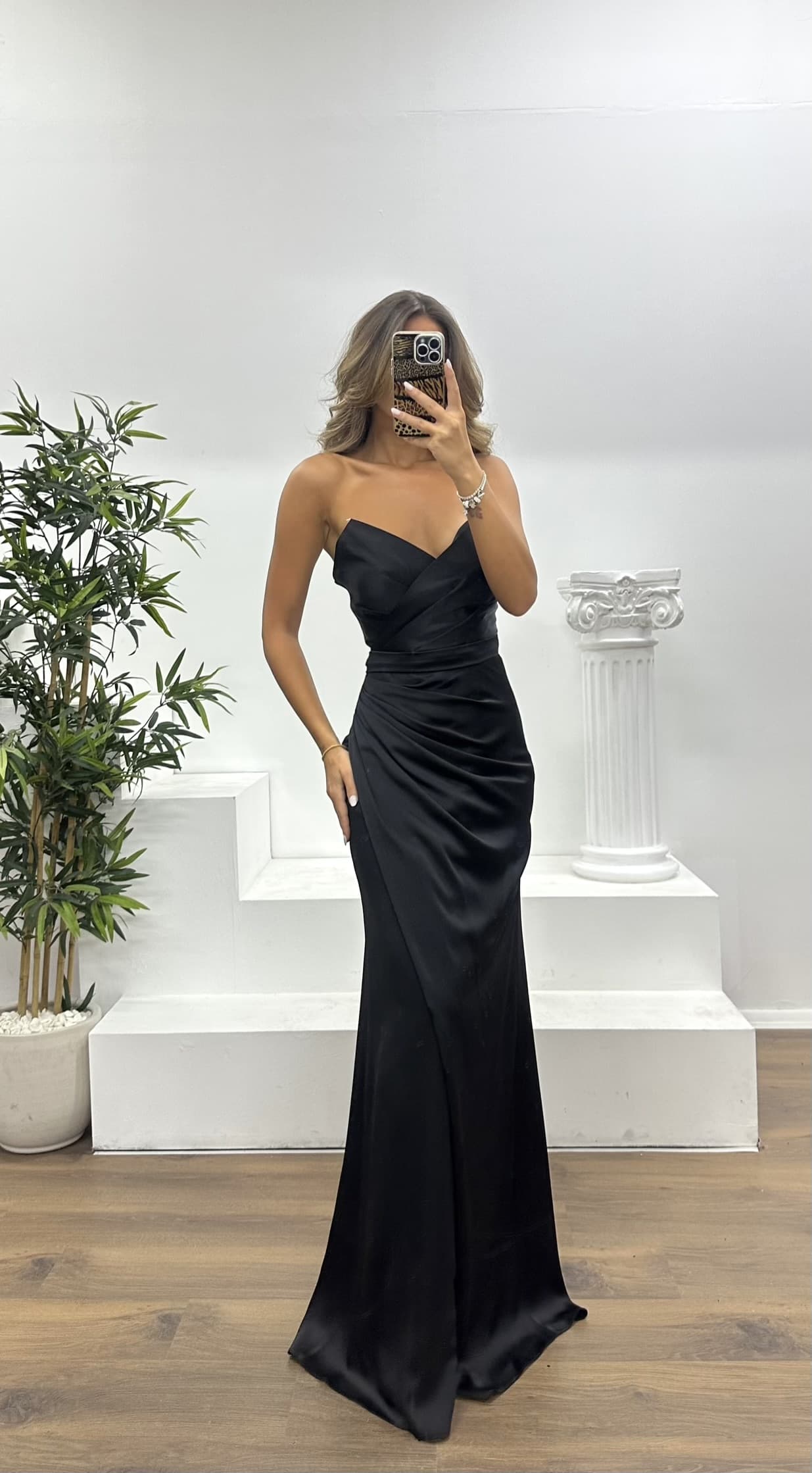 Strapless Draped Evening Dress The product is designed as a draped evening dress with a slit, inner lining, padded bust, and back zipper closure. It fits sizes 36 to 42. Product length: May vary between 170-175 cm. Fabric type: Satin polyester-viscose.