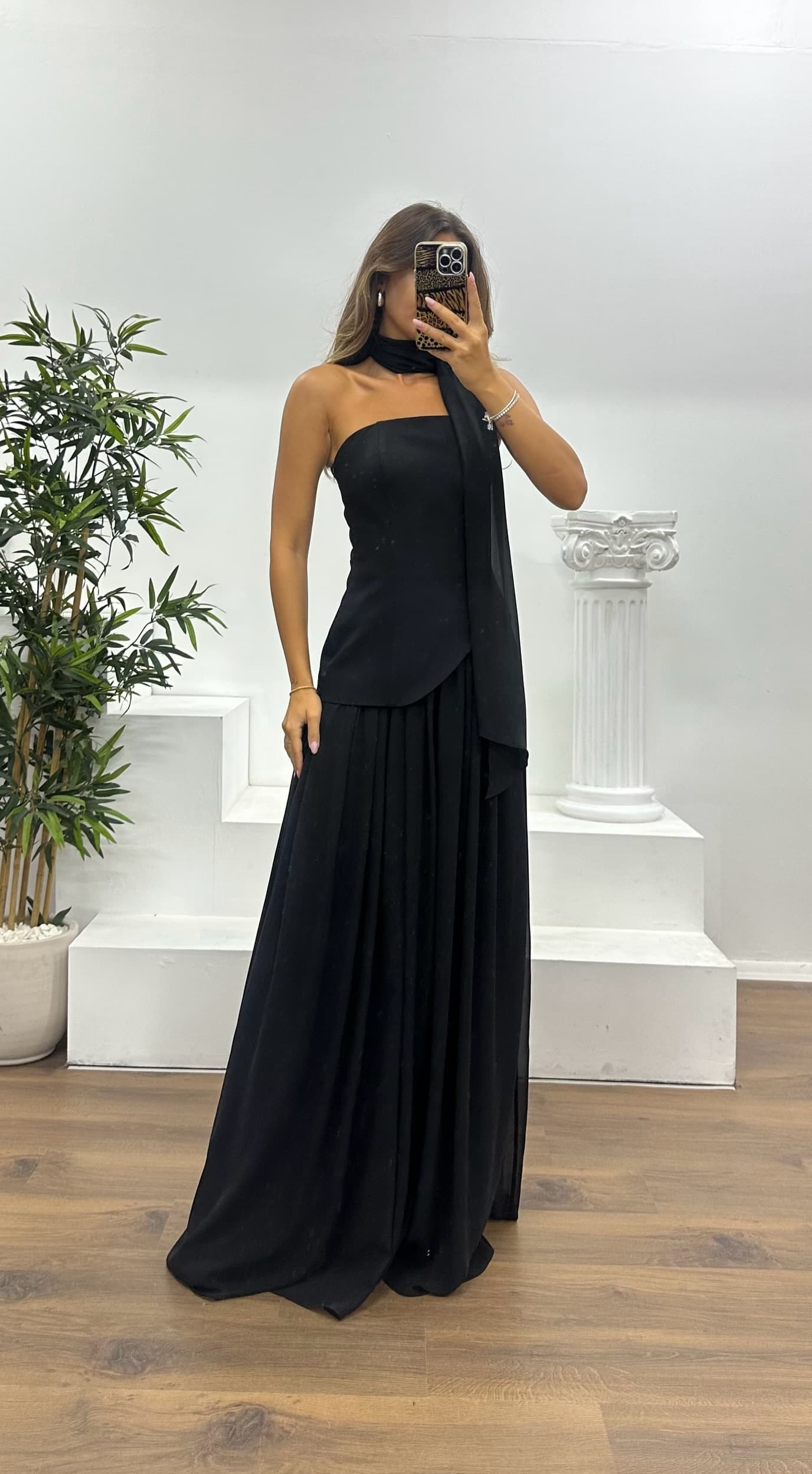 Chiffon Detailed Evening Dress The product fits sizes 36 to 44, features built-in bust pads, is fully lined, has a back zipper and criss-cross straps, and includes a shawl detail as part of its design. Product length: May vary between 170-175 cm. Fabric composition: Atlas 100% polyester - Chiffon 66% viscose, 34% polyester.