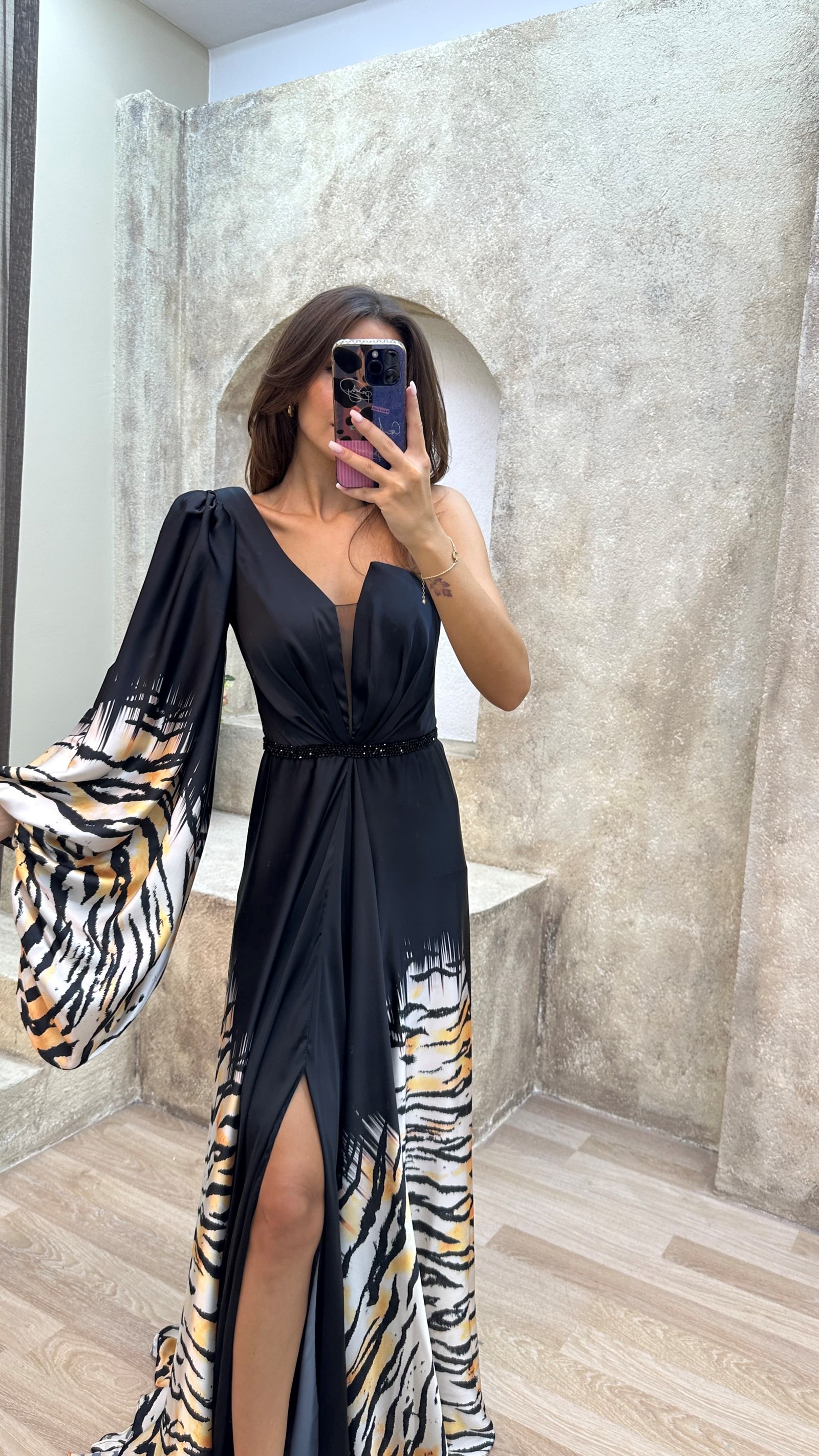 • Siyah Tek Omuz Desenli Kol Detay Elbise