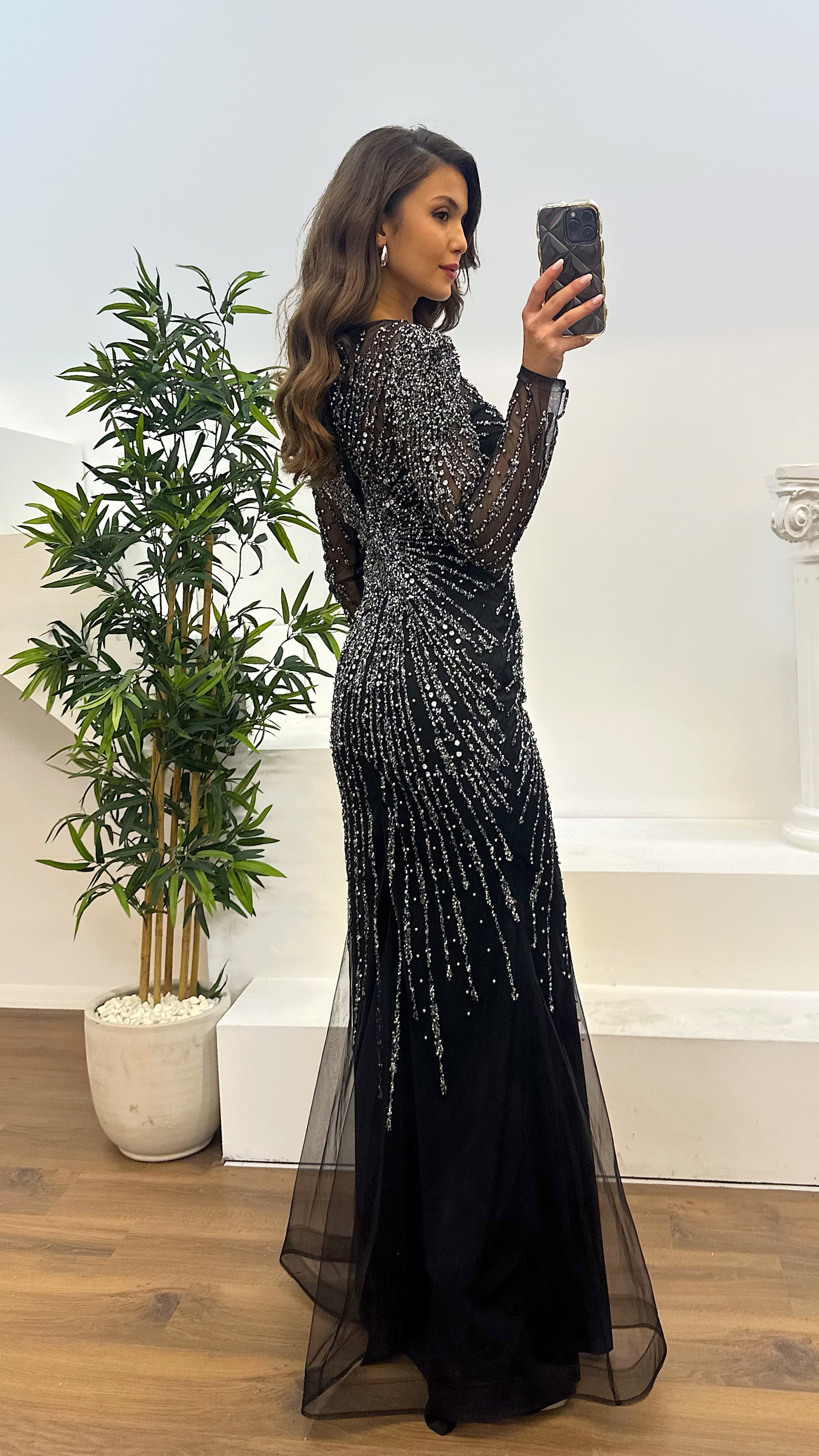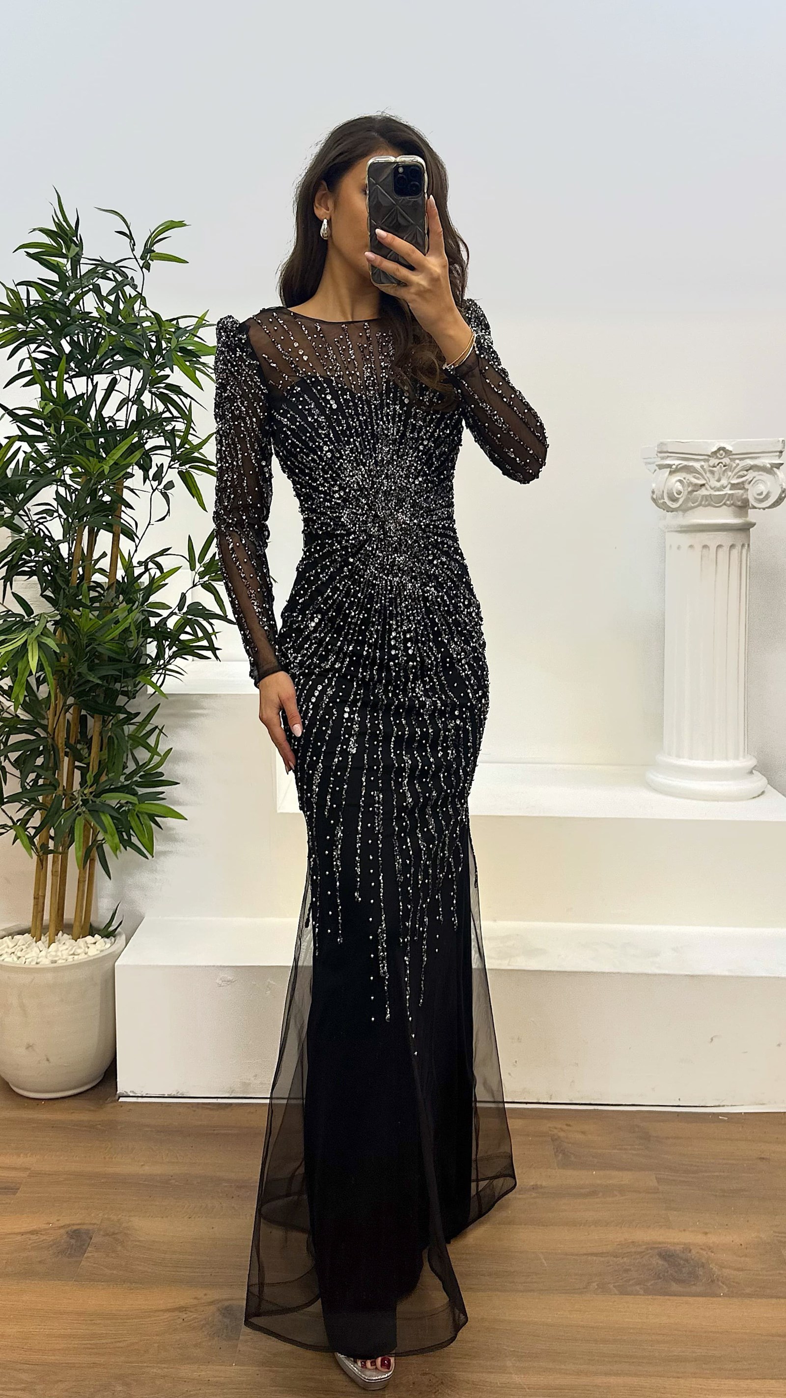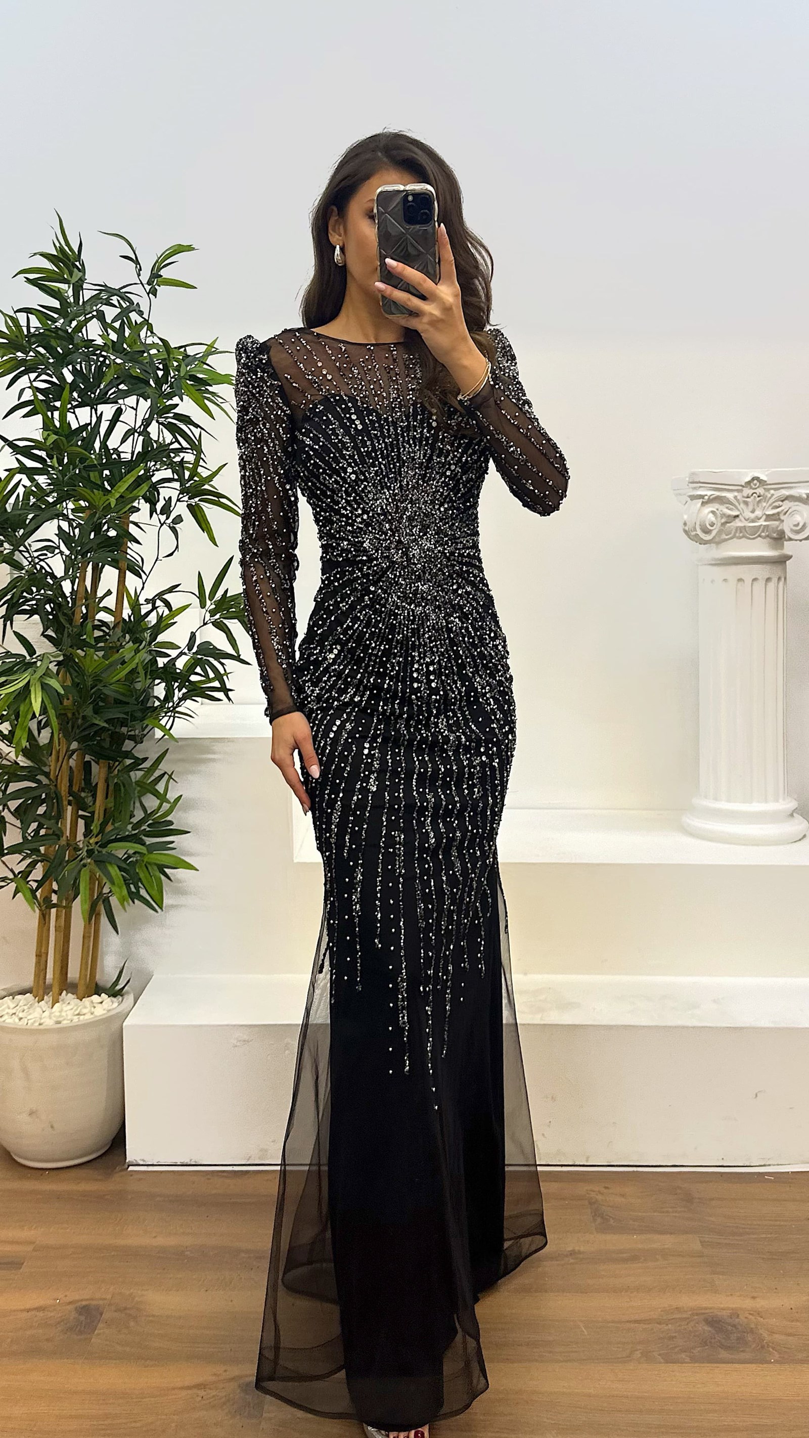 Embroidered Evening Dress The product is suitable for sizes 36 to 44, featuring breast padding, lined, with a back zipper closure, and designed as an embroidered evening dress. The product length may vary between 165-170 cm. The product sleeve length is 60 cm. Fabric type: tulle with 3% Lycra and 97% Polyester.