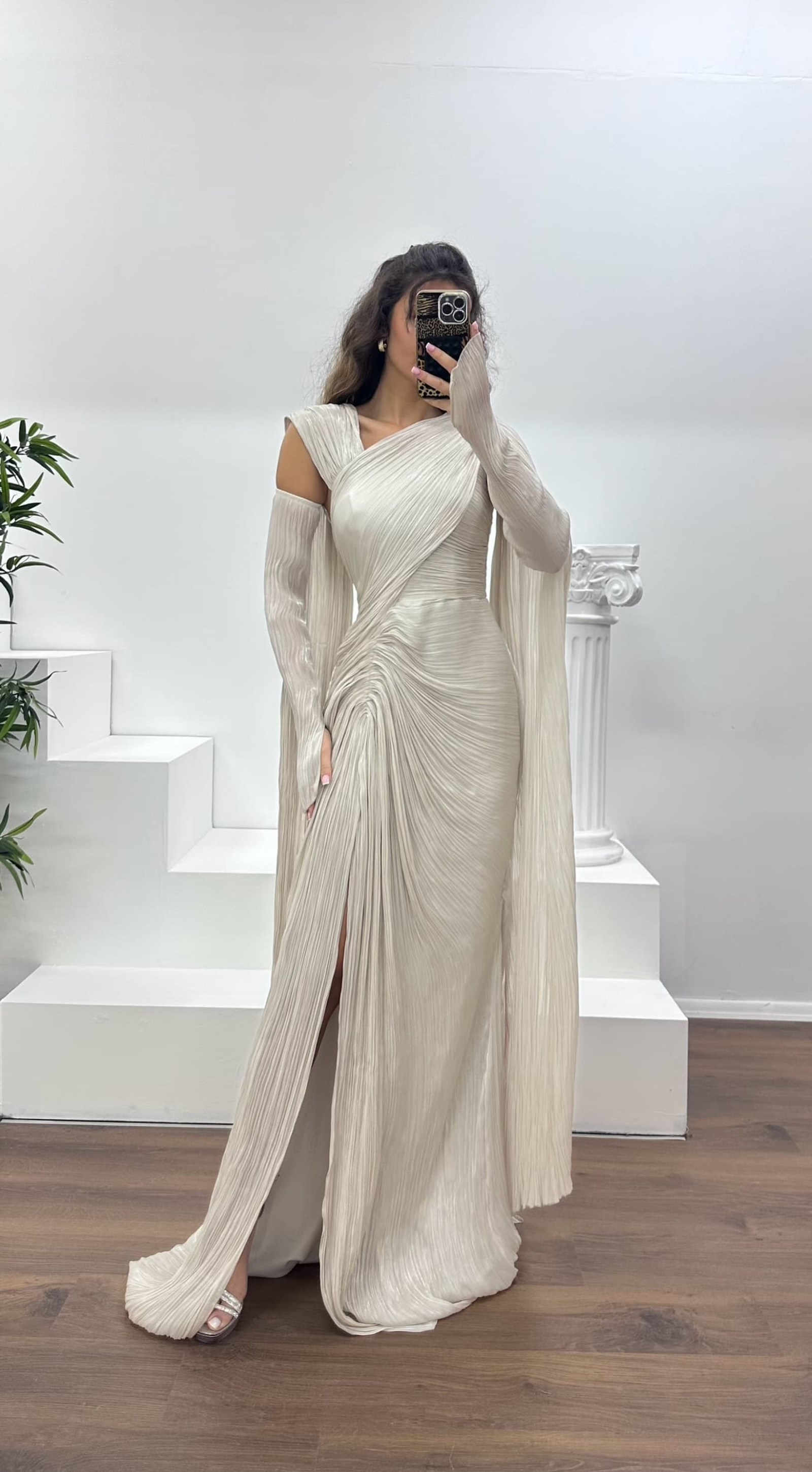 Pleated evening dress with glove detail The product is suitable for sizes 36–44. It features padded cups, lining, a back zipper closure, and a slit design. Product length: May vary between 170–175 cm. Fabric type: Chiffon – 66% viscose, 34% polyester An ideal choice to stand out with elegance at weddings, engagements, graduations, or special events.