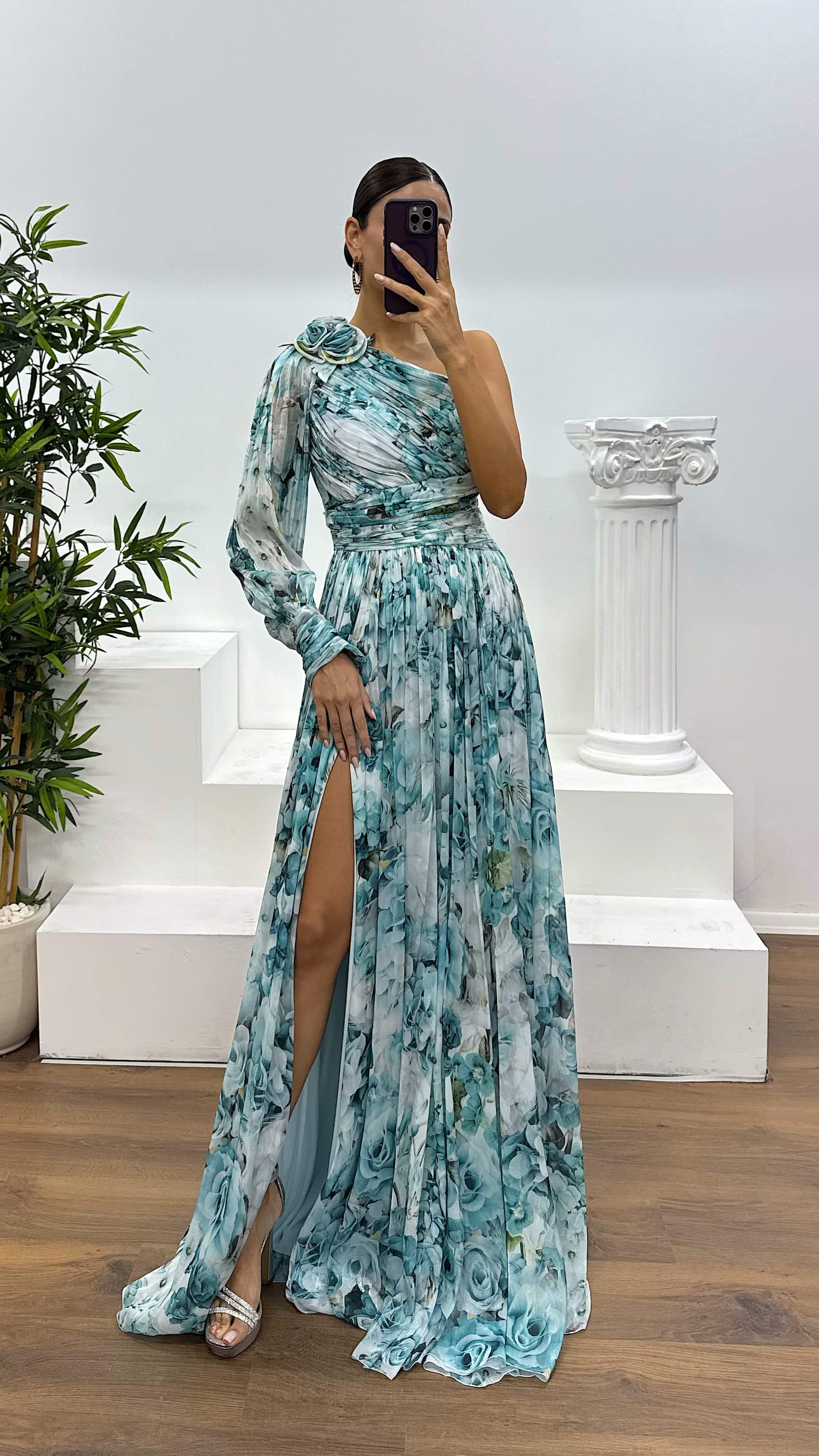 • Kemik Yeşil Tek Kol Desenli Abiye Elbise