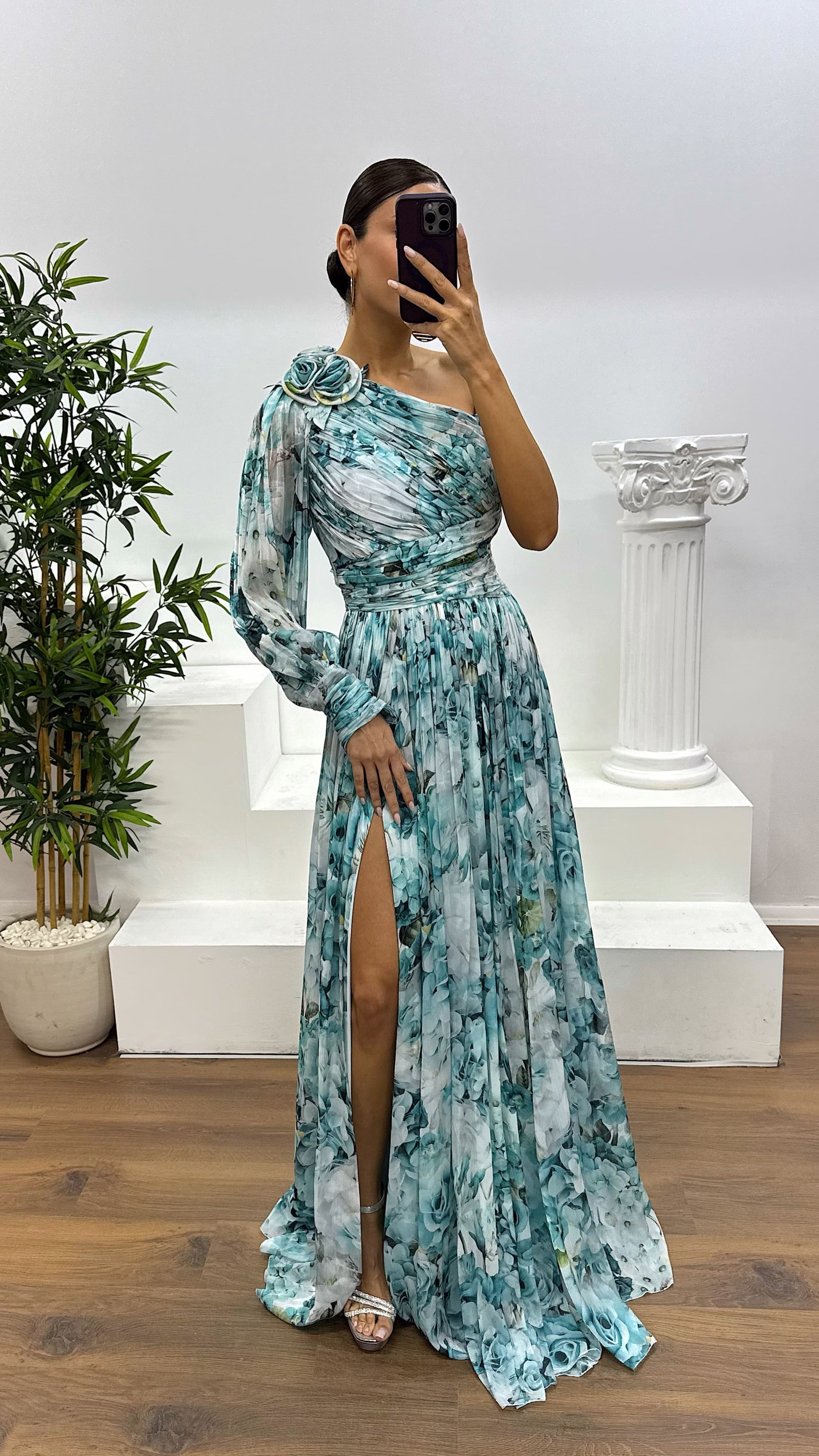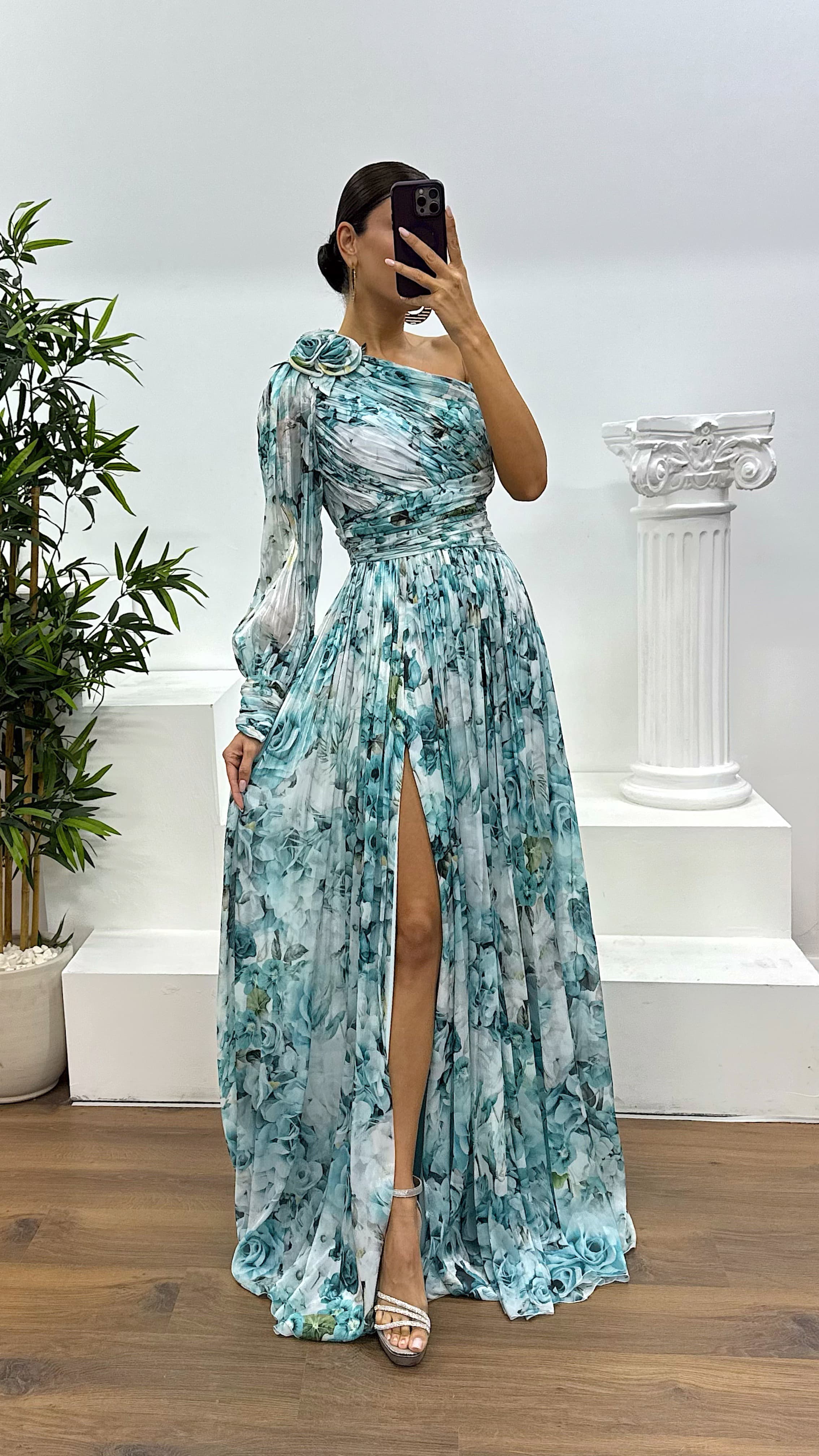 One-sleeve patterned evening dress with shoulder detail The product fits sizes 36 to 44, includes padded cups, is fully lined, features a back zipper, a slit, a zippered sleeve, and a shoulder detail design. Dress length: May vary between 170-175 cm Sleeve length: 60 cm Fabric composition: Chiffon – 66% viscose, 34% polyester