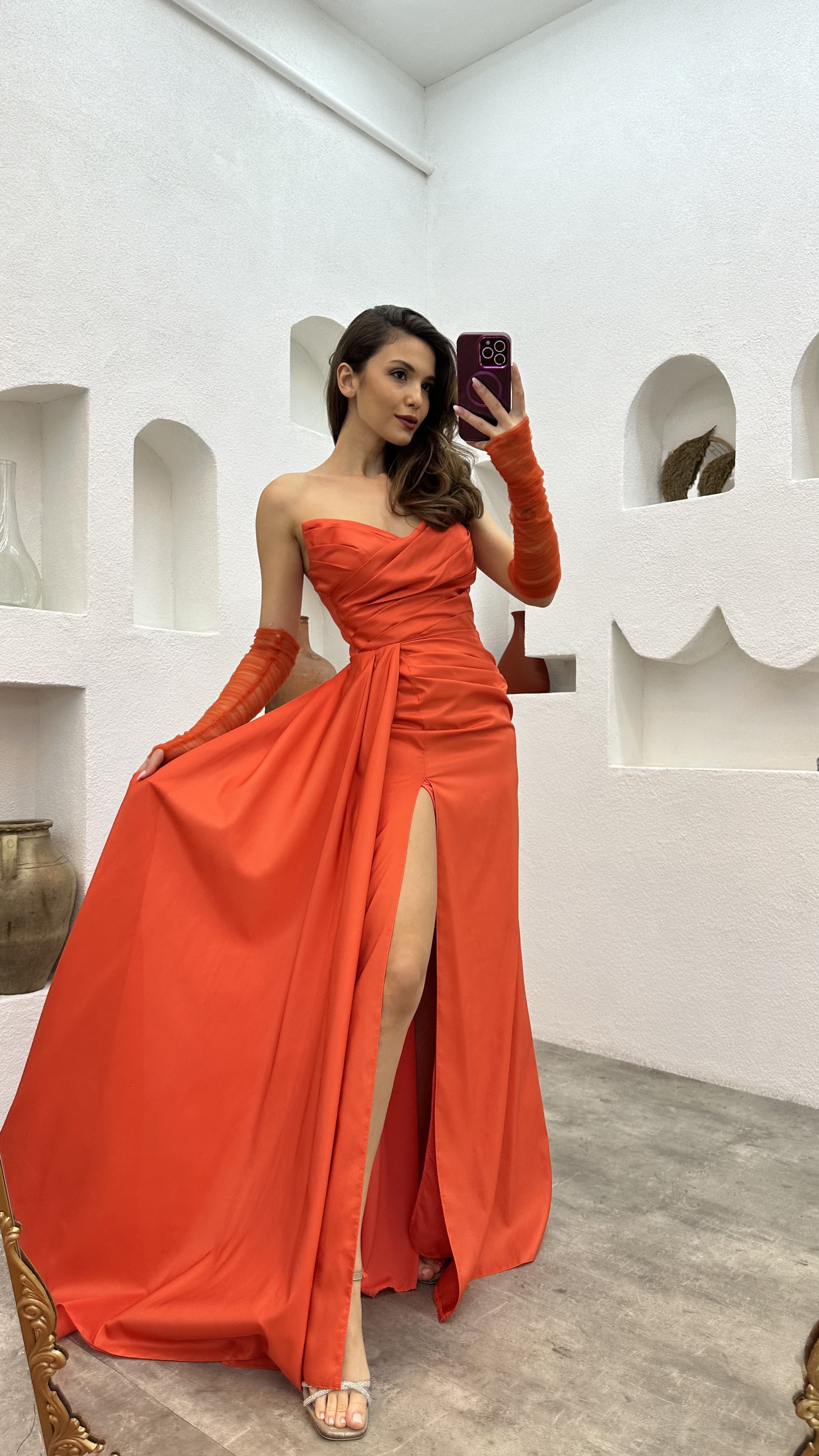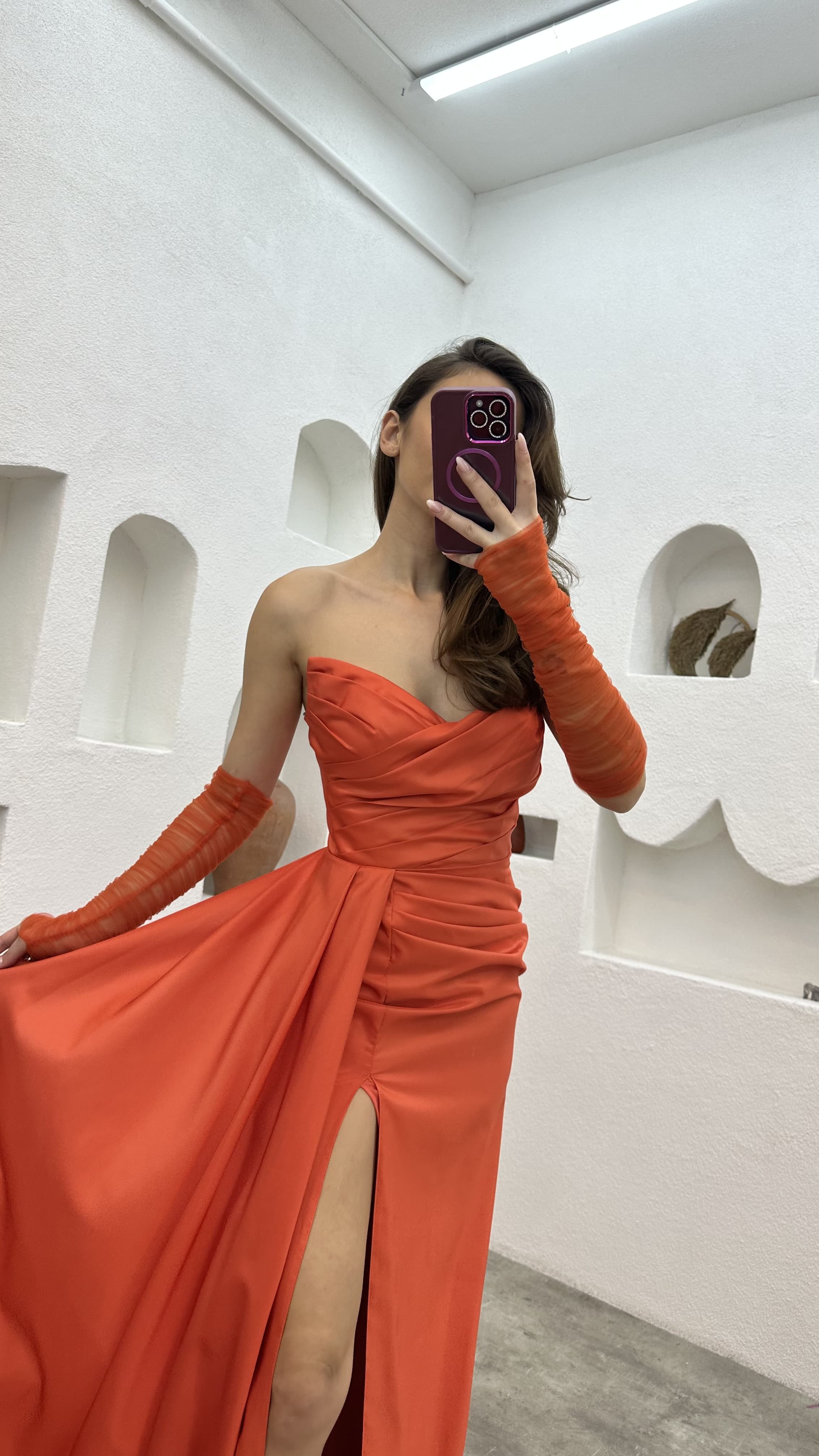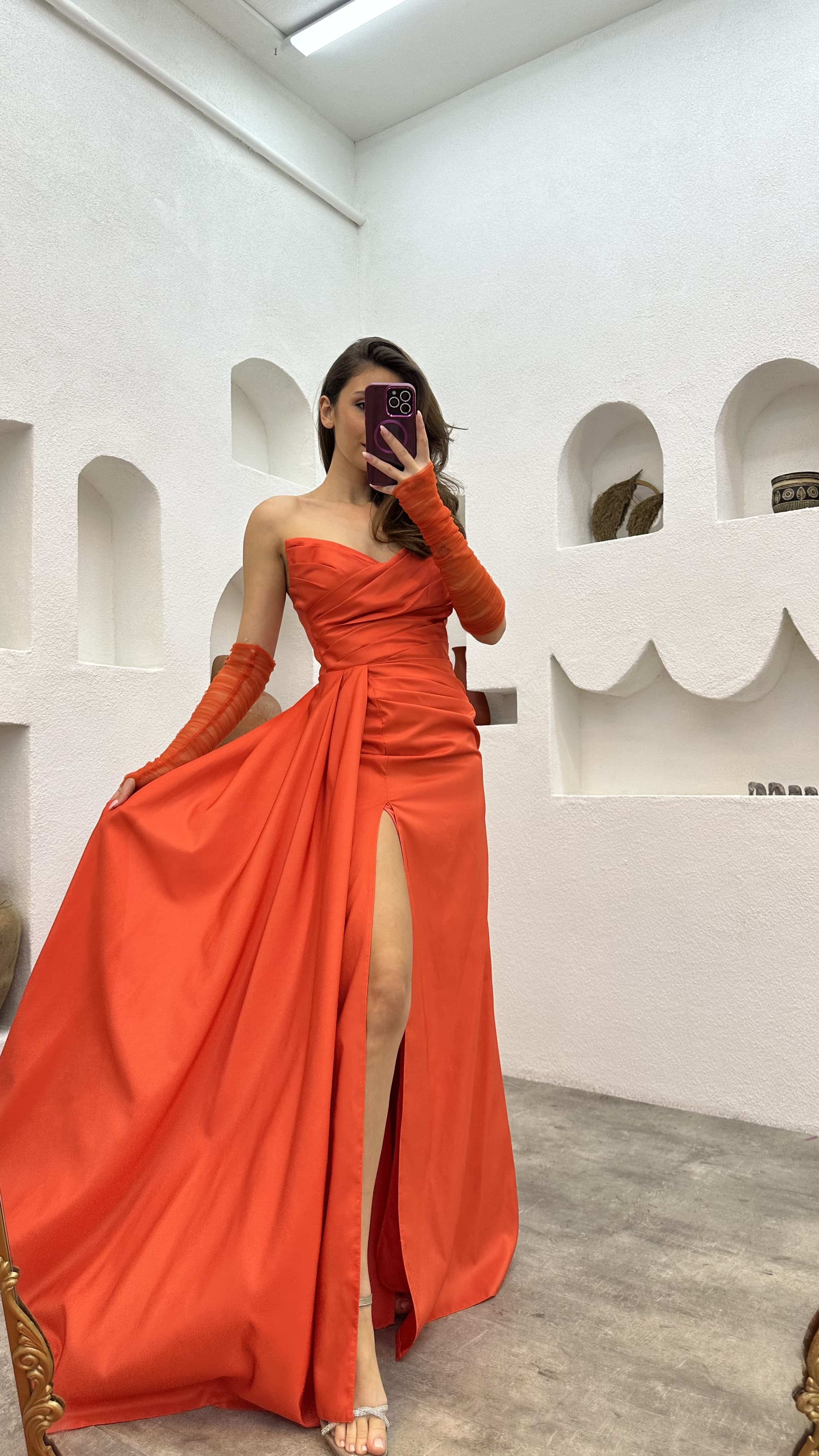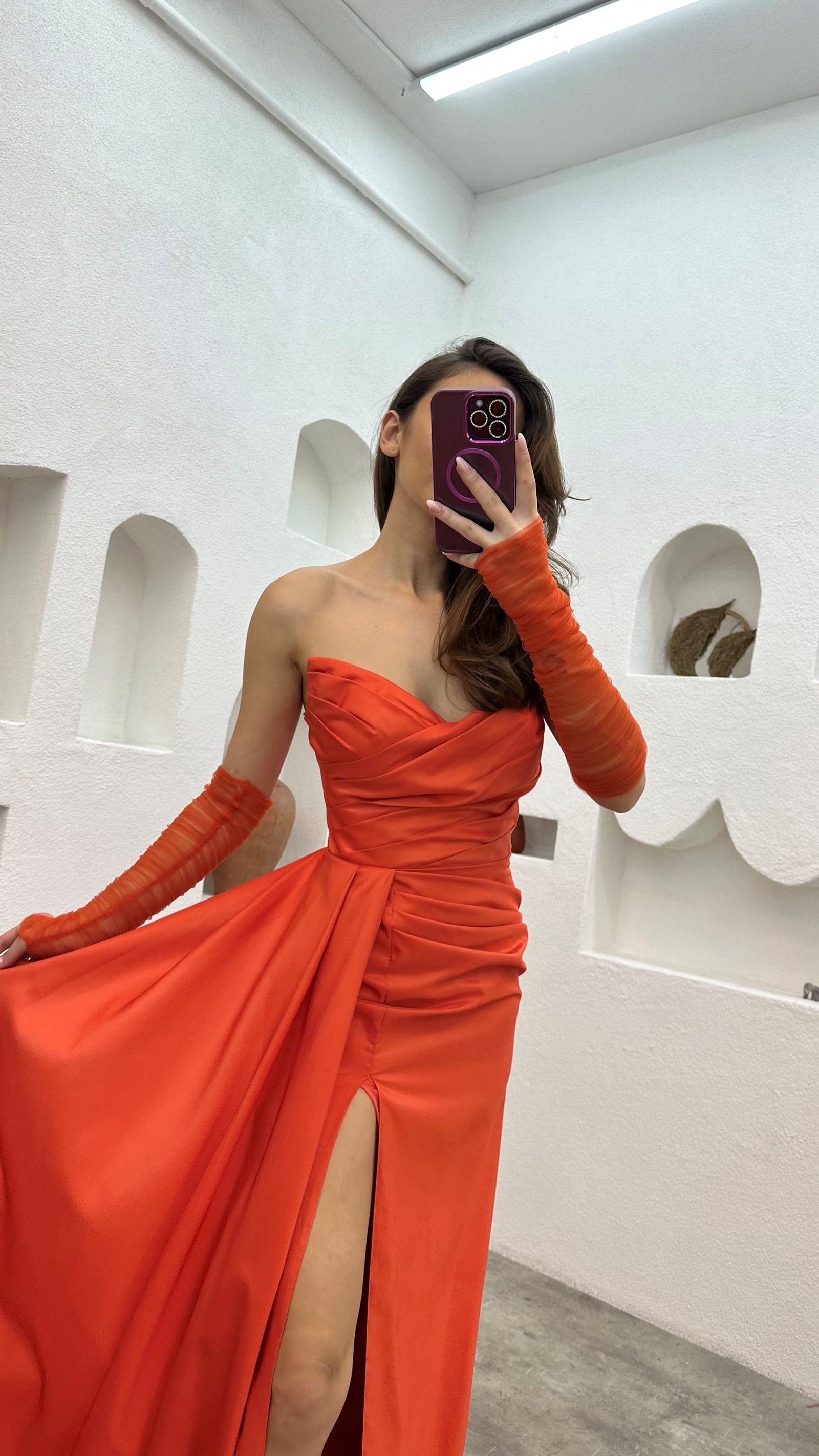 • Turuncu Kol Detay Drapeli Straplez Saten Abiye Elbise