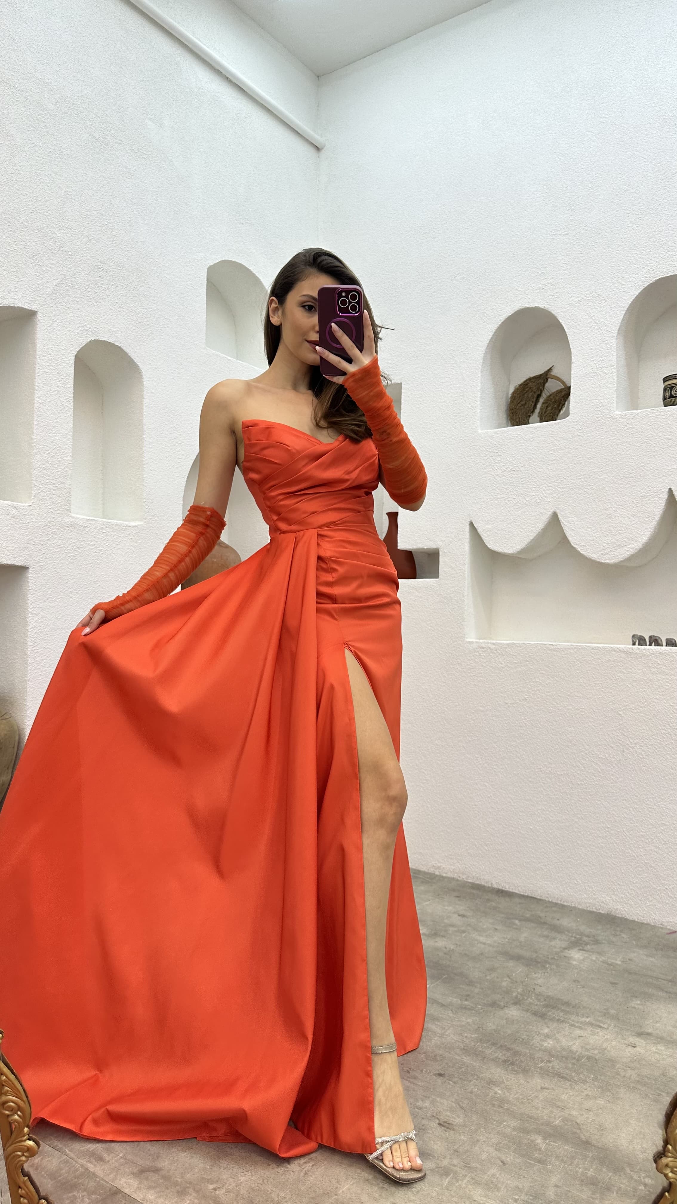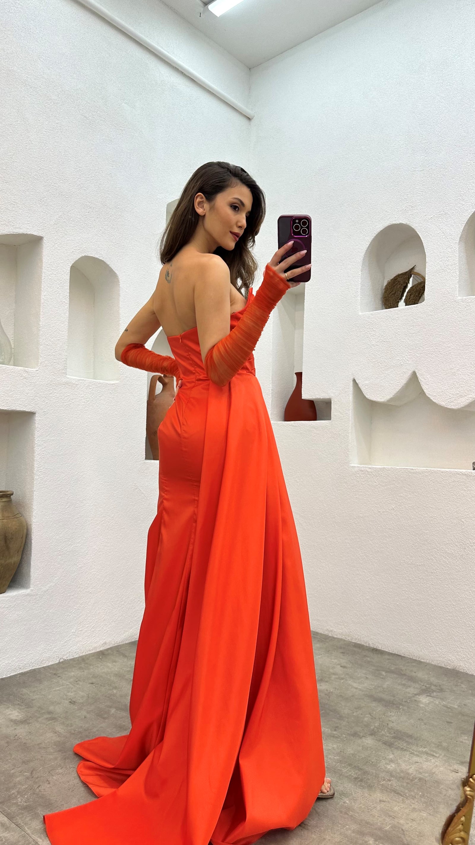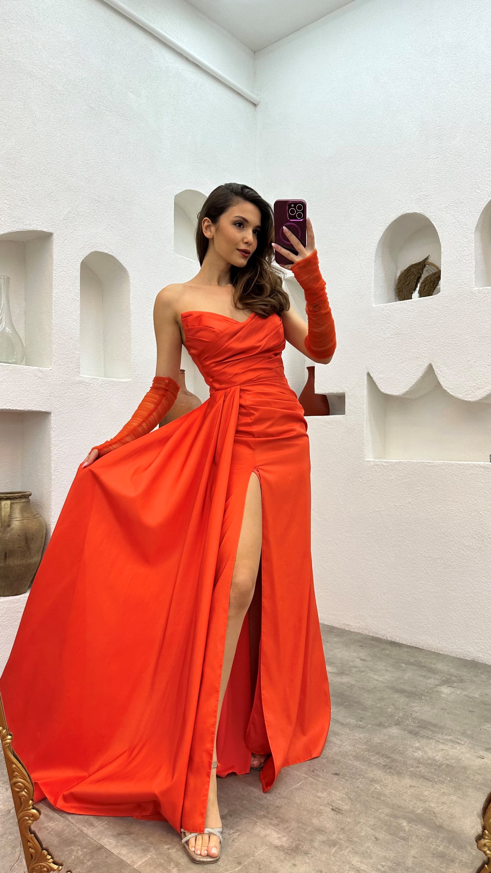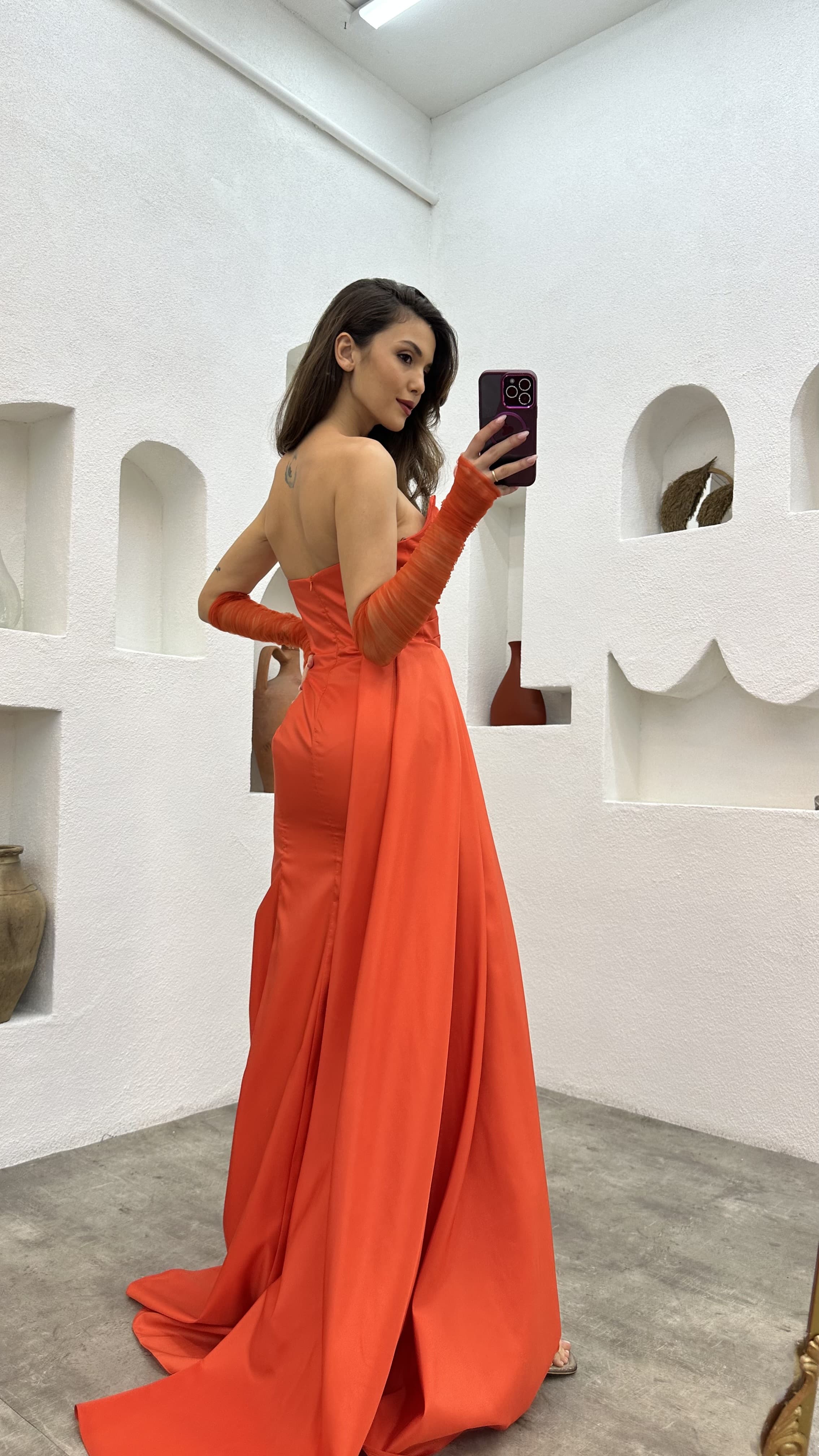• Turuncu Kol Detay Drapeli Straplez Saten Abiye Elbise