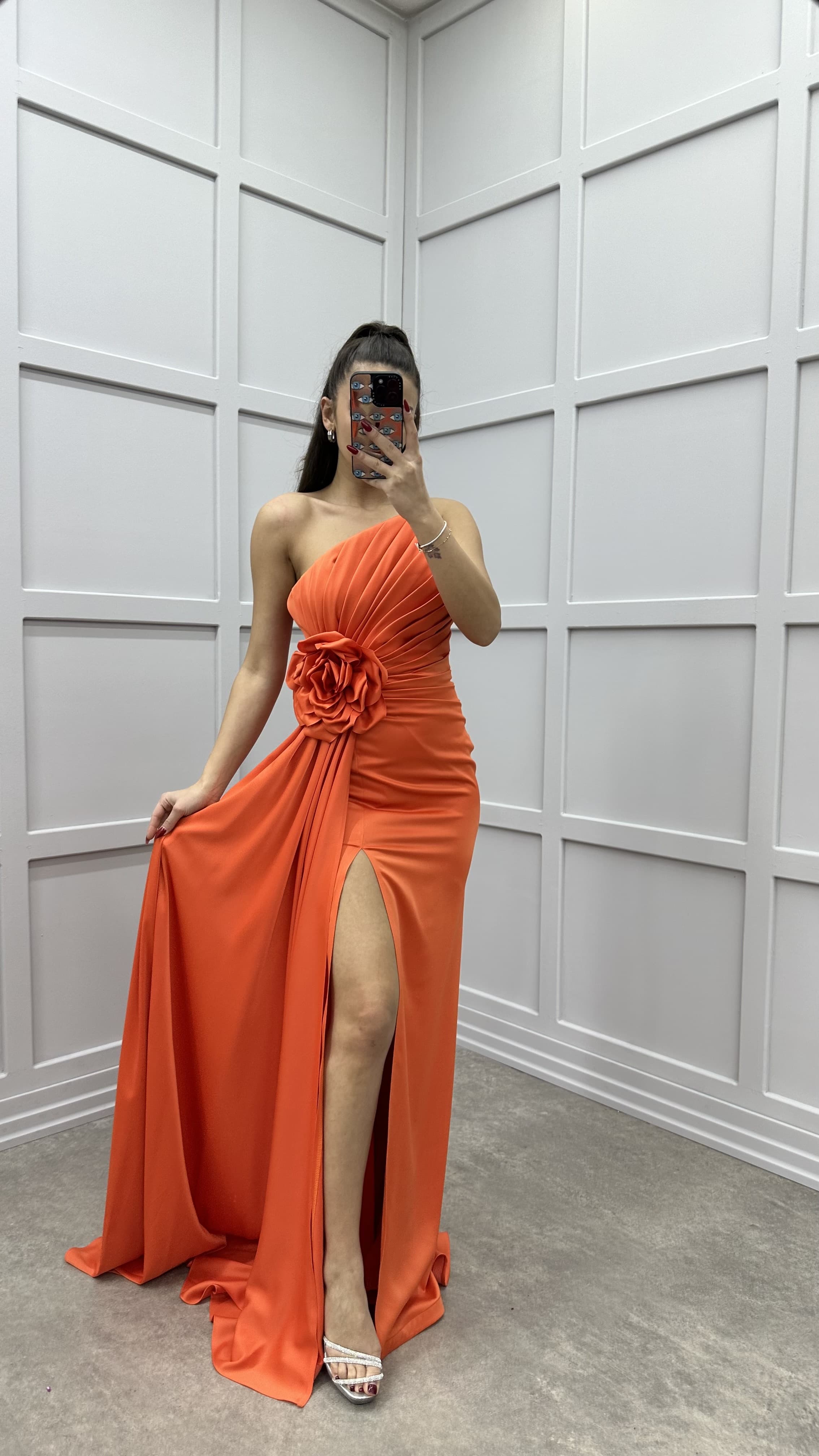 • Turuncu Straplez Gül Detay Tasarım Saten Abiye Elbise