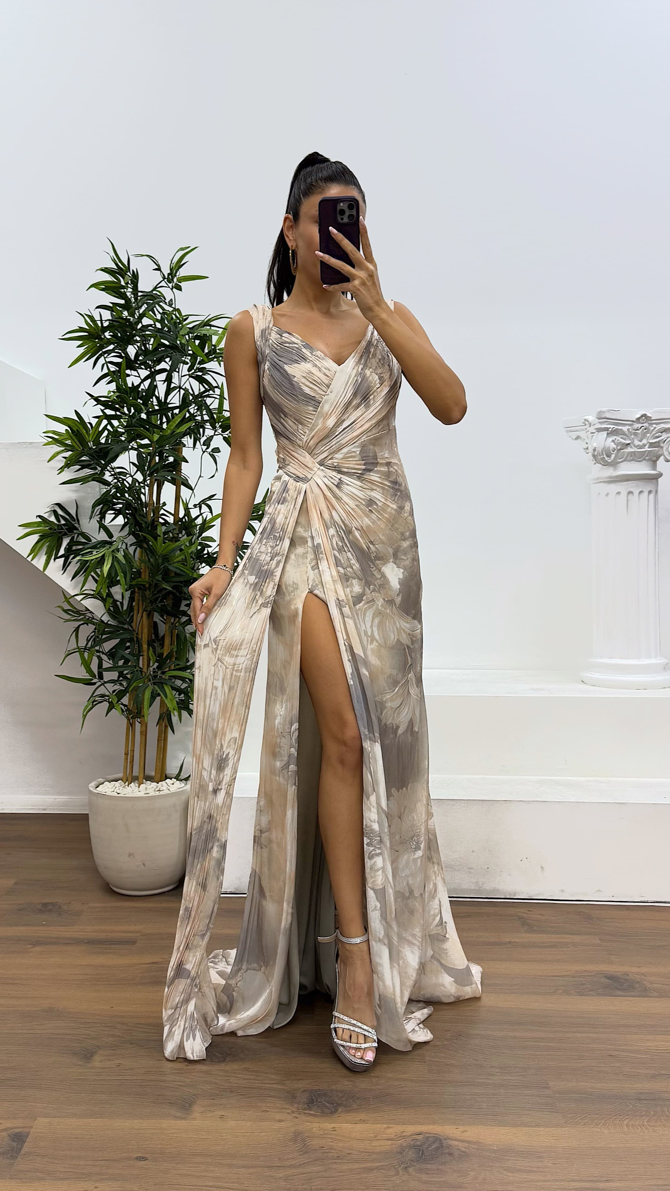 Strappy patterned evening dress The product fits sizes 36 to 44, features padded cups, is lined, has a back zipper closure, and is designed with a slit. Product length: May vary between 170–175 cm. Fabric type: Chiffon – 66% viscose, 34% polyester