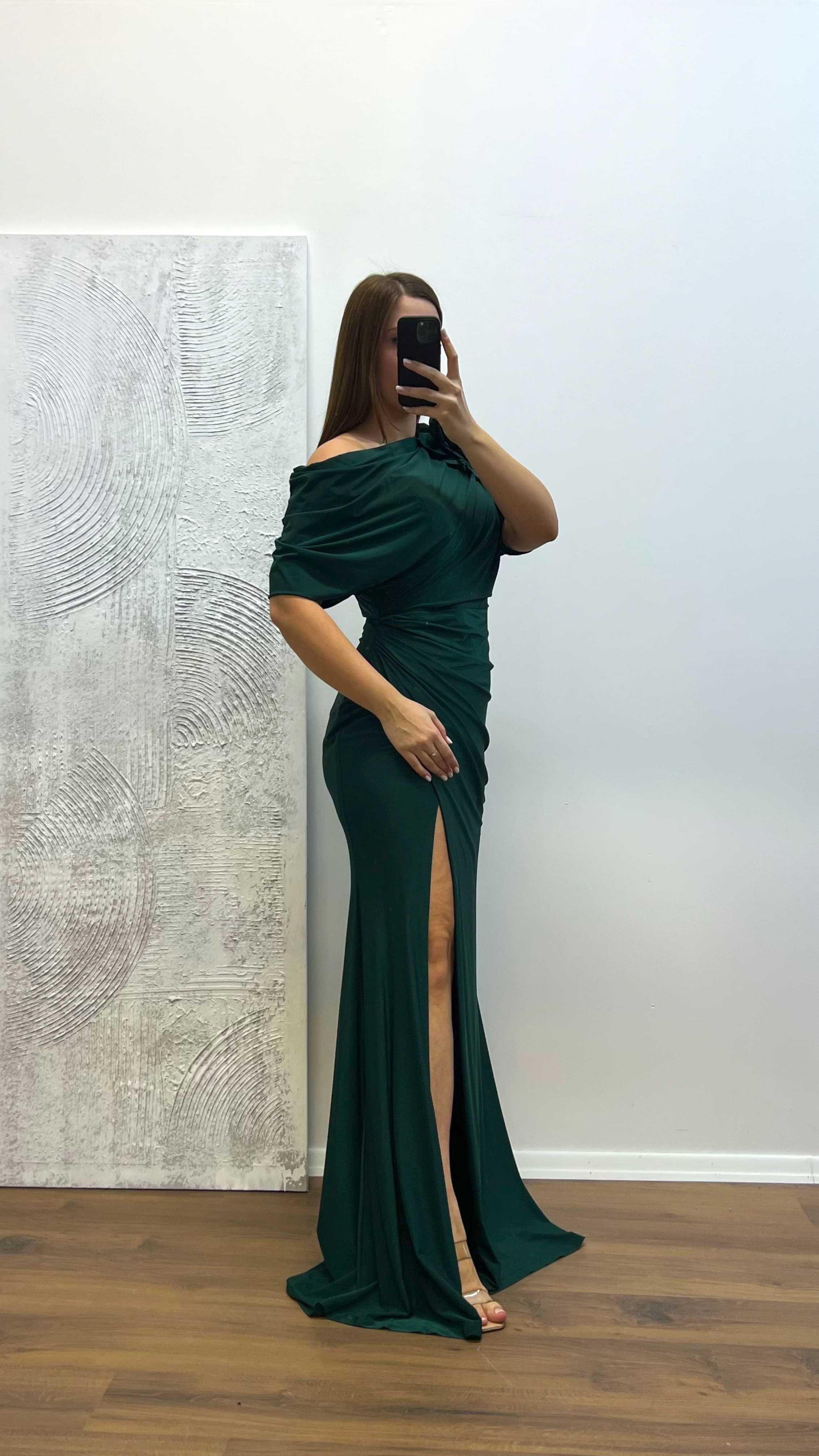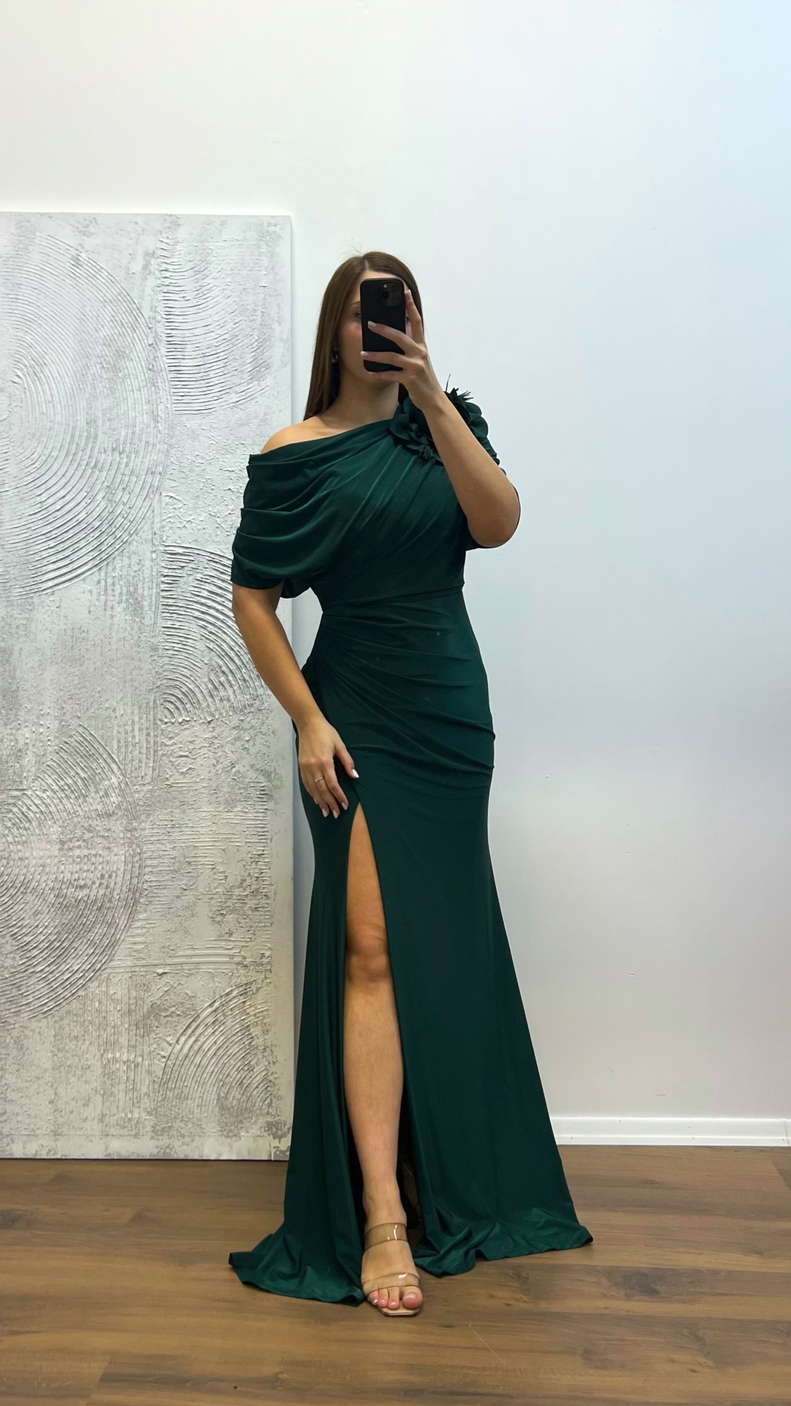 The product is designed as a flower-detailed evening dress, compatible with sizes 44-50, featuring built-in bust padding, lining, back zipper closure, and a slit. Product length may vary between 165-170 cm. Fabric type: Jersey Lycra, Polyester