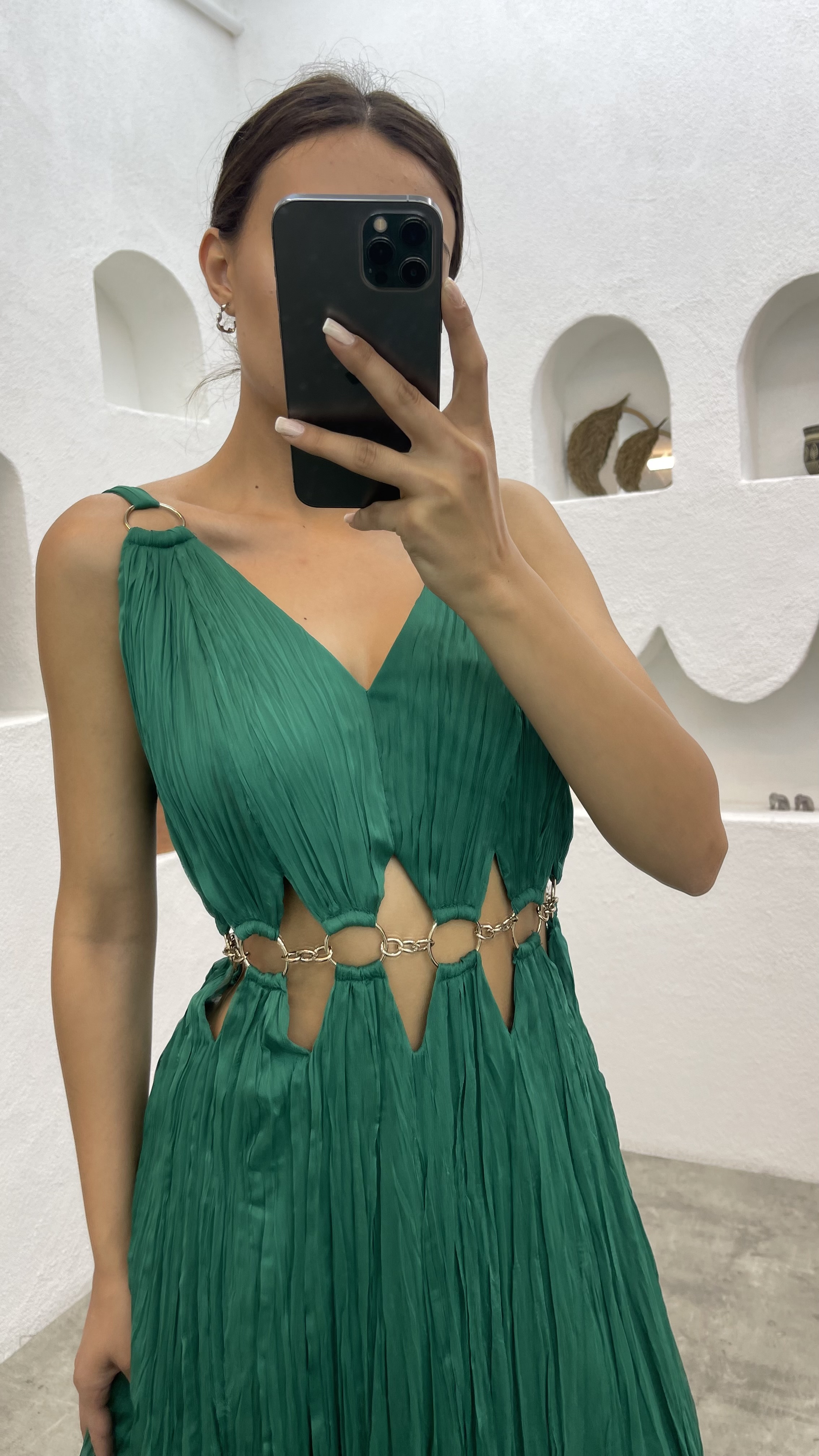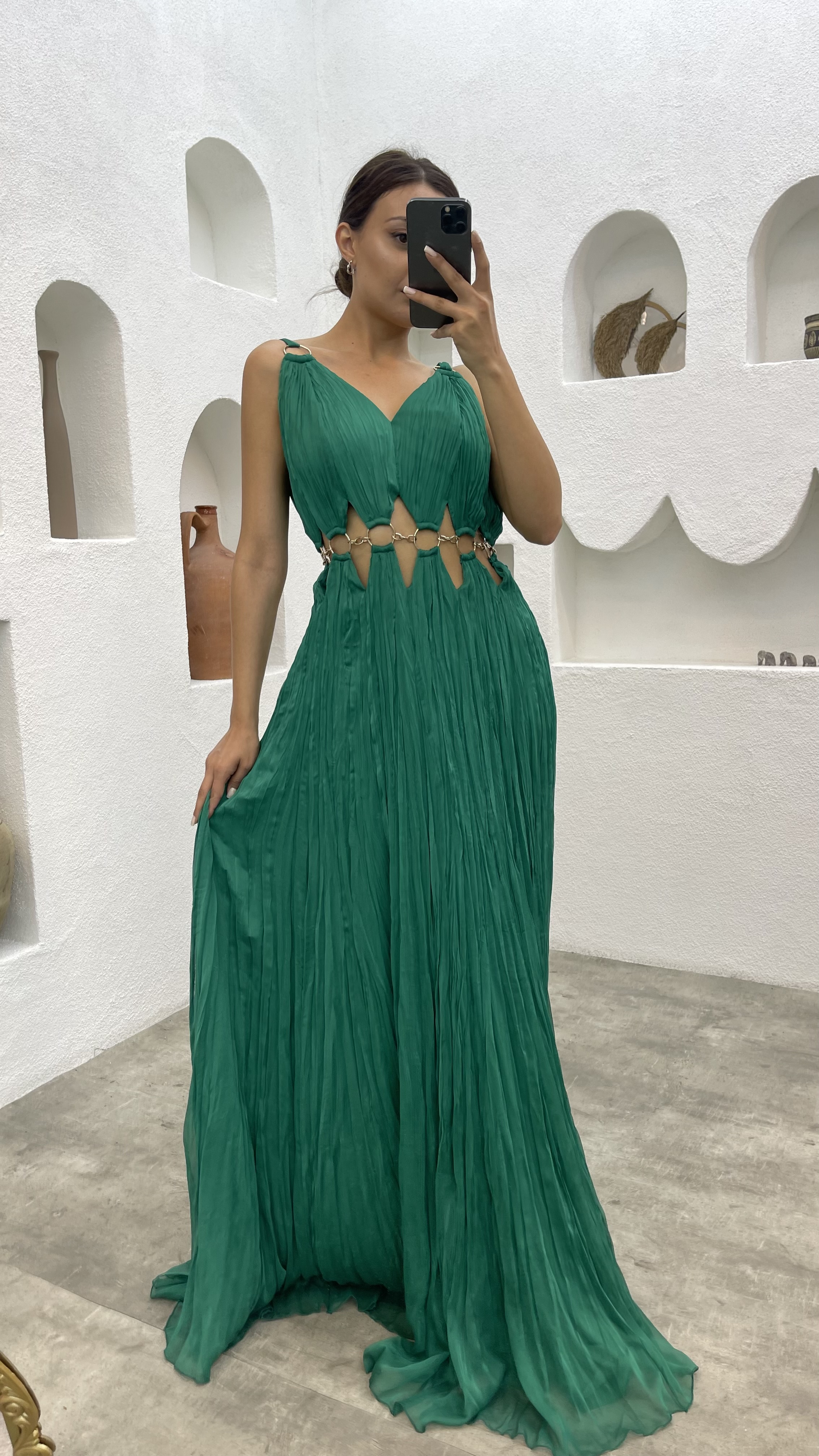 • Zümrüt Pliseli Zincirli Abiye Elbise