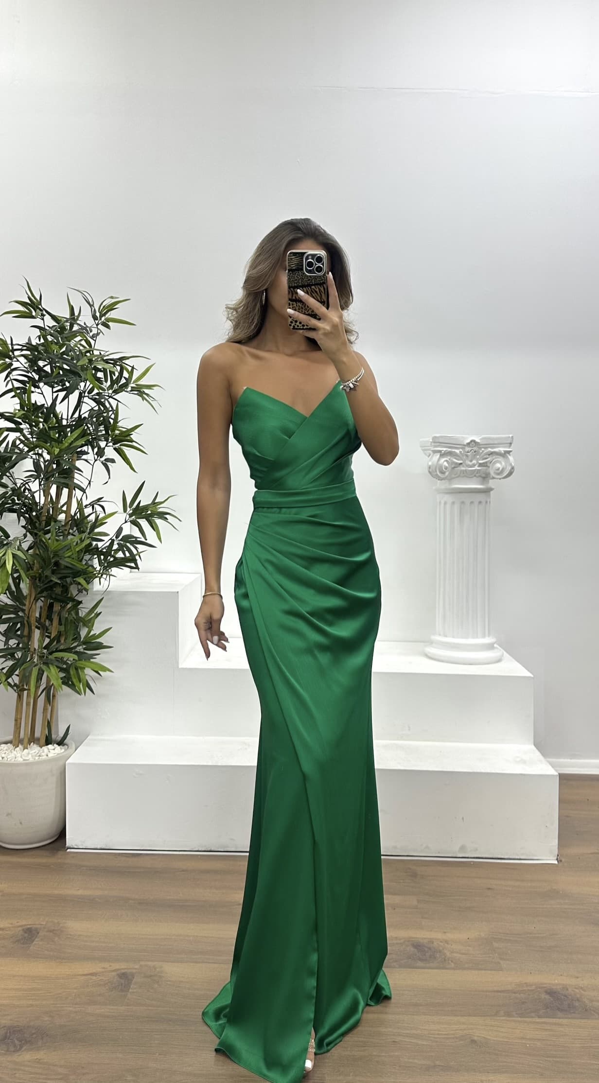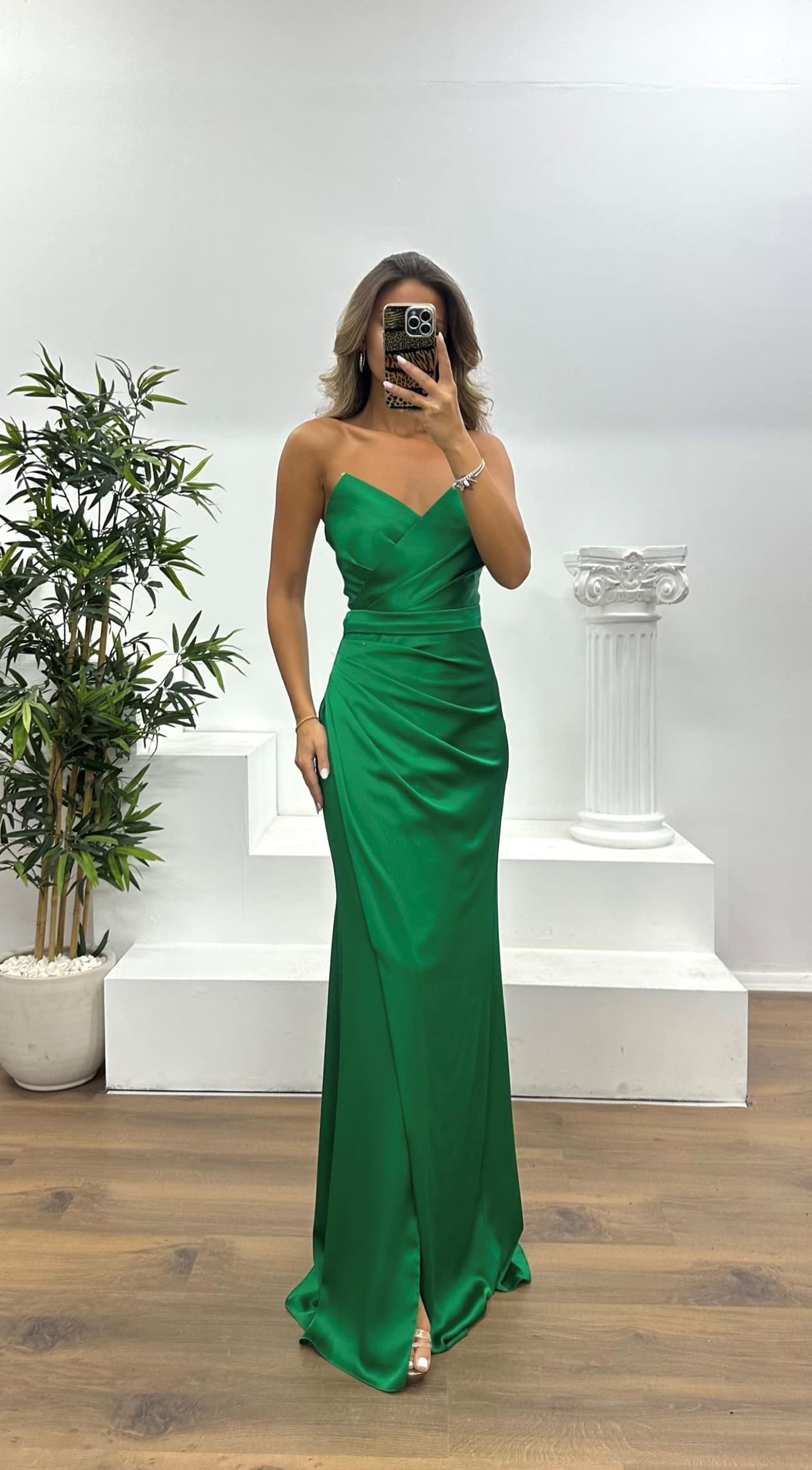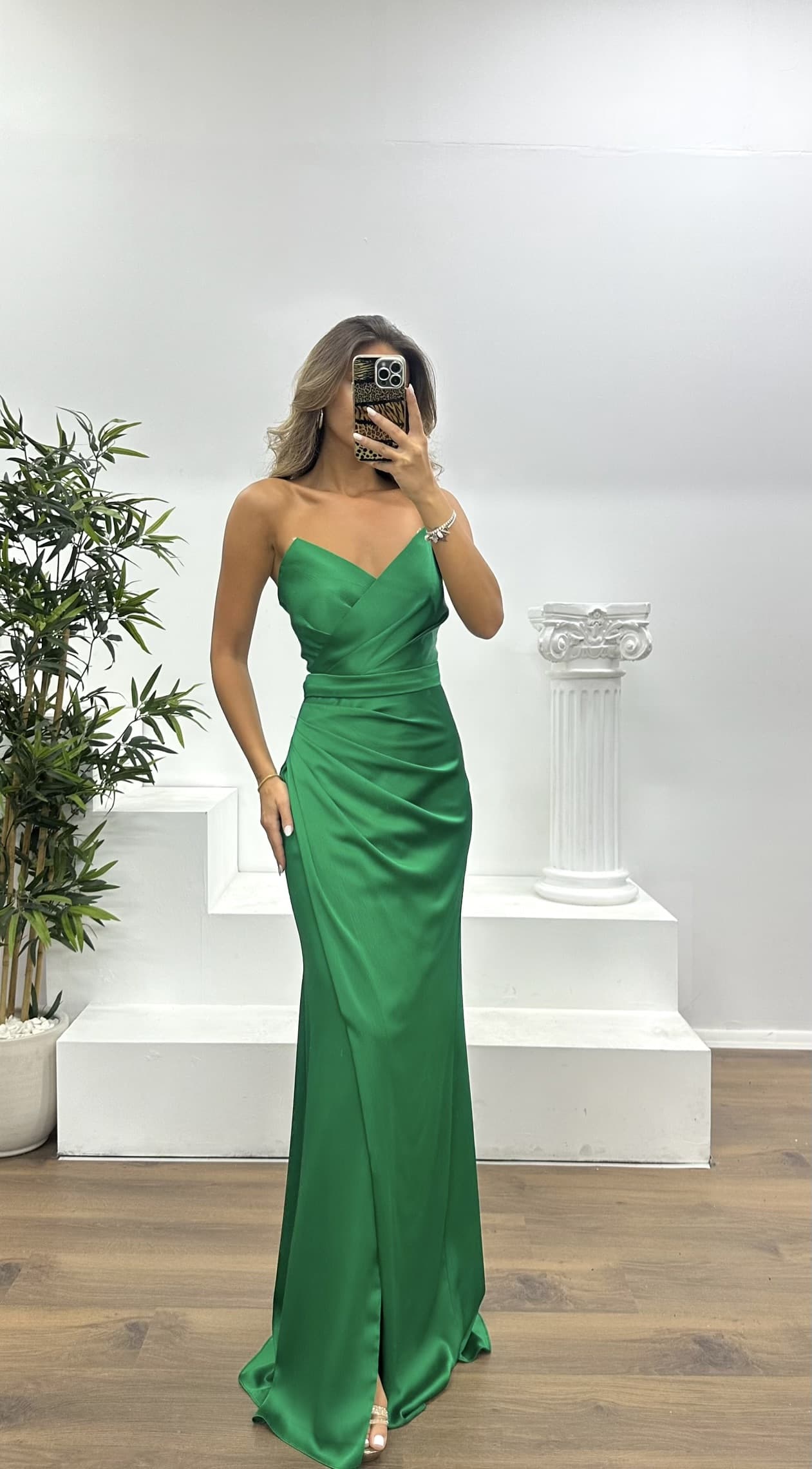 • Zümrüt Straplez Drapeli Abiye Elbise