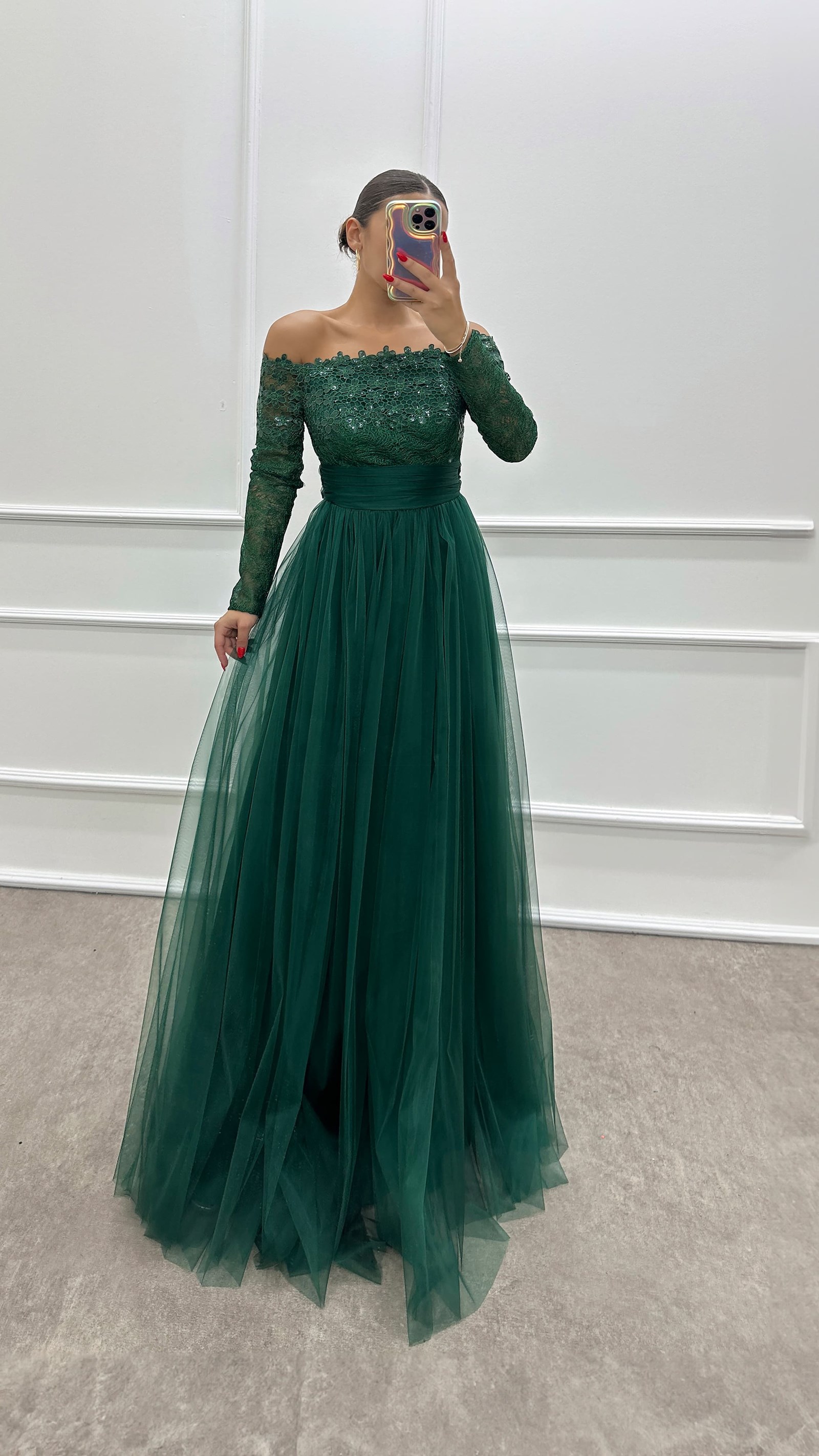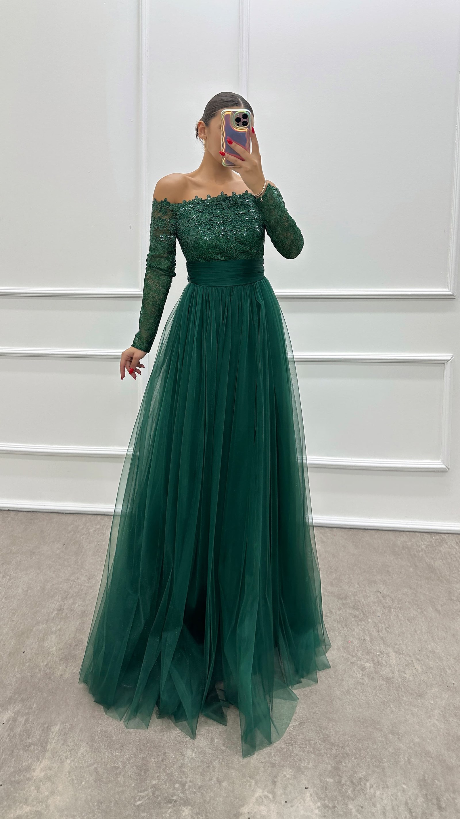 • Zümrüt Yeşili Göğsü İşleme Detay Tasarım Tül Elbise
