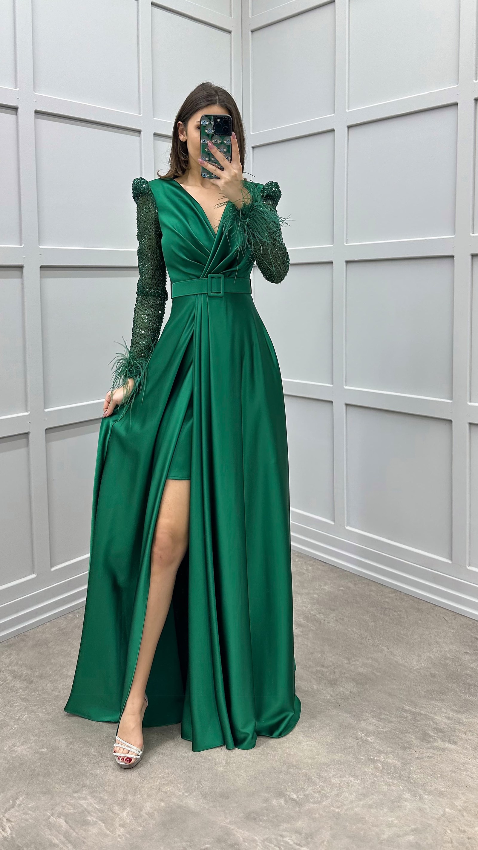• Zümrüt Yeşili Kolları Tüy Kolları İşlemeli Tasarım Saten Abiye Elbise