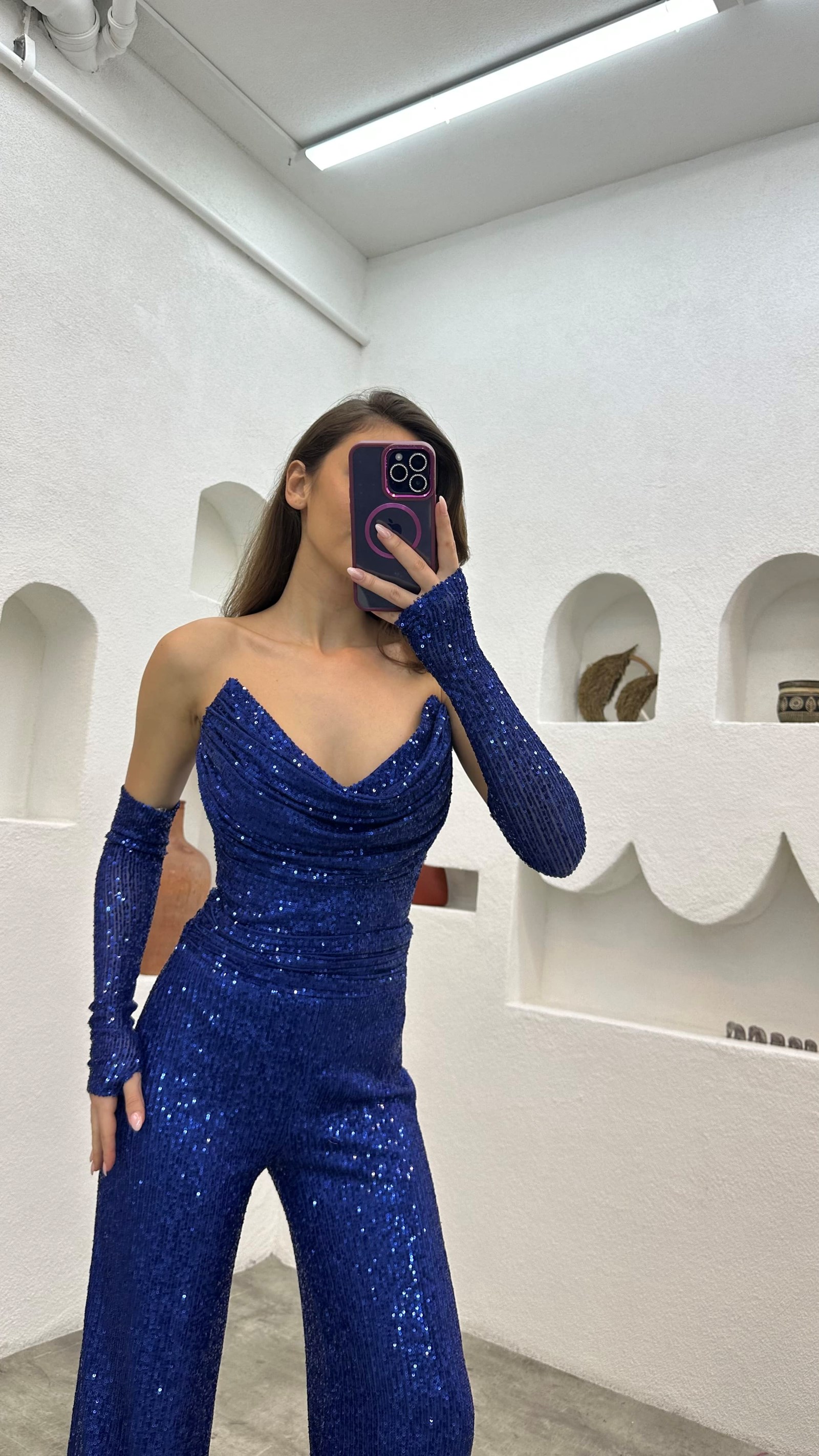 • Lacivert Straplez Kol Detay Pul Payet Tulum