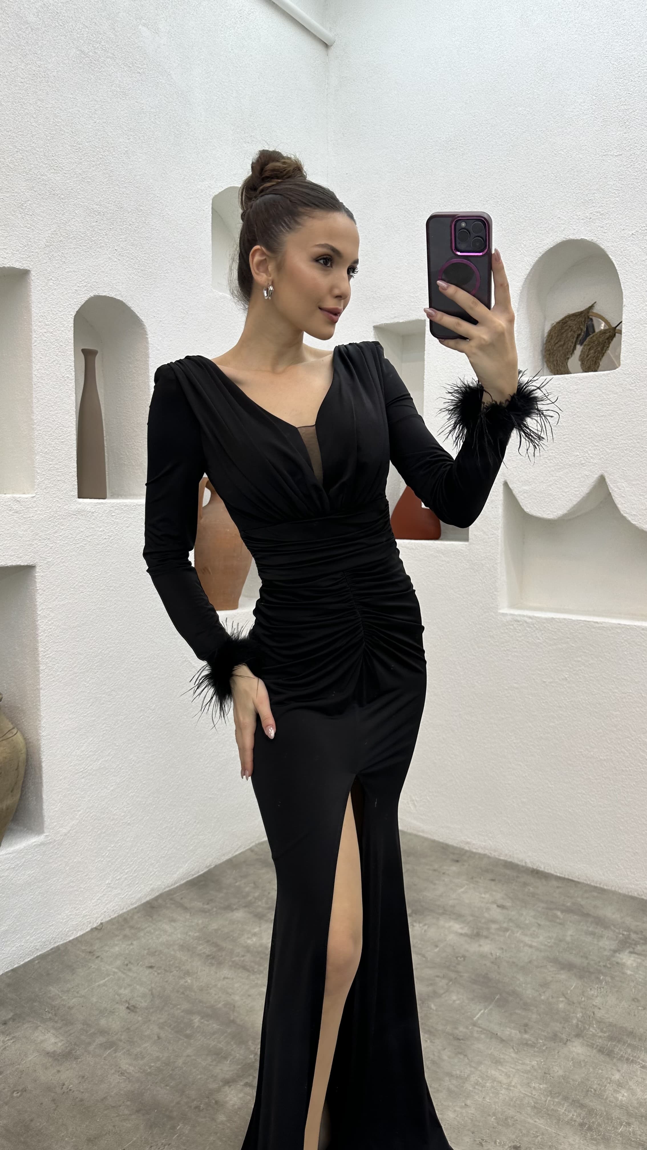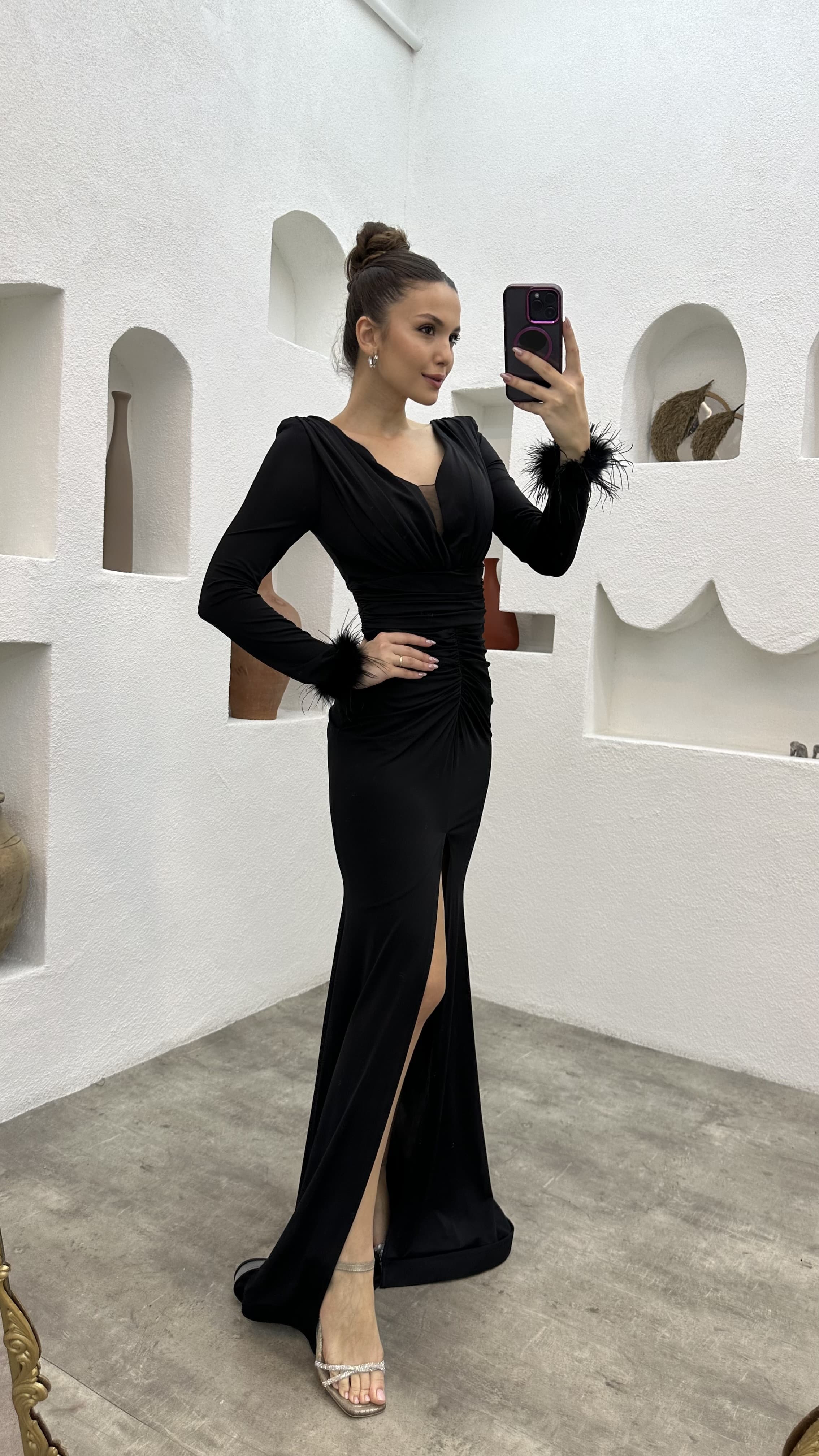 • Siyah Kolları Tüy Detay Drapeli Abiye Elbise