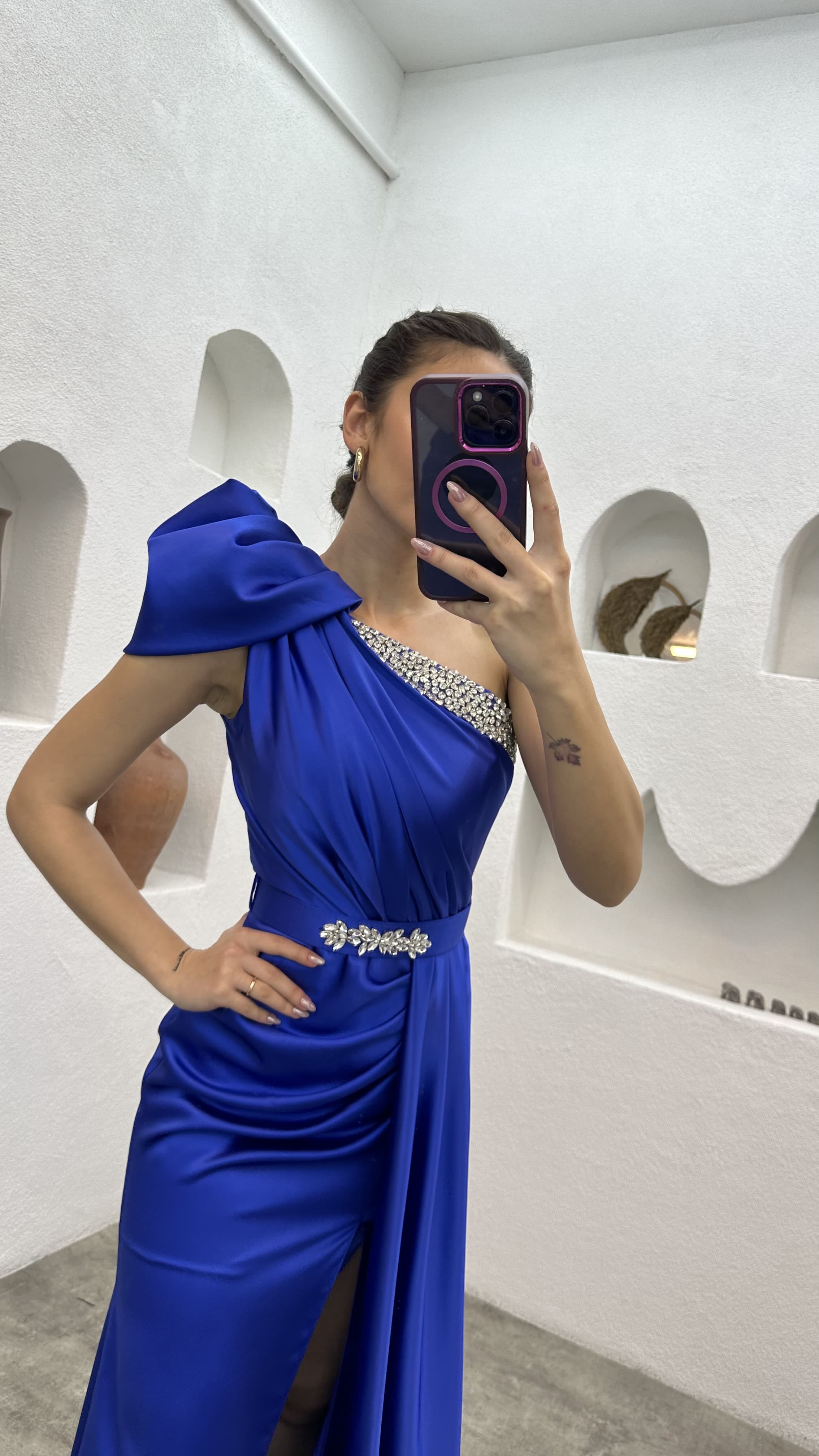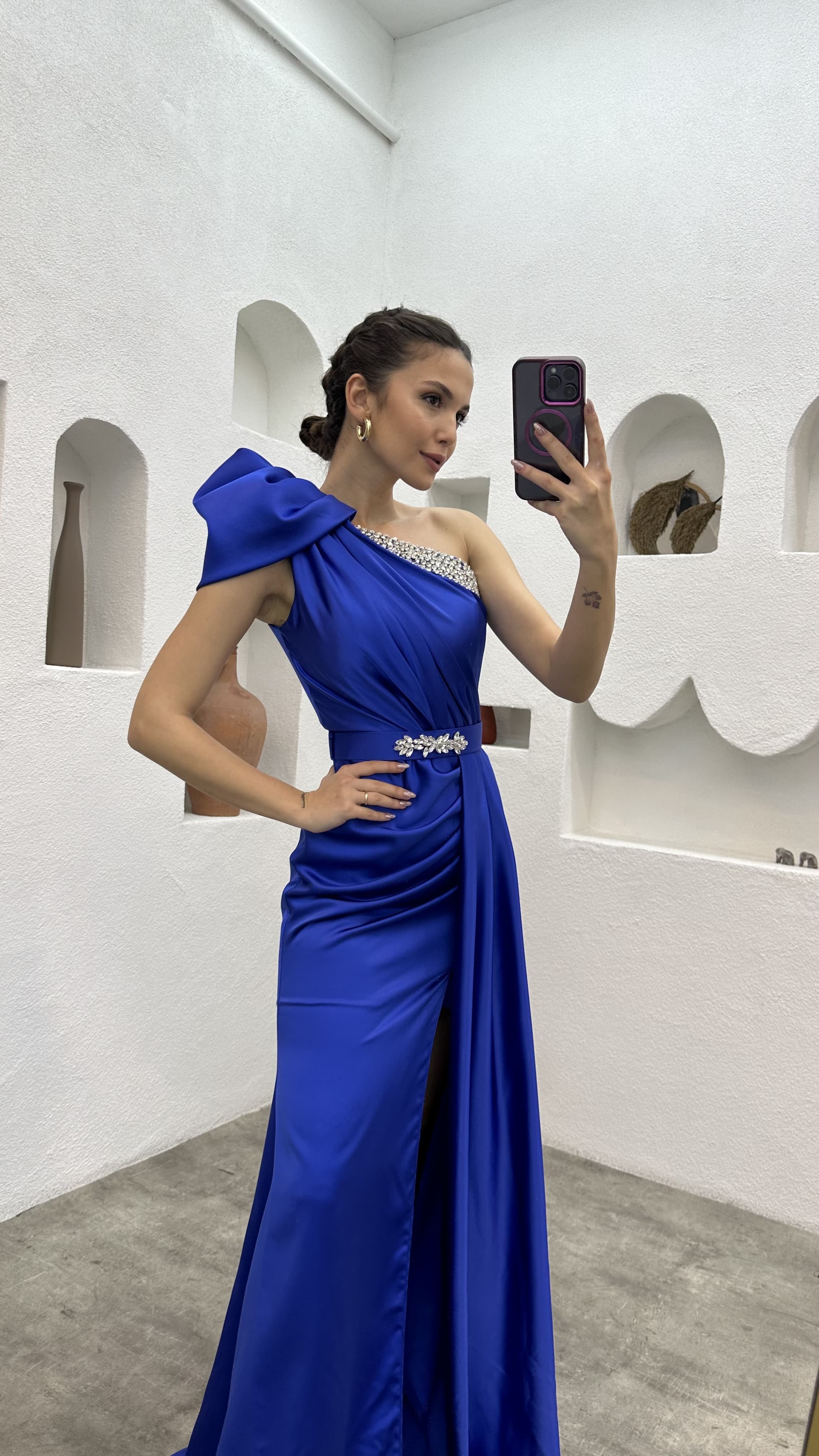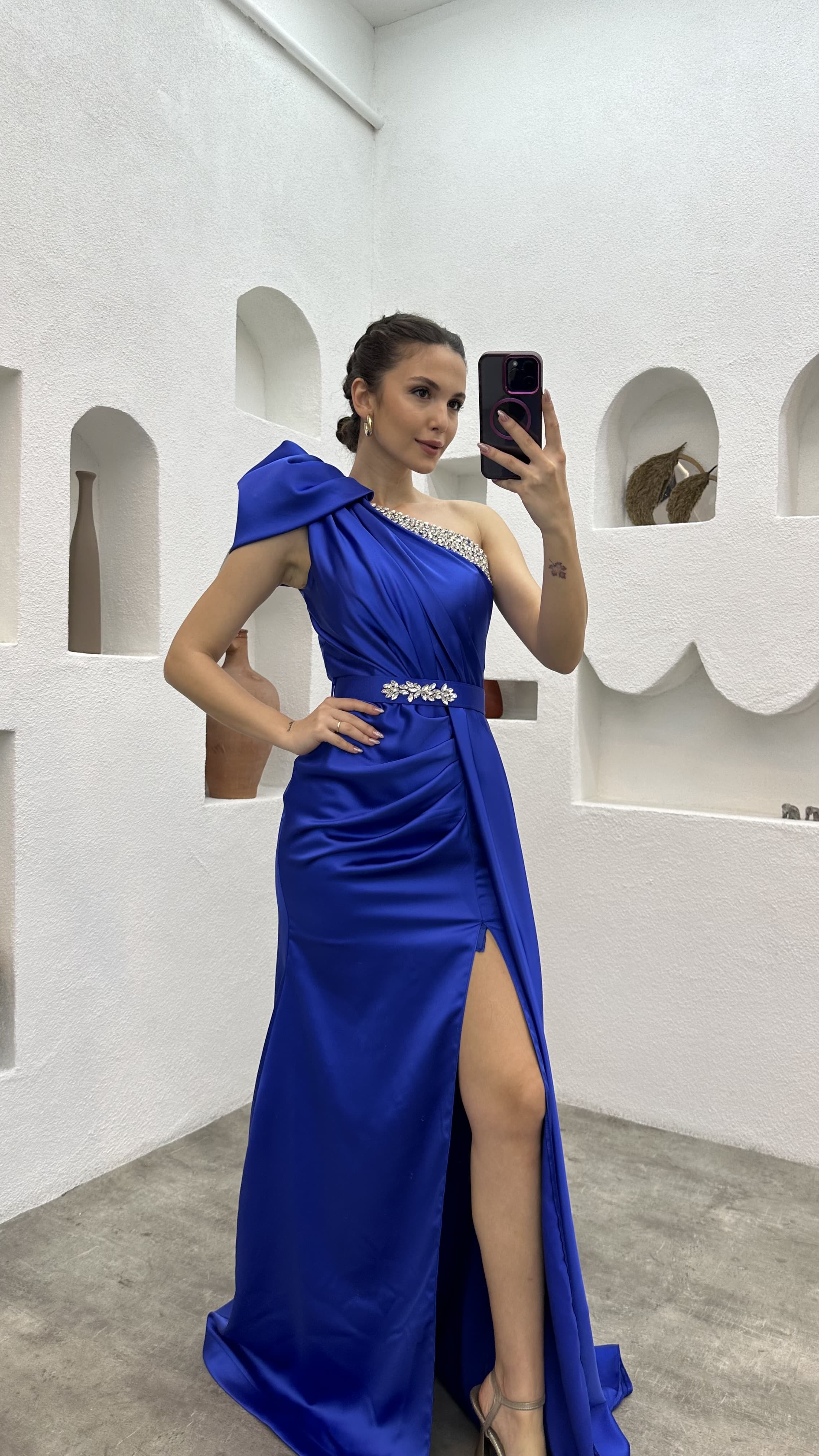 • Saks Tek Omuz Taş İşlemeli Abiye Elbise